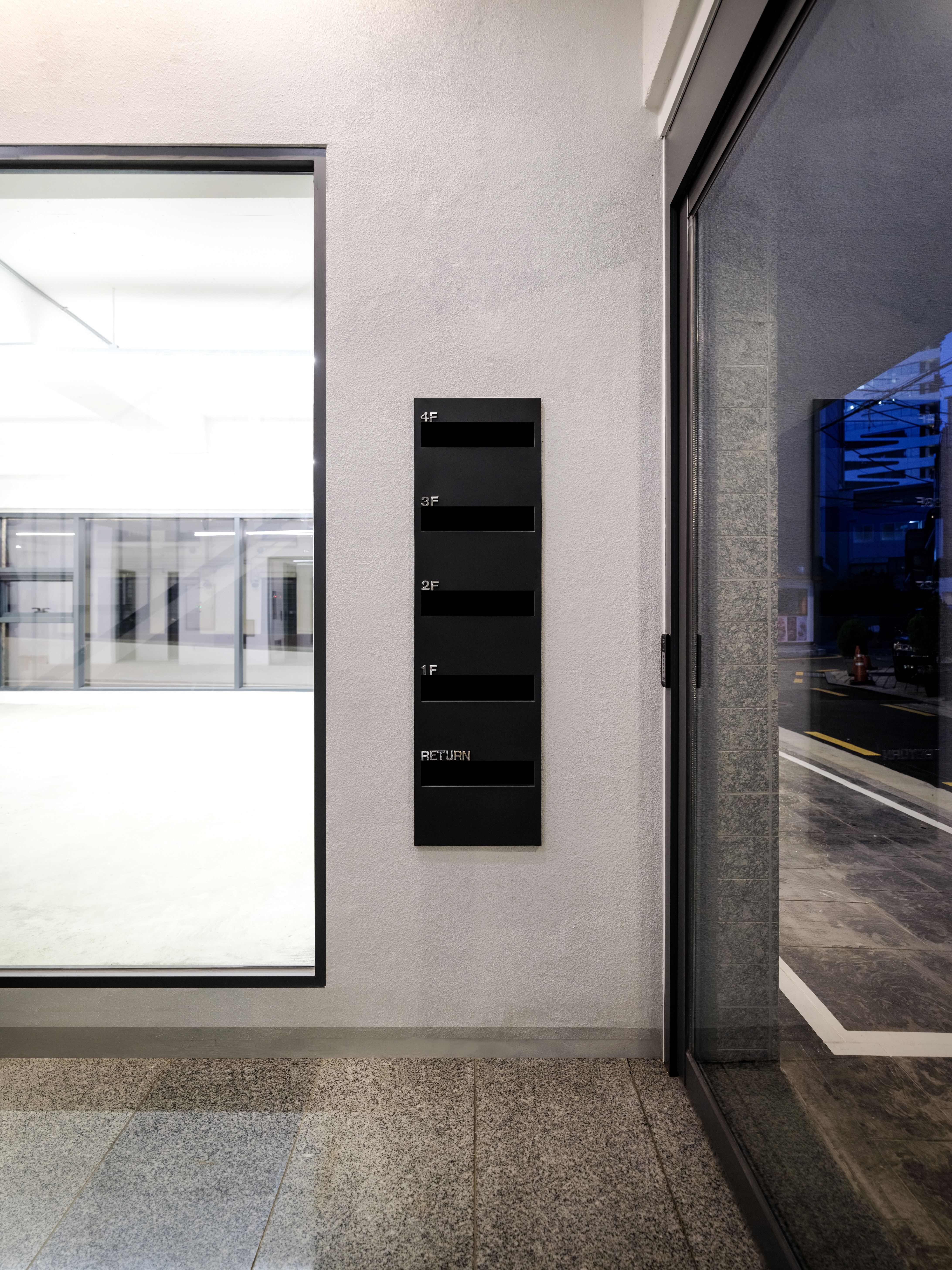 입면 분절은 층별 면적 변화에 맞춰 점증적 논리로 설계되었다. 수평선을 나누는 후레싱에 깊이를 주어 빛이 만든 그림자가 시간에 따라 변주되도록 했고, 동일한 석재를 버너구이와 연마 방식으로 교차 적용해 작은 건물이 가질 수 있는 단조로움을 섬세한 리듬으로 치환했다. 석재 판재의 홈파기(메지 절삭) 역시 빛의 반사로 미세한 물결감을 만들며 입면의 깊이를 더한다.