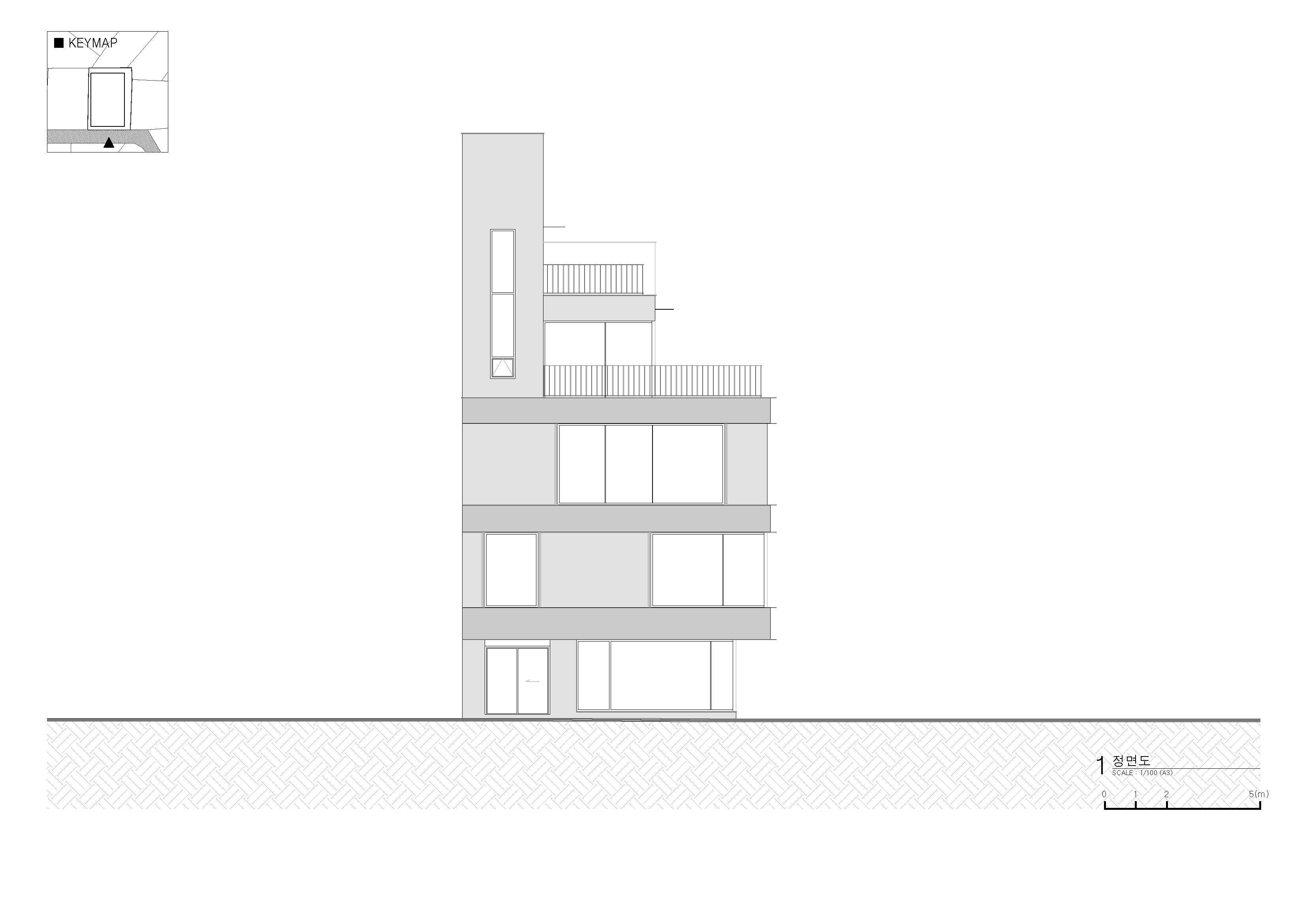 대지는 서울 서초구 반포동, 강남대로 이면도로에 위치한다. 건축가는 이곳에서 수명이 다한 다세대 주택을 철거하고 근린생활시설로 재건하는 프로젝트를 맡았다. 적벽돌 주택이 반복되는 단조로운 골목에 도시적 활력을 불어넣기 위해, 건축가는 밝지만 가벼워 보이지 않는 그레이 톤 석재와 열린 개구부를 중심으로 입면을 구성했다.