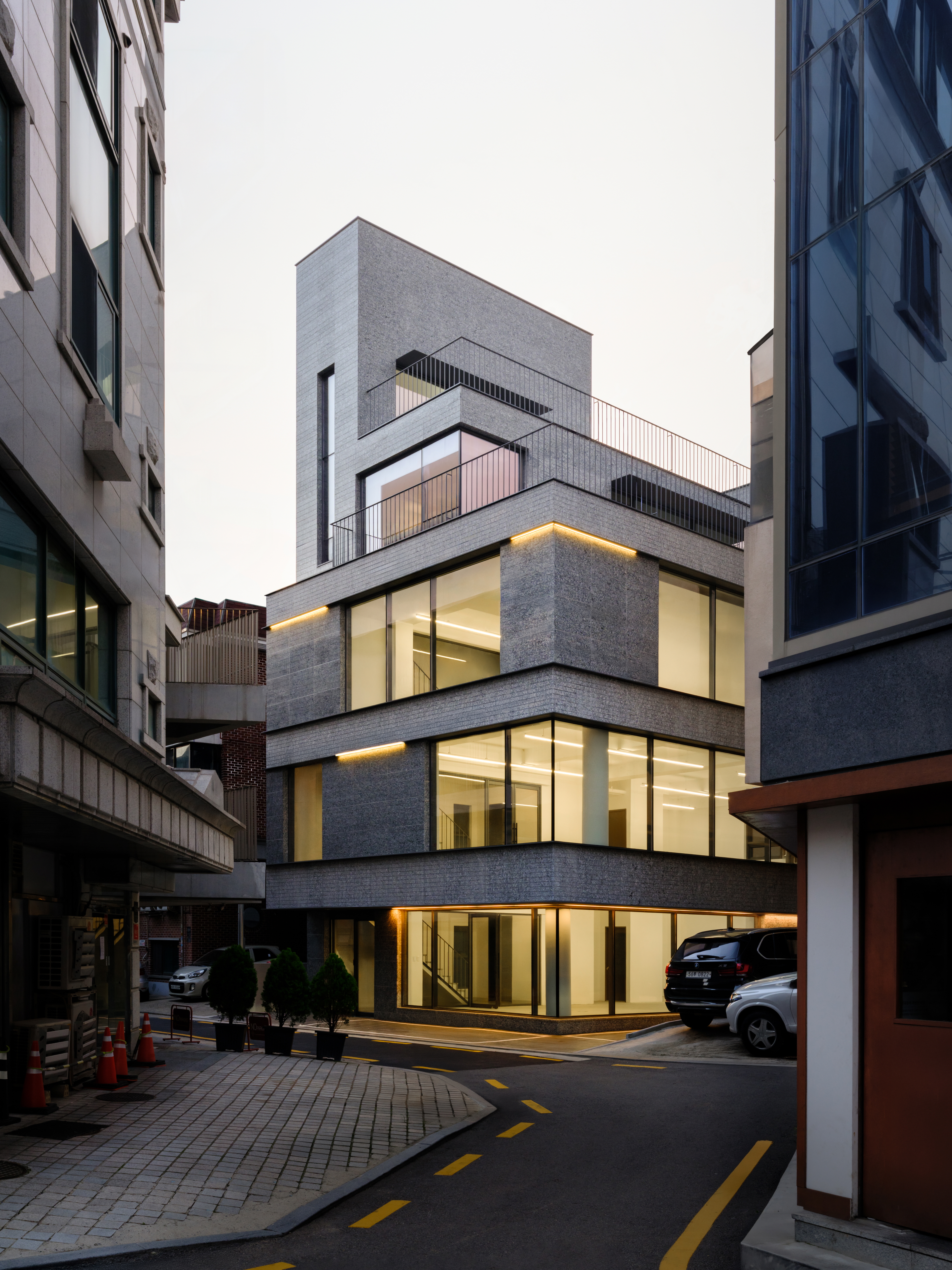 대지는 서울 서초구 반포동, 강남대로 이면도로에 위치한다. 건축가는 이곳에서 수명이 다한 다세대 주택을 철거하고 근린생활시설로 재건하는 프로젝트를 맡았다. 적벽돌 주택이 반복되는 단조로운 골목에 도시적 활력을 불어넣기 위해, 건축가는 밝지만 가벼워 보이지 않는 그레이 톤 석재와 열린 개구부를 중심으로 입면을 구성했다.