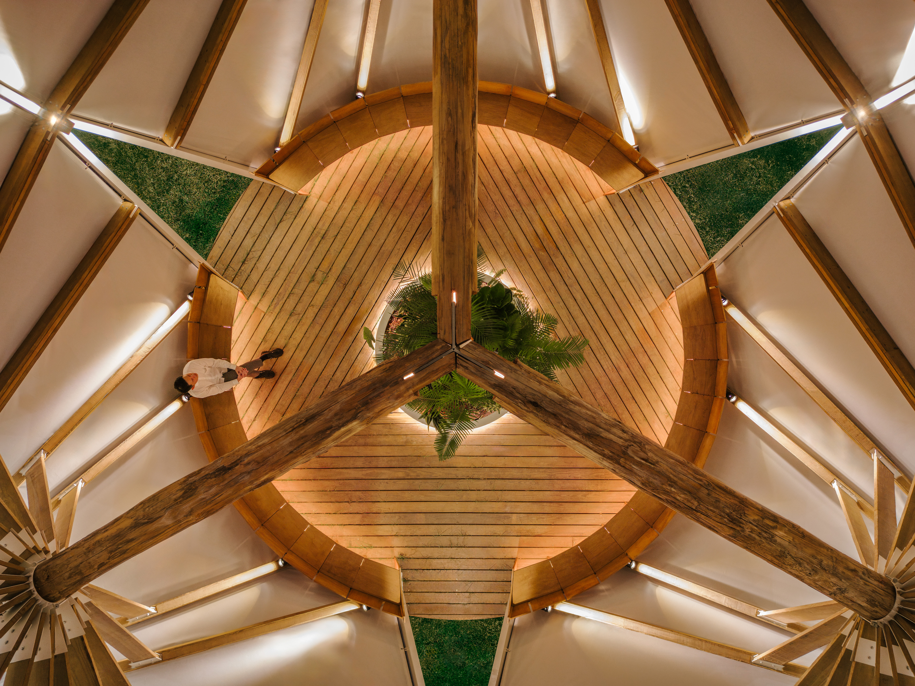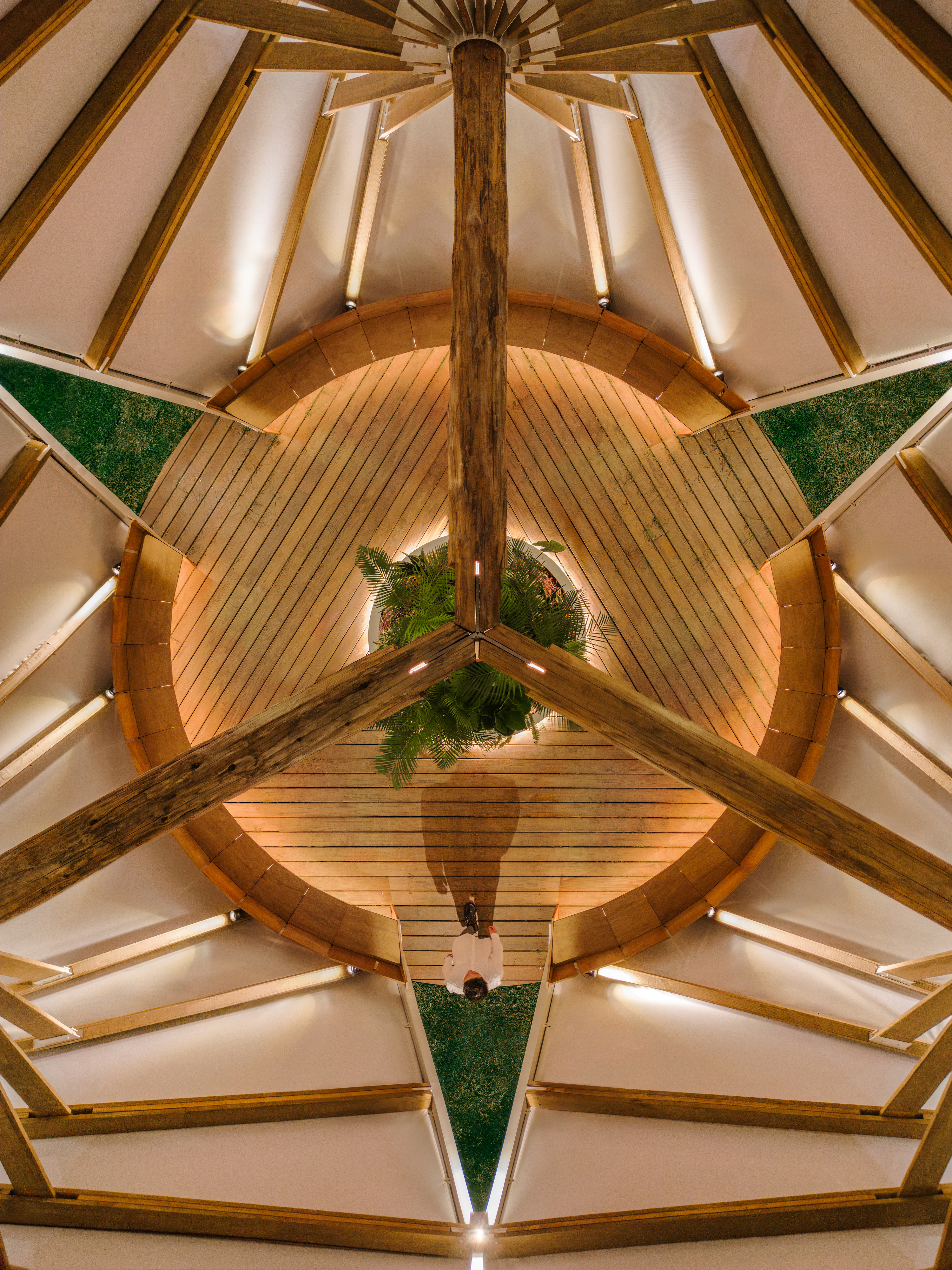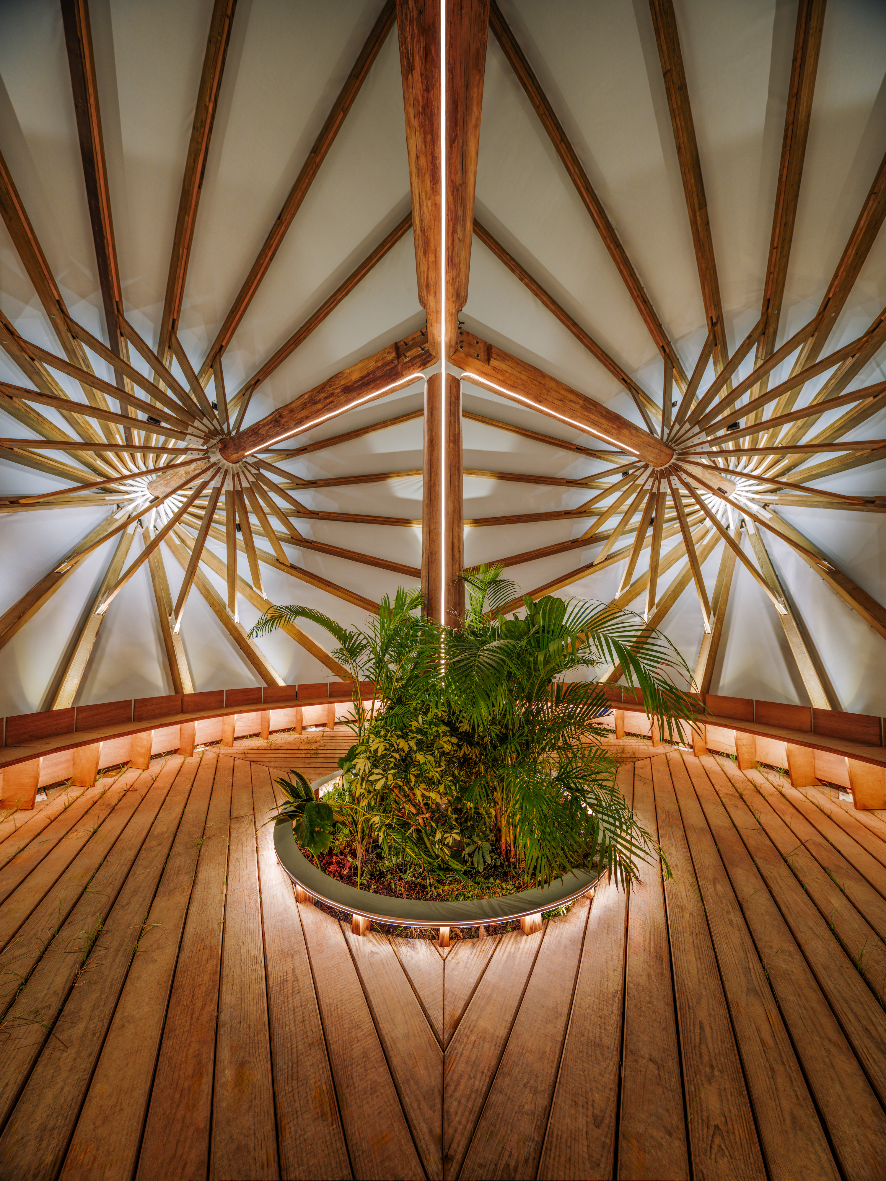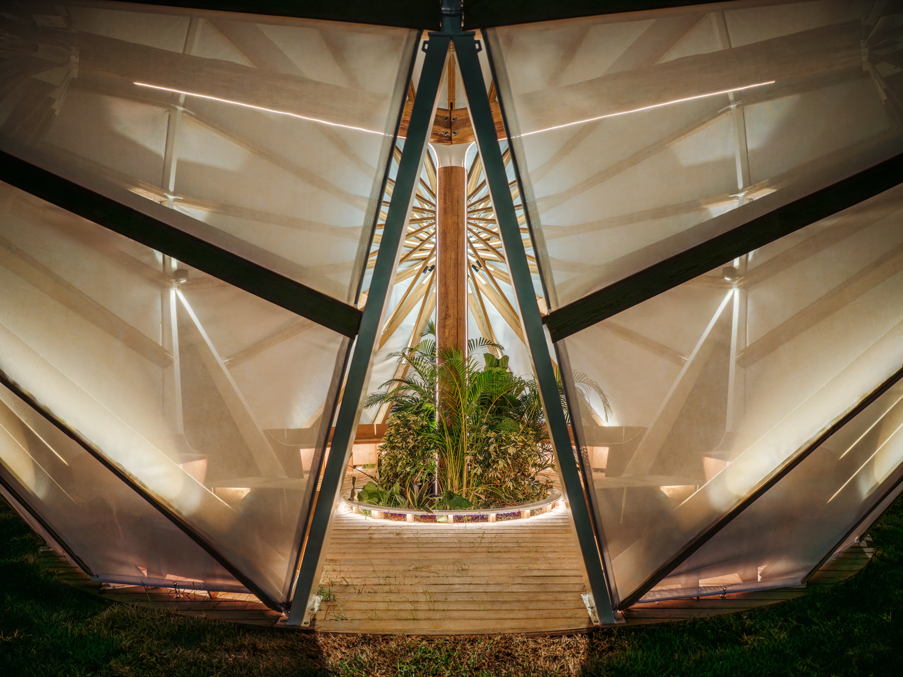 세 개의 캐노피는 중심축을 기준으로 바깥 방향으로 퍼져 나가며 관람자의 시점에 따라 다양한 기하학적 장면을 만들어낸다. 내부에 서면 마치 우주의 어딘가를 부유하는 거대한 비행체 안에 들어온 듯한, 낯설면서도 따뜻하고 고요한 감각이 형성된다.