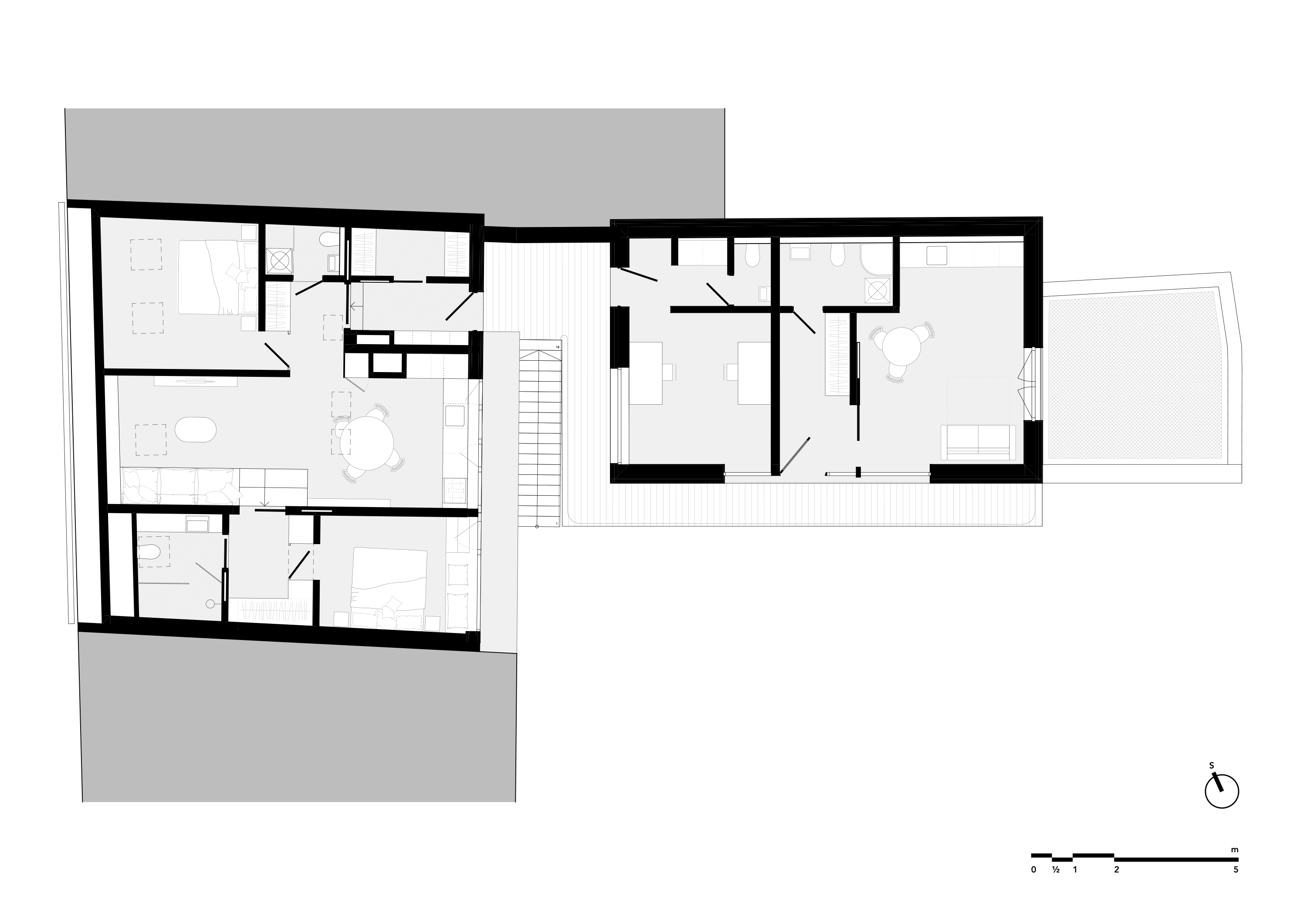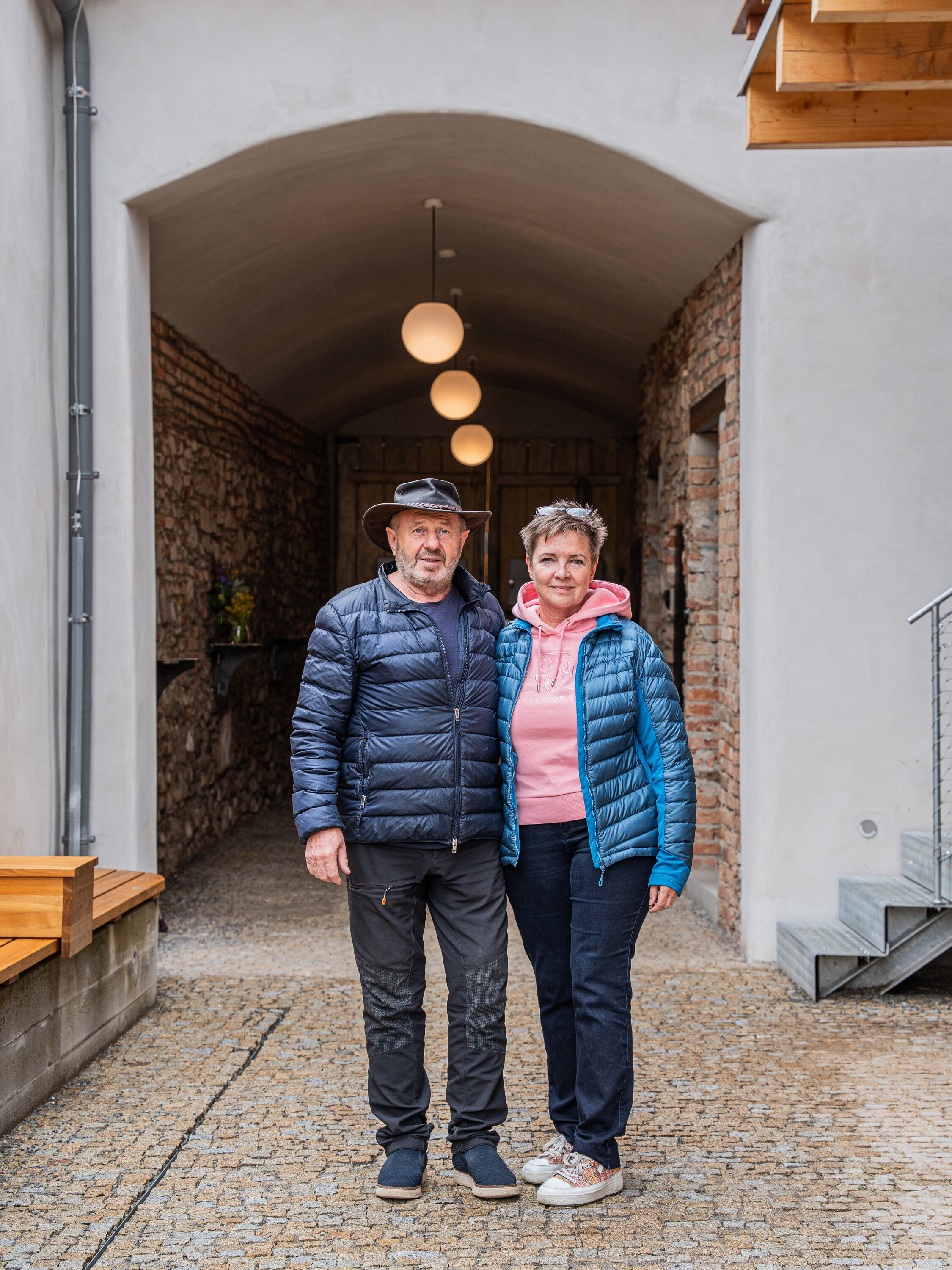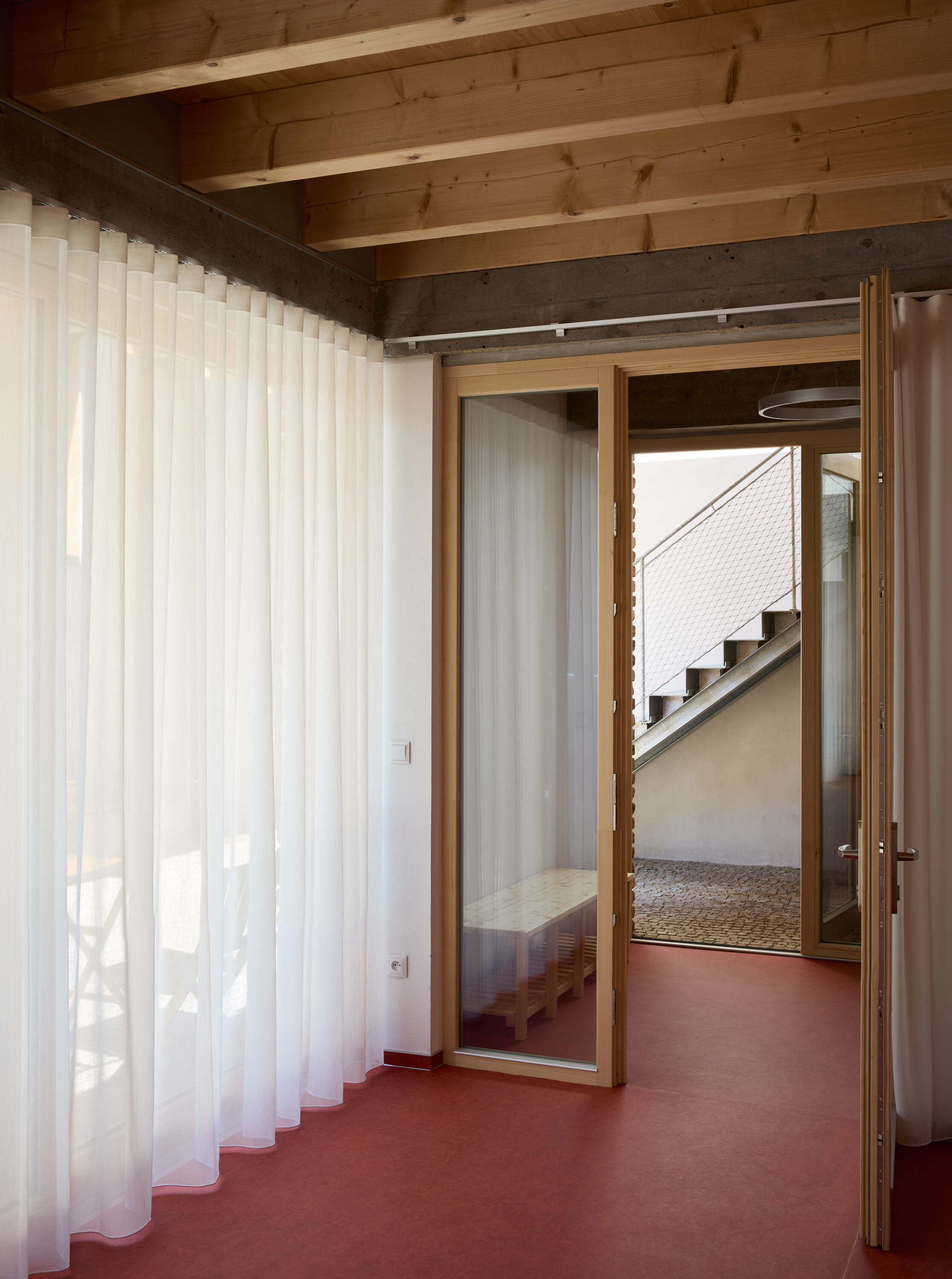 아연도금 계단은 마당에서 갤러리층으로 이어지고, 이 갤러리는 역사적 건물과 현대적 증축동을 연결하는 수평적 통합 공간의 역할을 한다. 기존 건물의 다락은 전면적으로 재구성되었고, 광장을 향한 지붕은 기존의 용마루 높이와 경사를 유지하면서 마당 쪽에는 큰 도머 창을 새로 추가했다. 이를 통해 내부에는 3+kk 구성의 아파트가 만들어졌고, 가족의 한 아들이 ‘카페 위 집’으로 거주한다. 갤러리에서는 두 개의 임대 유닛에 접근할 수 있으며, 하나는 테라피 룸, 다른 하나는 녹화 지붕 위 작은 테라스를 가진 원룸이다.