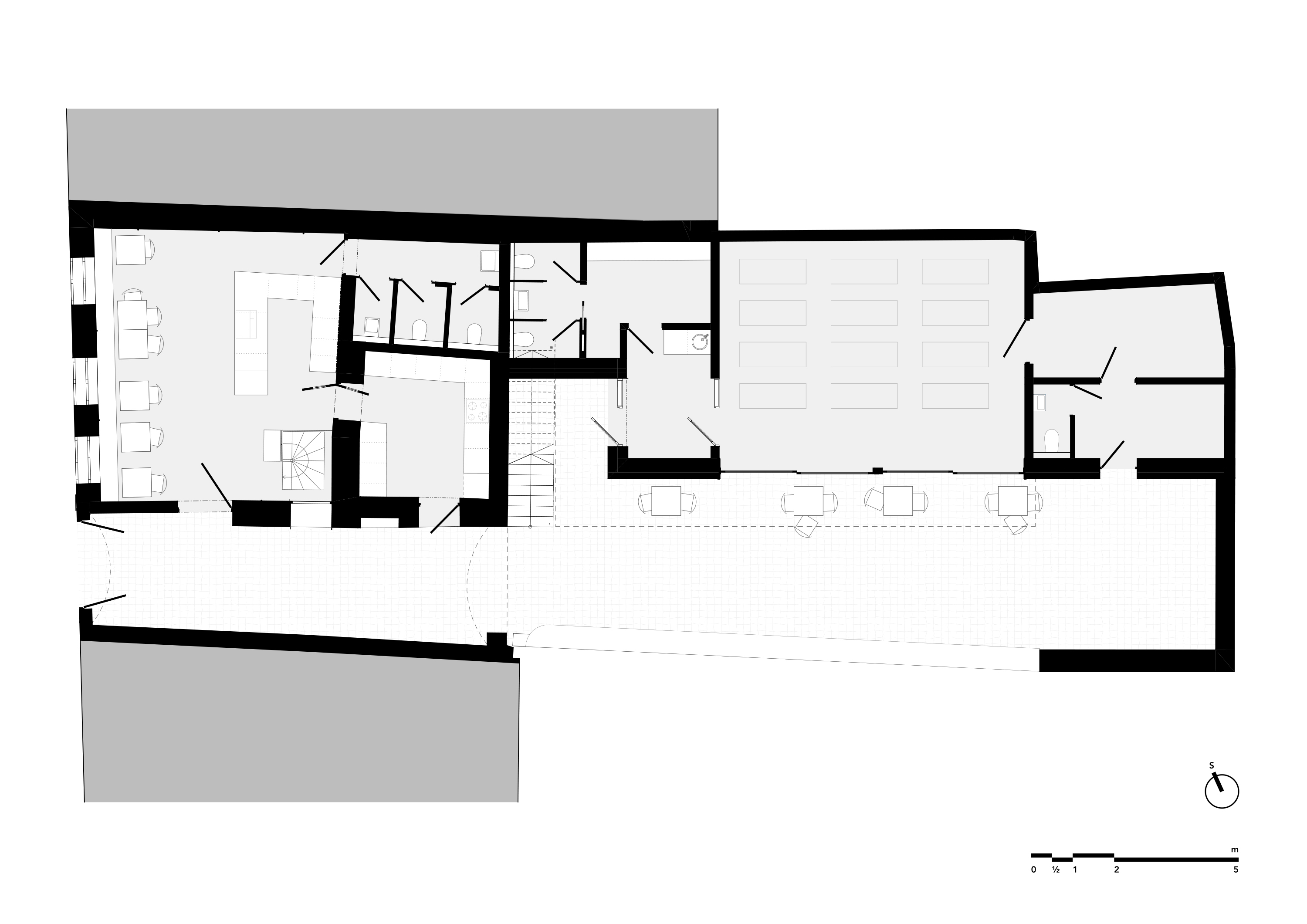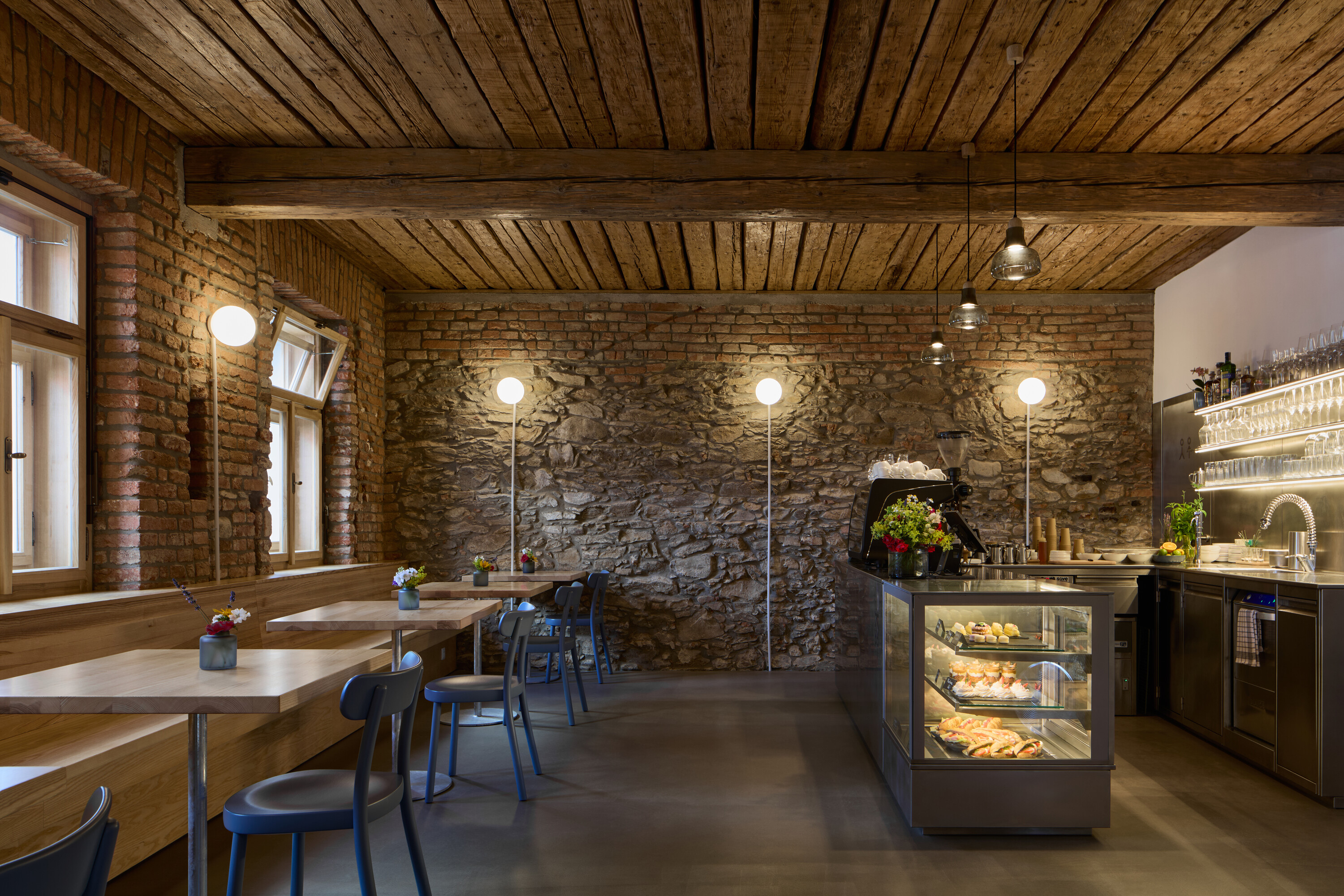 광장을 향한 역사적 건물은 카페로 재탄생했다. 드러낸 벽돌과 보 구조는 과거의 용도와 수많은 변화를 고스란히 보여주는 흔적이며, 그 안에 정교하게 설계된 스테인리스 카페 카운터와 화장실 등 필수 공간이 배치된다. 기다란 물푸레나무 벤치와 파란 의자가 놓여 있으며, 기존과 새로운 재료들이 뒤섞여 다층적이면서도 따뜻한 재료 콜라주를 형성한다. 내부에서 이어지는 통로는 마당까지 연결되고, 길게 놓인 콘크리트 벤치가 외부 자리의 중심이 된다.