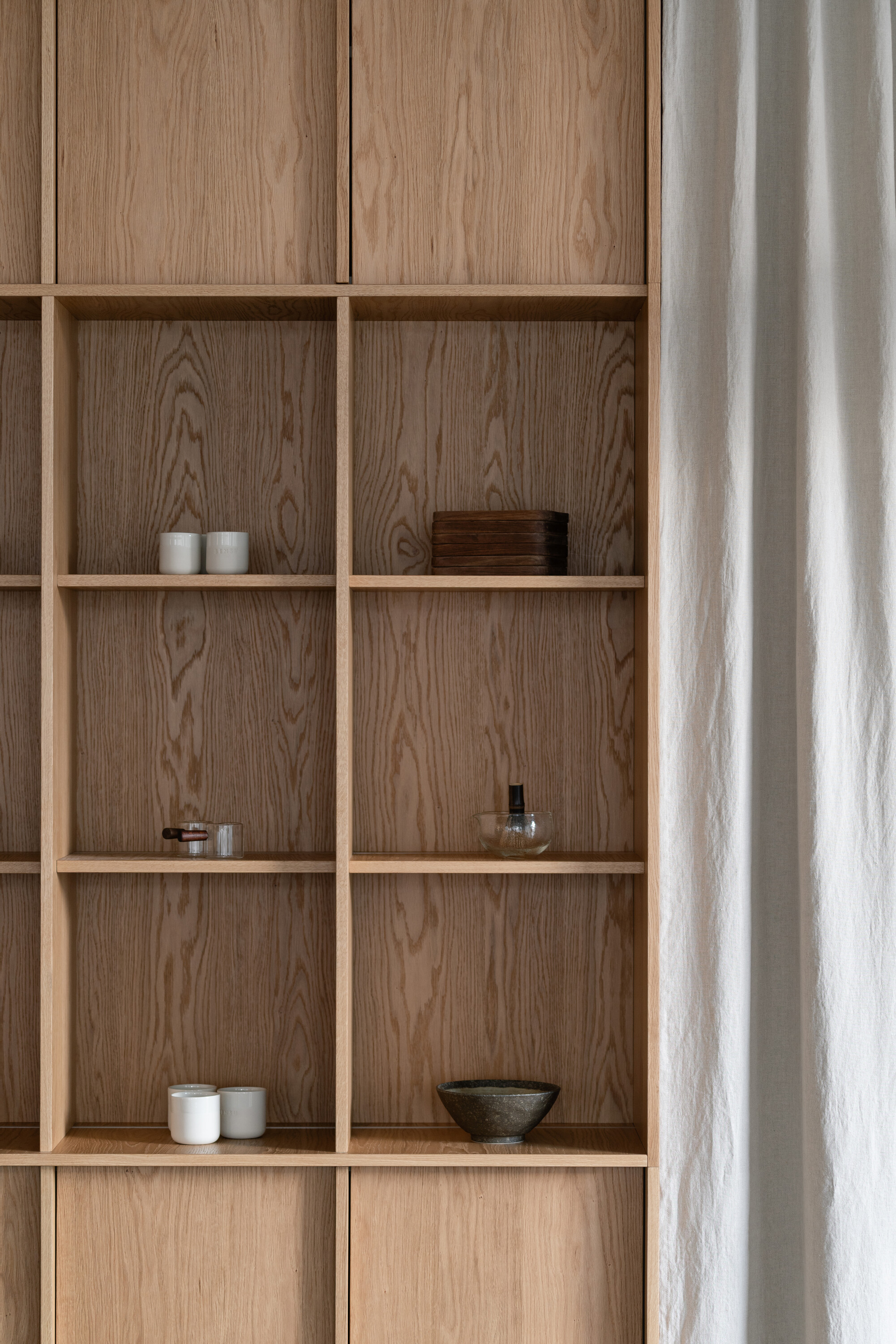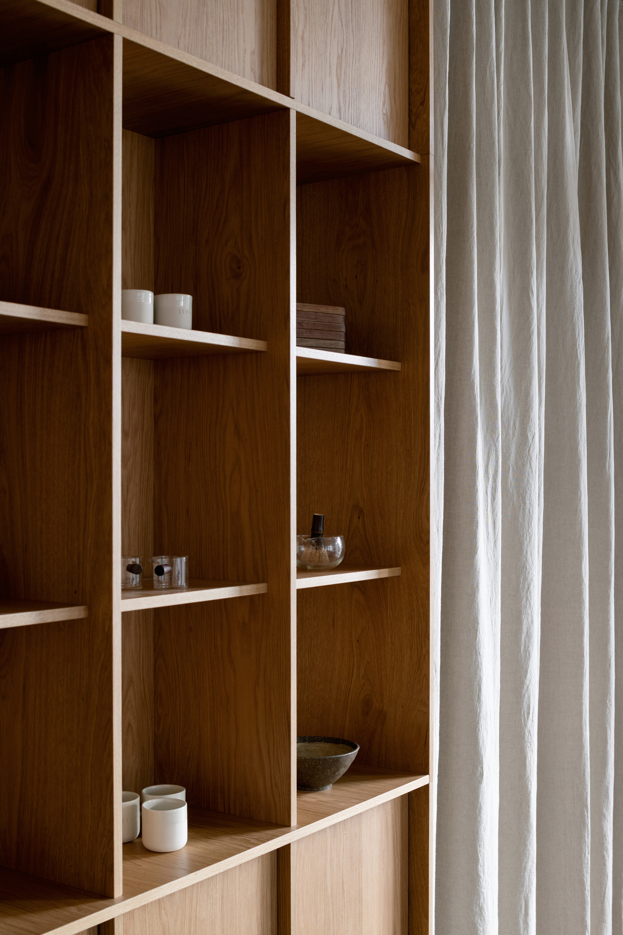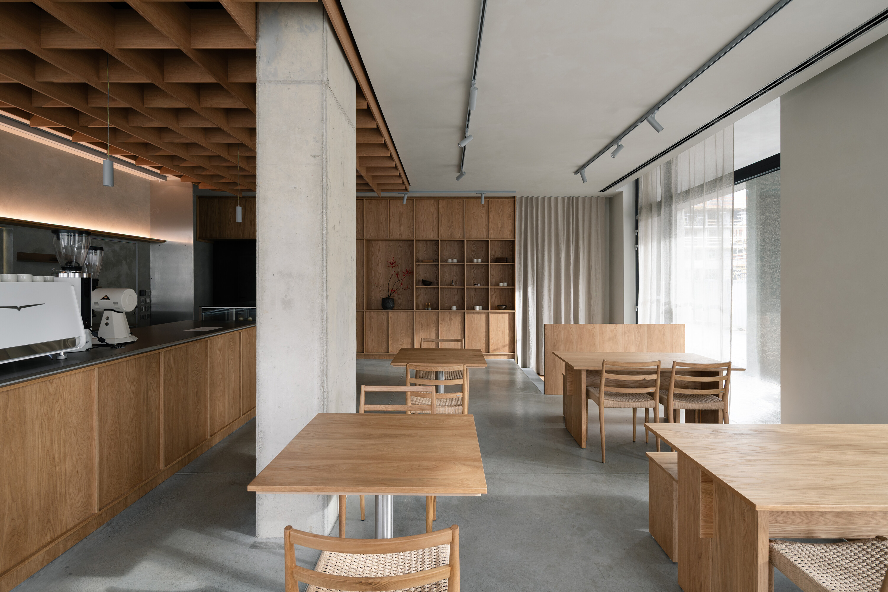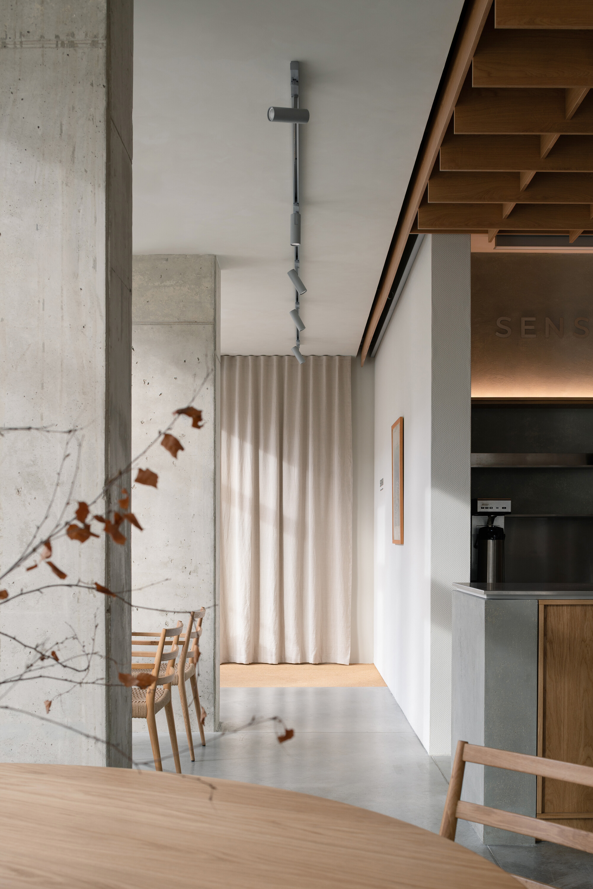 공간의 기본 재료는 목재, 리넨, 콘크리트, 유리로 구성되며 절제된 톤을 유지한다. 이 차분한 배경 덕분에 말차와 디저트의 생동감 있는 색감이 더욱 돋보인다. 또한 재료 간의 대비가 공간적 깊이를 형성한다. 벨벳처럼 부드러운 오크 베니어는 차갑고 반질반질한 스테인리스와 대조되고, 단단한 콘크리트는 부드럽게 물결치는 리넨 커튼과 만나 균형을 이룬다. 의자, 테이블, 조명, 컵 등 세심하게 선택된 요소들은 하나의 조화를 이루며 방문객에게 차분하고 집중된 경험을 제공한다.