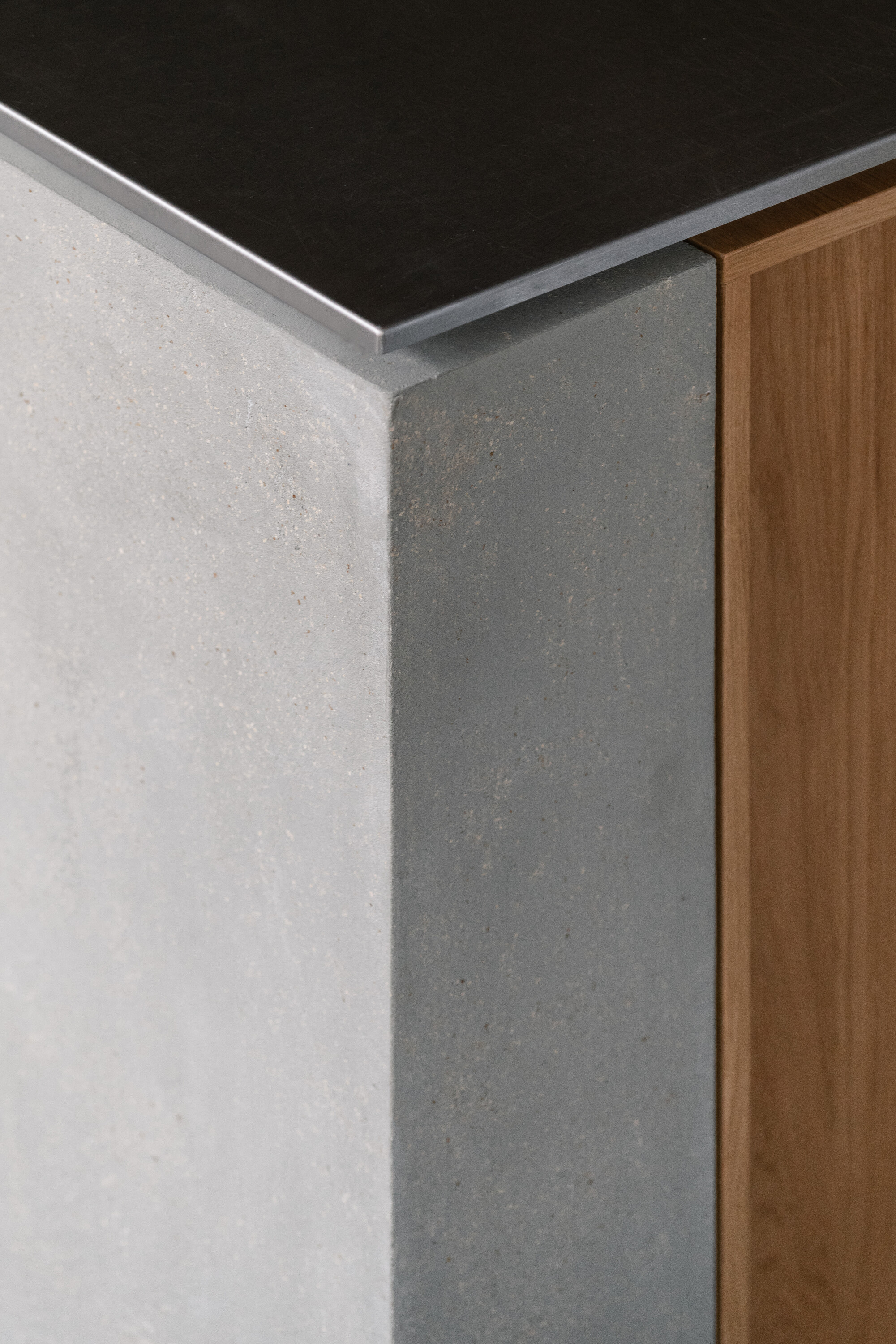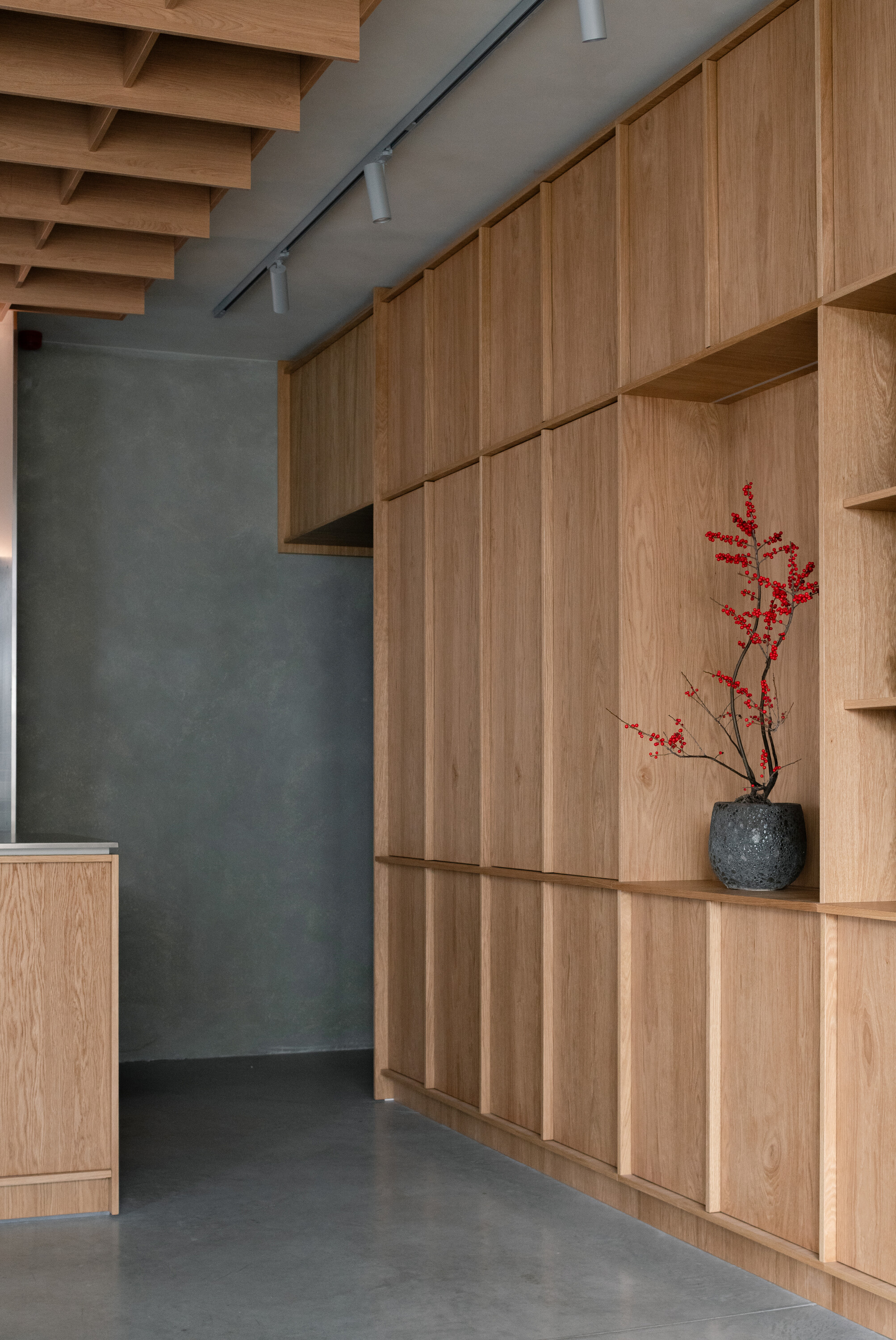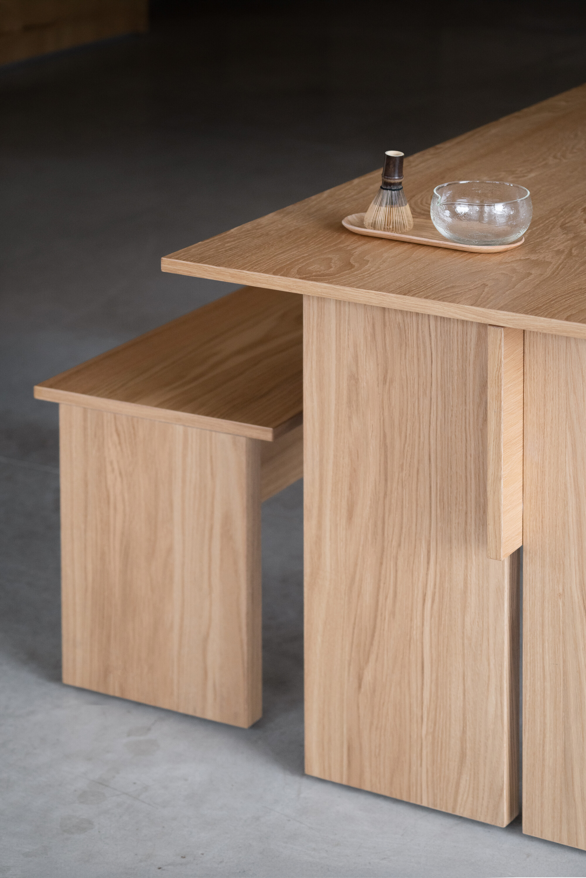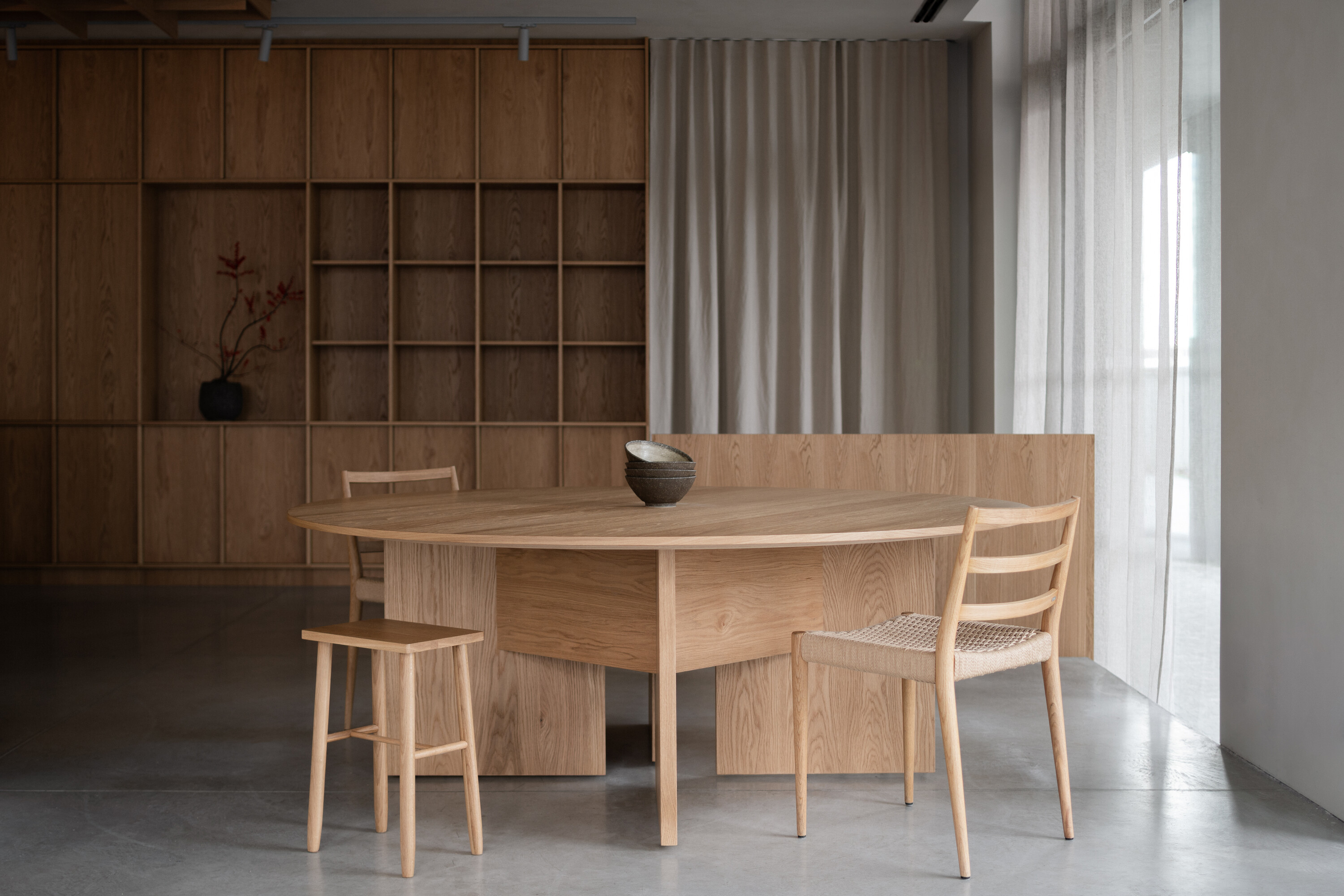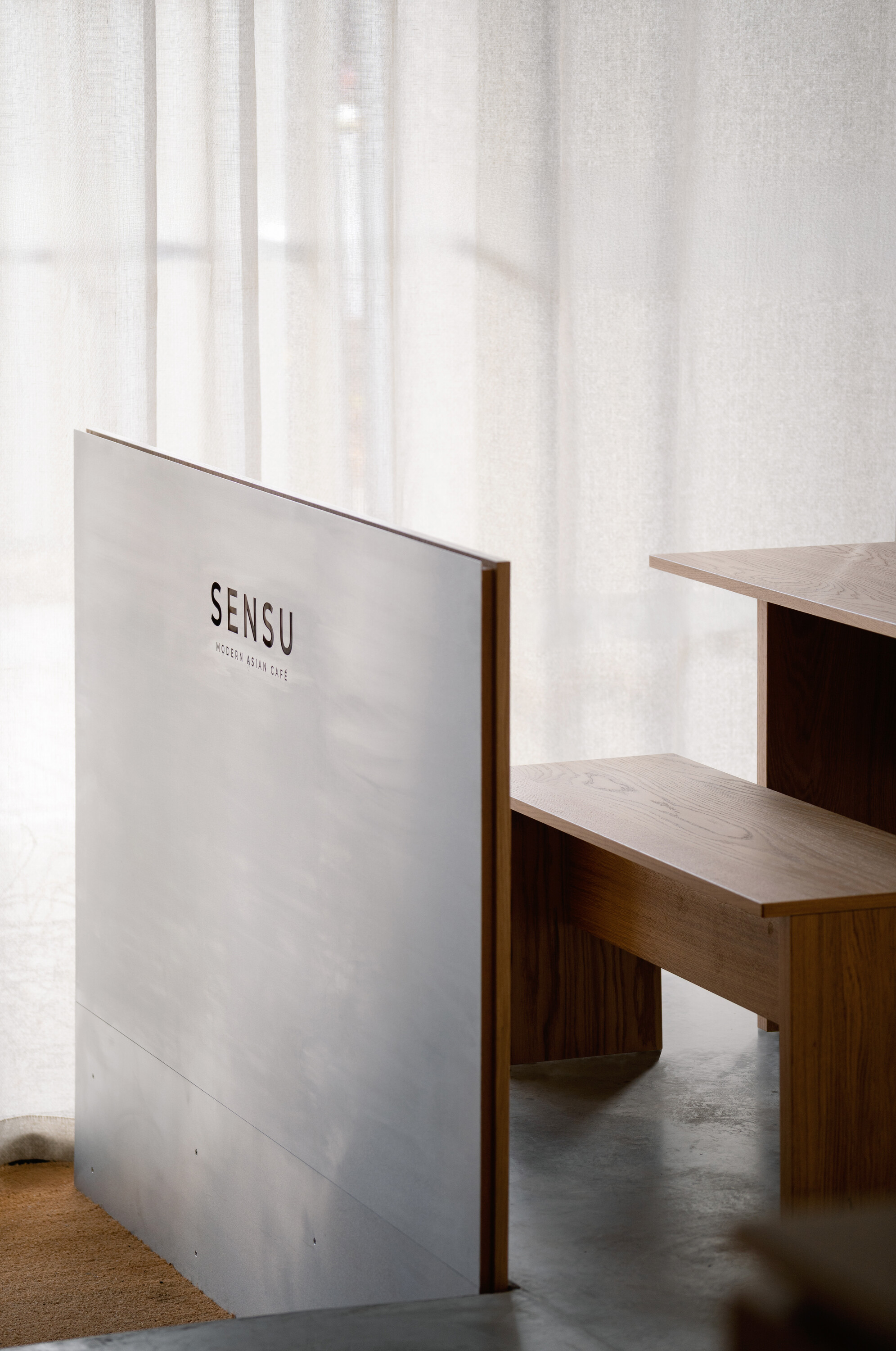 공간의 기본 재료는 목재, 리넨, 콘크리트, 유리로 구성되며 절제된 톤을 유지한다. 이 차분한 배경 덕분에 말차와 디저트의 생동감 있는 색감이 더욱 돋보인다. 또한 재료 간의 대비가 공간적 깊이를 형성한다. 벨벳처럼 부드러운 오크 베니어는 차갑고 반질반질한 스테인리스와 대조되고, 단단한 콘크리트는 부드럽게 물결치는 리넨 커튼과 만나 균형을 이룬다. 의자, 테이블, 조명, 컵 등 세심하게 선택된 요소들은 하나의 조화를 이루며 방문객에게 차분하고 집중된 경험을 제공한다.