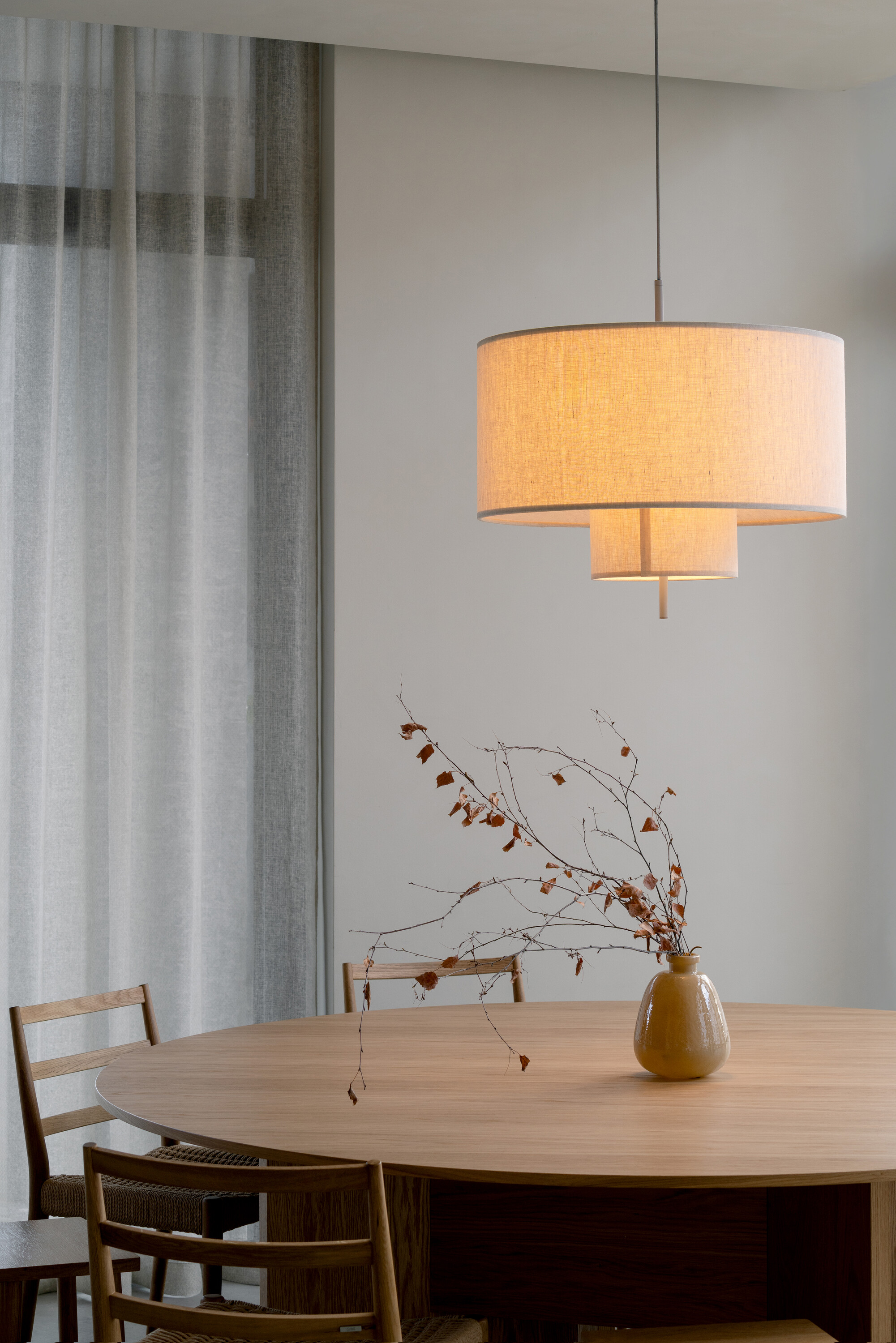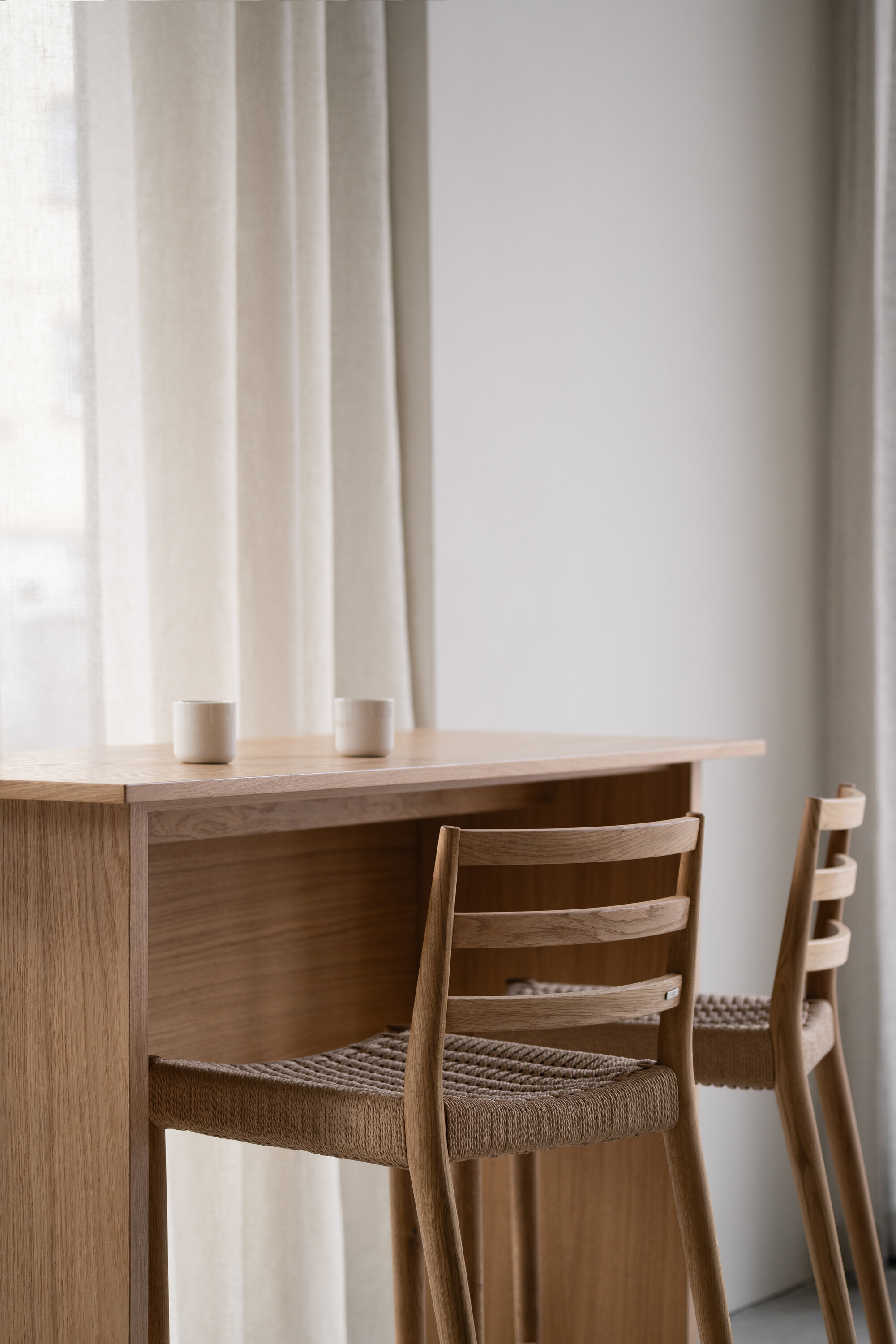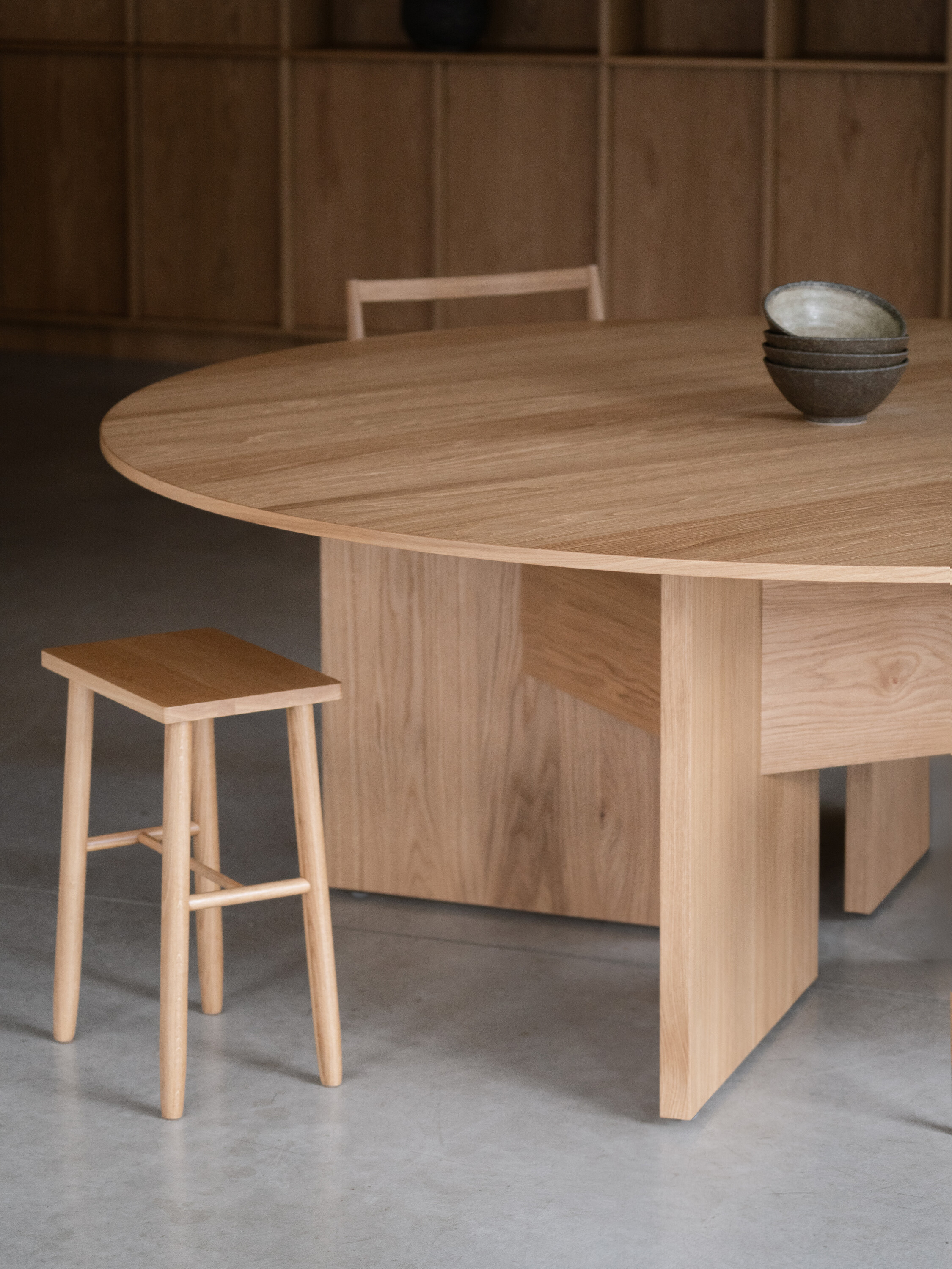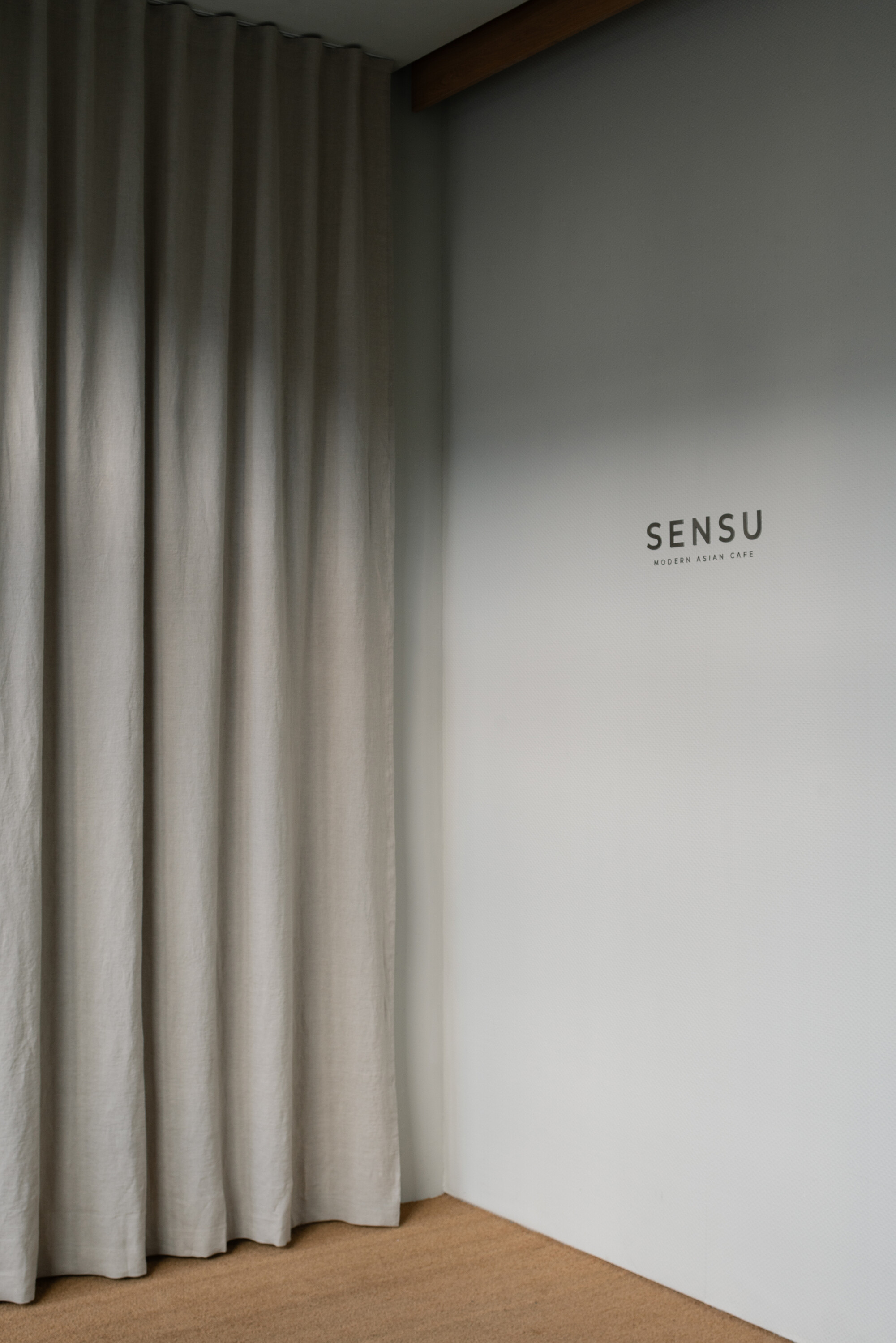 공간의 기본 재료는 목재, 리넨, 콘크리트, 유리로 구성되며 절제된 톤을 유지한다. 이 차분한 배경 덕분에 말차와 디저트의 생동감 있는 색감이 더욱 돋보인다. 또한 재료 간의 대비가 공간적 깊이를 형성한다. 벨벳처럼 부드러운 오크 베니어는 차갑고 반질반질한 스테인리스와 대조되고, 단단한 콘크리트는 부드럽게 물결치는 리넨 커튼과 만나 균형을 이룬다. 의자, 테이블, 조명, 컵 등 세심하게 선택된 요소들은 하나의 조화를 이루며 방문객에게 차분하고 집중된 경험을 제공한다.