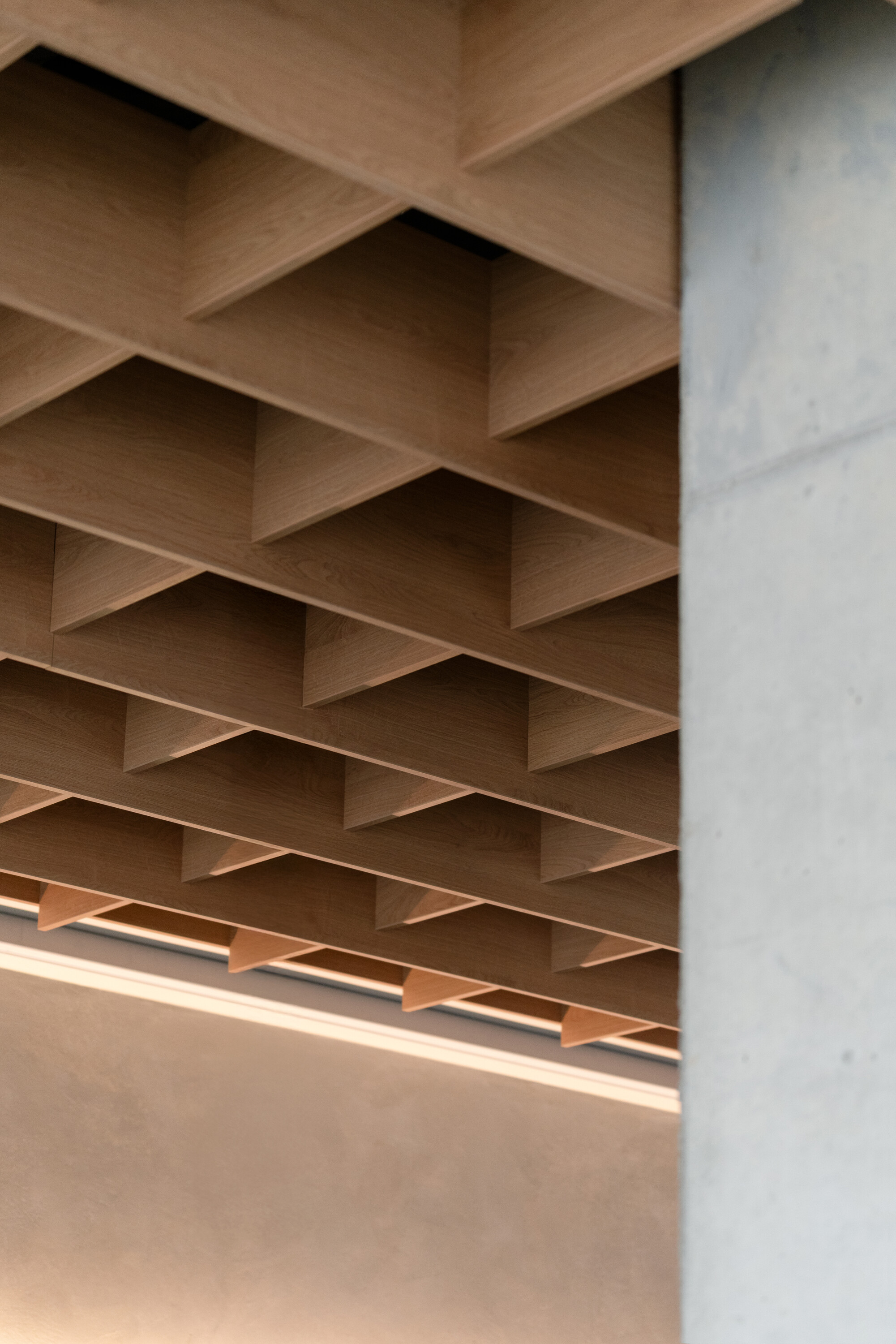 바 위 천장은 그리드 구조로 구성해 커피머신 주변의 음향을 조절하고 공조 설비가 원활히 작동하도록 했다. 깊은 음영을 만드는 그리드의 형태는 바 공간에 단단한 무게감을 더한다. 전체적으로 공간은 빛과 그림자의 대비를 적극 활용해, 단정하면서도 명료한 분위기를 만들어낸다.