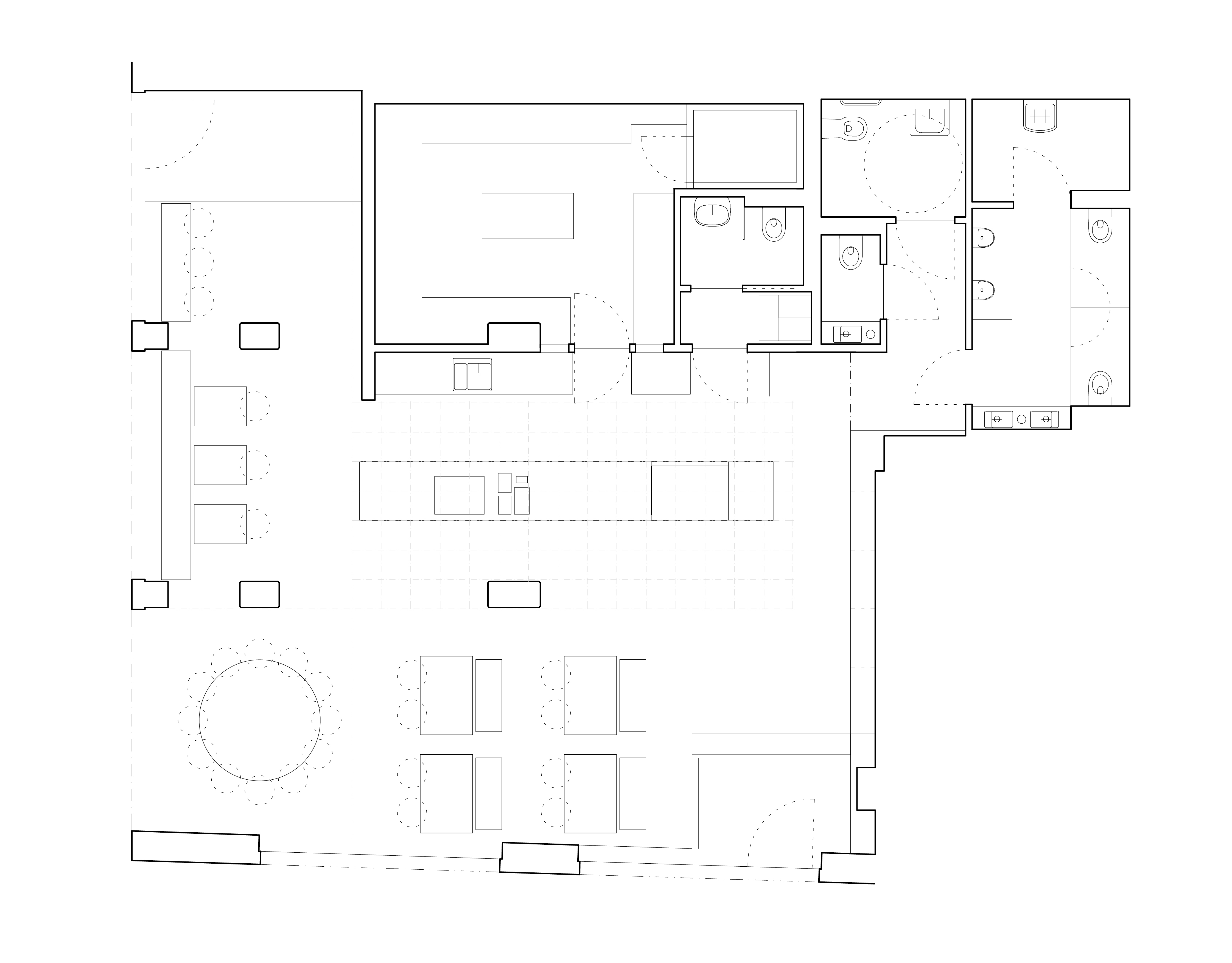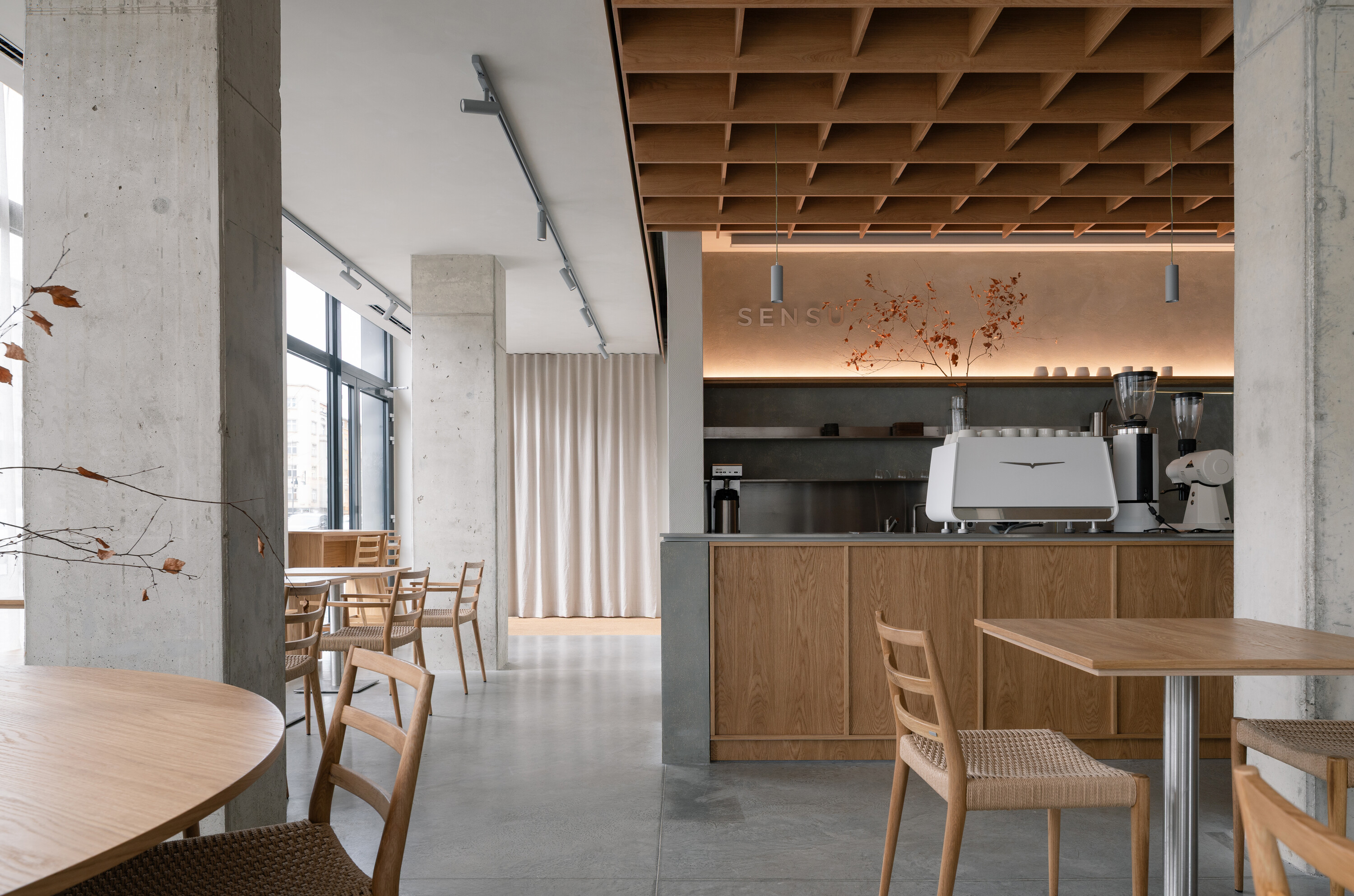 공간의 중심에는 길게 뻗은 선형 바가 자리한다. 이 바는 직원의 동선을 효율적으로 통합하고, 동시에 카페 내부의 움직임과 흐름을 자연스럽게 이끈다. 센수를 위해 특별히 디자인한 가구 시리즈도 눈에 띈다. 지름 2m의 원형 테이블, 4인이 앉을 수 있는 직사각 테이블, 입구 측 바 테이블까지 다양한 형태가 조응을 이룬다.