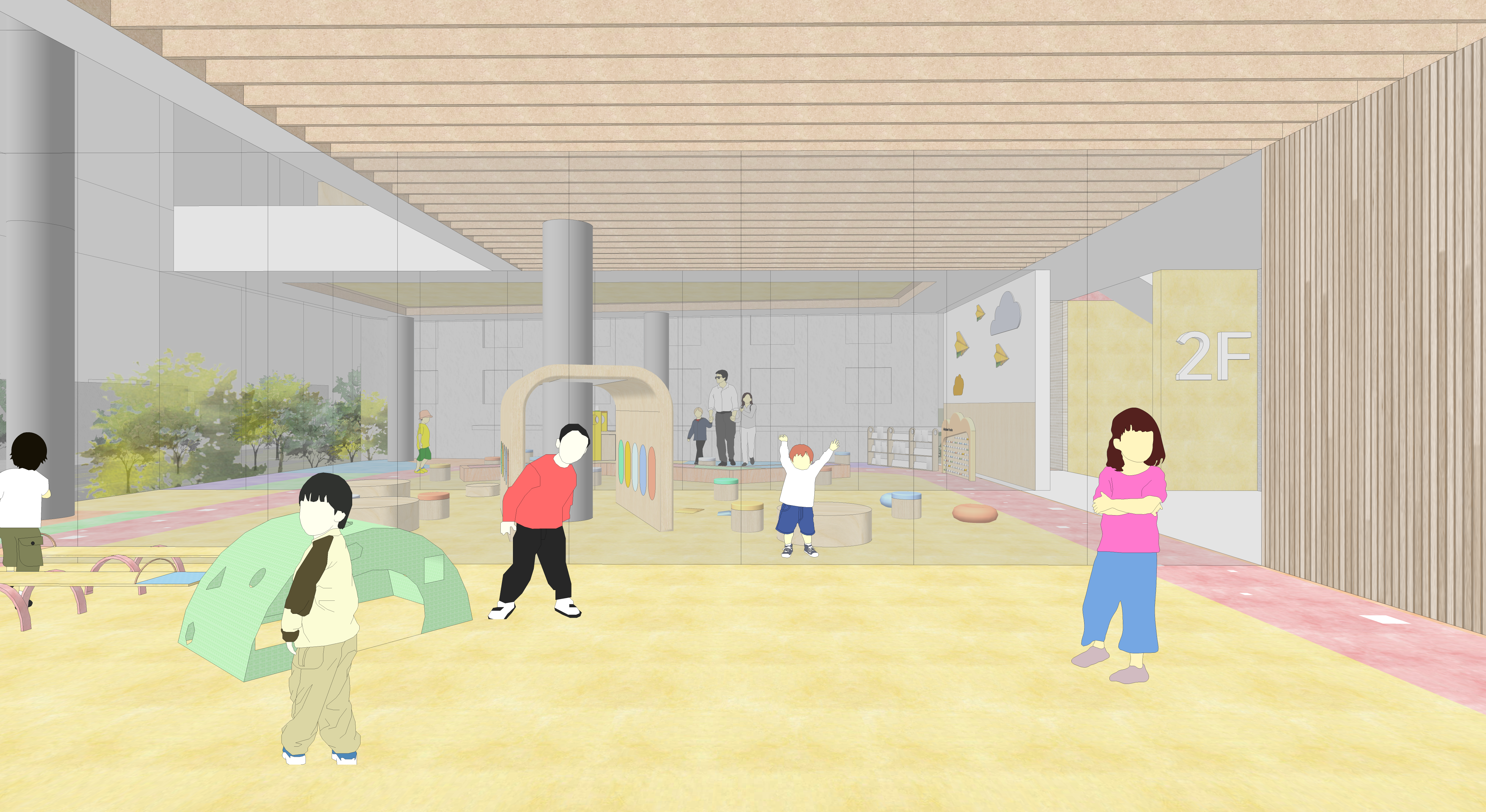 모든 내부 공간은 아이의 비례에서 출발한다. 높이, 깊이, 시야의 열림을 조절하여 불안감을 줄이고 안정적인 체험을 유도했다. 빛이 드리우는 라운지, 바람이 흐르는 놀이 공간은 아이가 머물고 싶은 작은 안식처가 된다. 보호자는 아이를 신뢰하고 맡길 수 있고, 아이는 마음껏 뛰어놀며 스스로 공간을 탐색할 수 있는 따뜻한 일상의 풍경을 만든다.