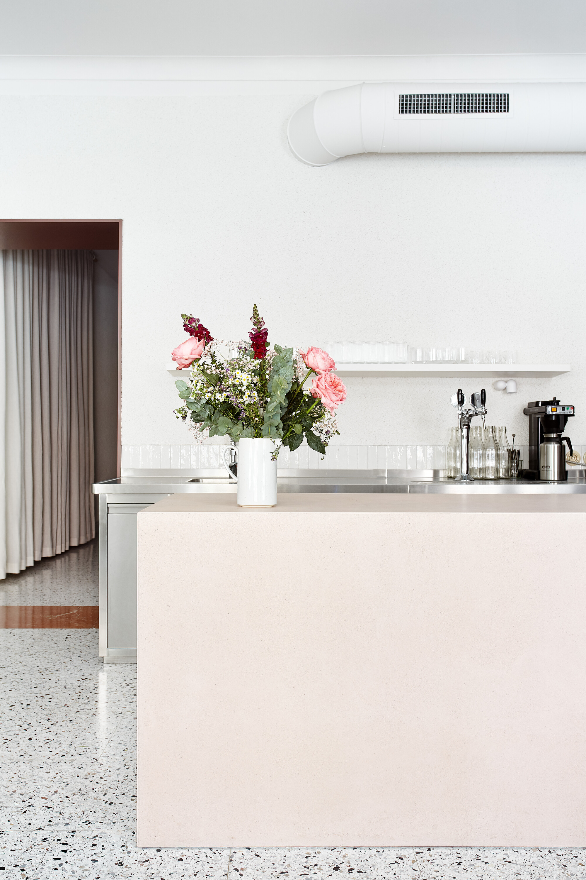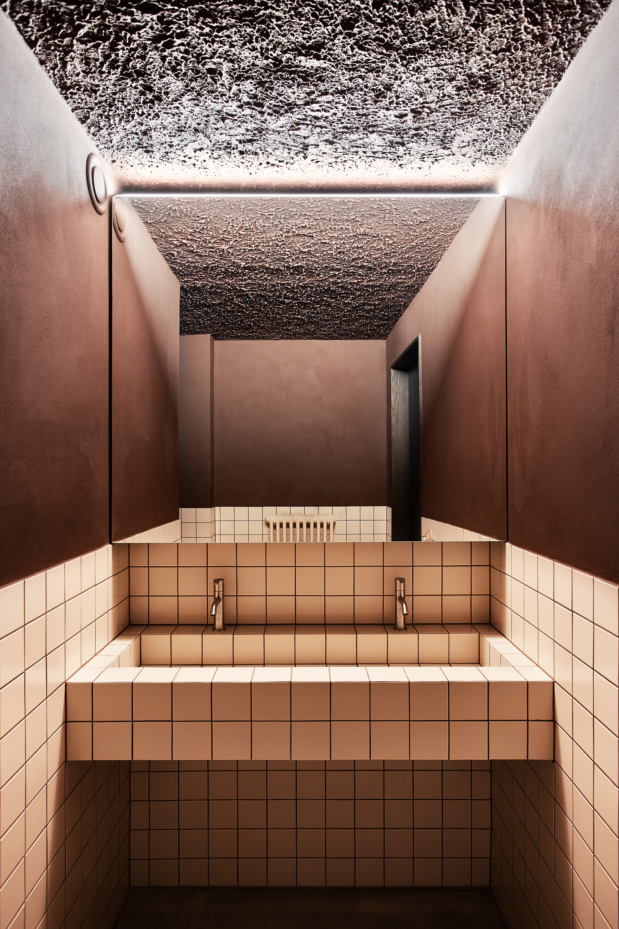 공간의 포인트는 단연 핑크 콘크리트 바다. 부드러운 색감과 강한 선이 공존하며, 테라조 바닥과 대비를 이루어 미묘한 긴장감을 만든다. 지나치게 화려하지 않지만 강한 존재감을 드러내는 오브제처럼 작동한다.