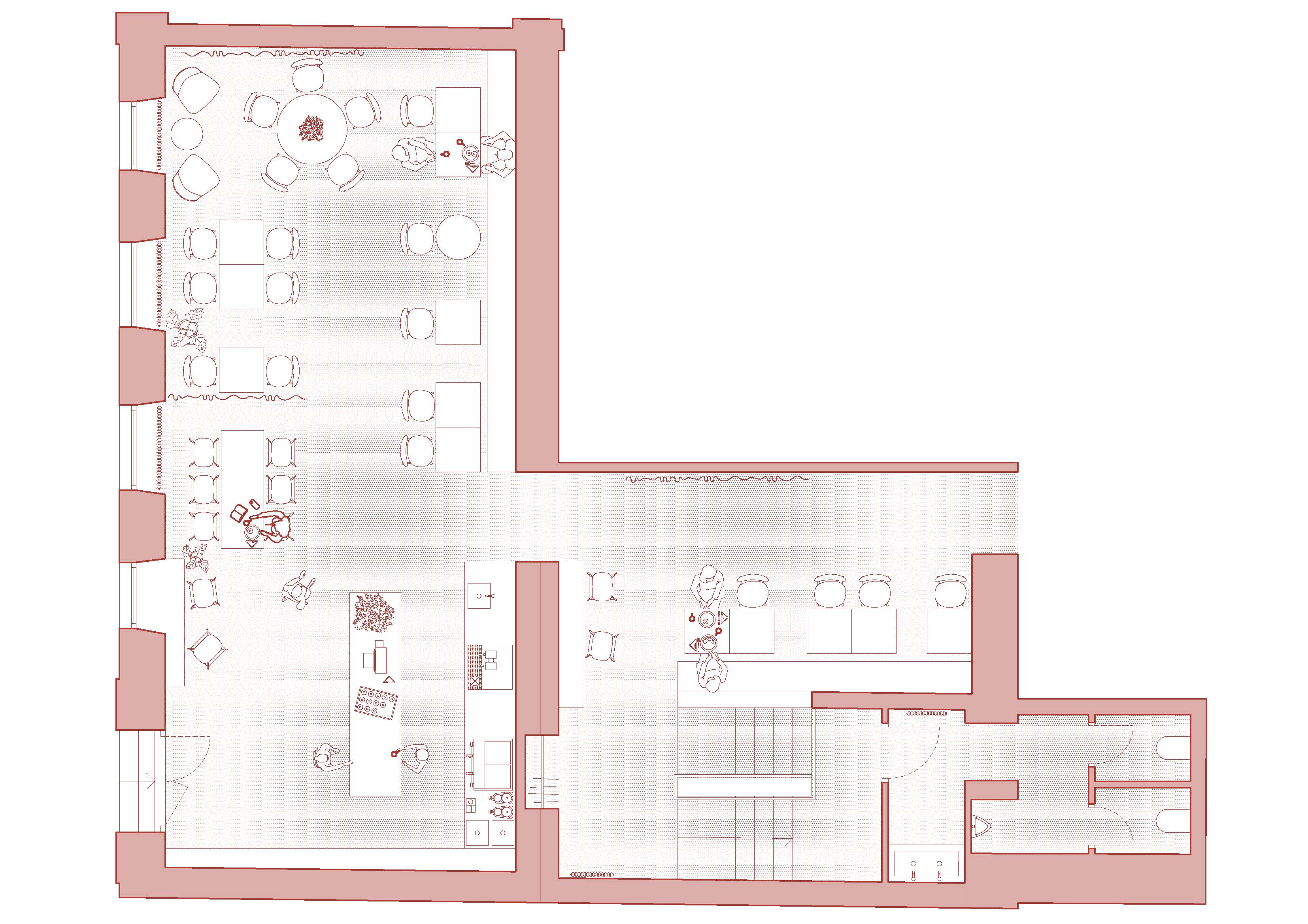 전면부 벽면은 거친 텍스처의 플라스터와 매끄러운 도장면이 공존한다. 반면 후면 공간은 짙은 적갈색 톤이 지배적이다. 이 색은 벤치, 계단, 화장실 벽면까지 확장되며 비스트로 전체에 통일된 분위기를 만든다. 처음 현장을 확인했을 때 발견한 노출 콘크리트 계단의 성격은 유지되었고, 계단의 물성과 어울리는 마감이 지하 화장실까지 자연스럽게 이어진다.