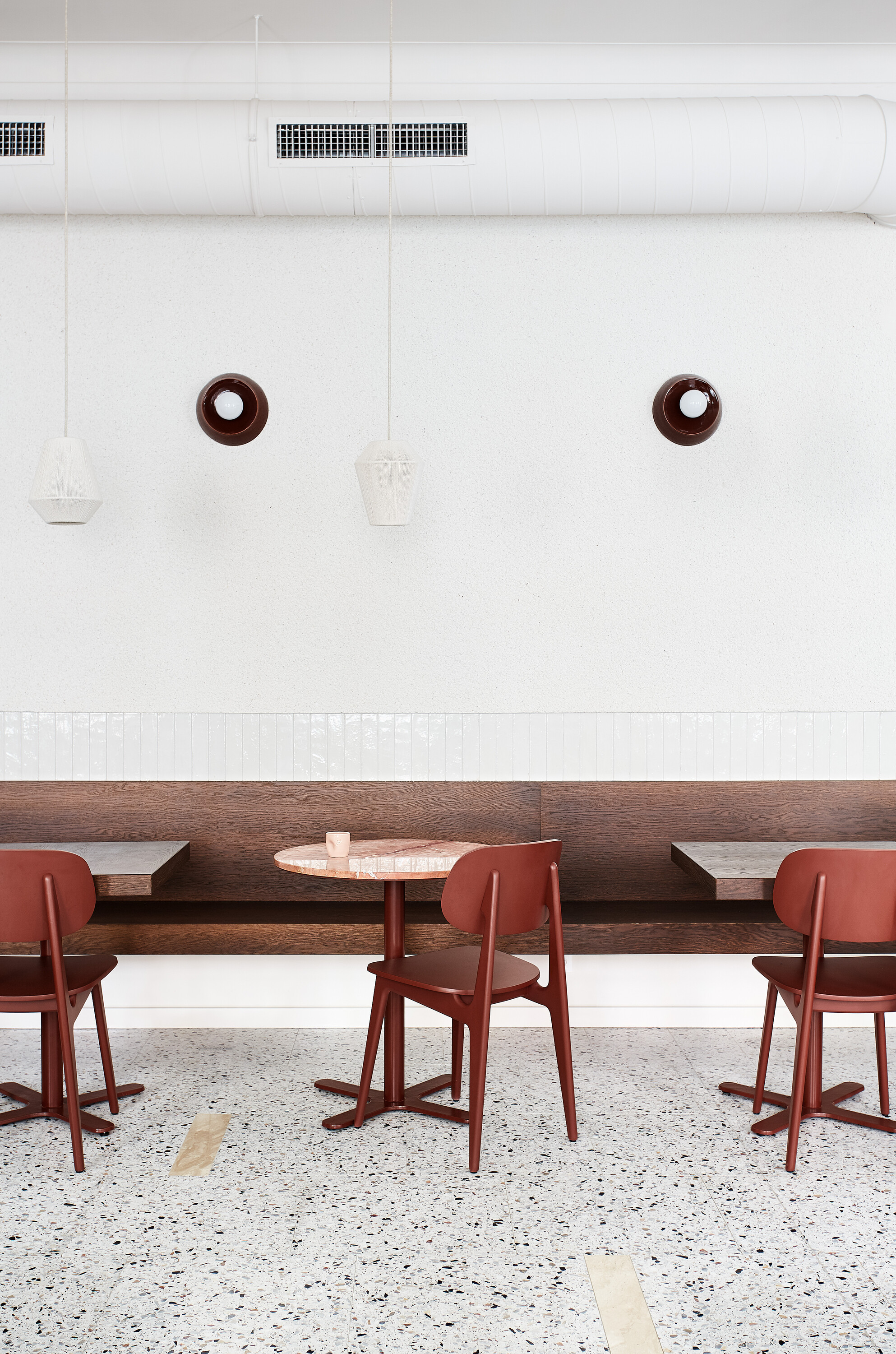 공간 디자인에서 가장 먼저 고려된 것은 수명과 내구성이었다. 하루 종일 많은 사람이 드나드는 비스트로의 특성상 마감재 선택은 매우 중요한 문제였다. 그 결과, 전체 콘셉트의 출발점이 된 것은 테라조 타일이다. 이 바닥은 심미성과 기능성을 동시에 갖추며, 타일 그리드 사이에 다양한 색의 대리석 조각을 불규칙하게 삽입해 패턴의 반복을 깨고 공간에 절제된 리듬과 생동감을 더한다.