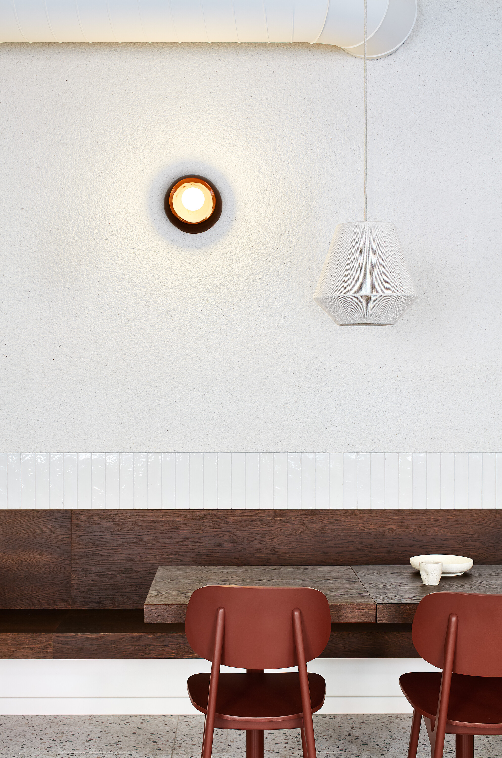 공간 디자인에서 가장 먼저 고려된 것은 수명과 내구성이었다. 하루 종일 많은 사람이 드나드는 비스트로의 특성상 마감재 선택은 매우 중요한 문제였다. 그 결과, 전체 콘셉트의 출발점이 된 것은 테라조 타일이다. 이 바닥은 심미성과 기능성을 동시에 갖추며, 타일 그리드 사이에 다양한 색의 대리석 조각을 불규칙하게 삽입해 패턴의 반복을 깨고 공간에 절제된 리듬과 생동감을 더한다.