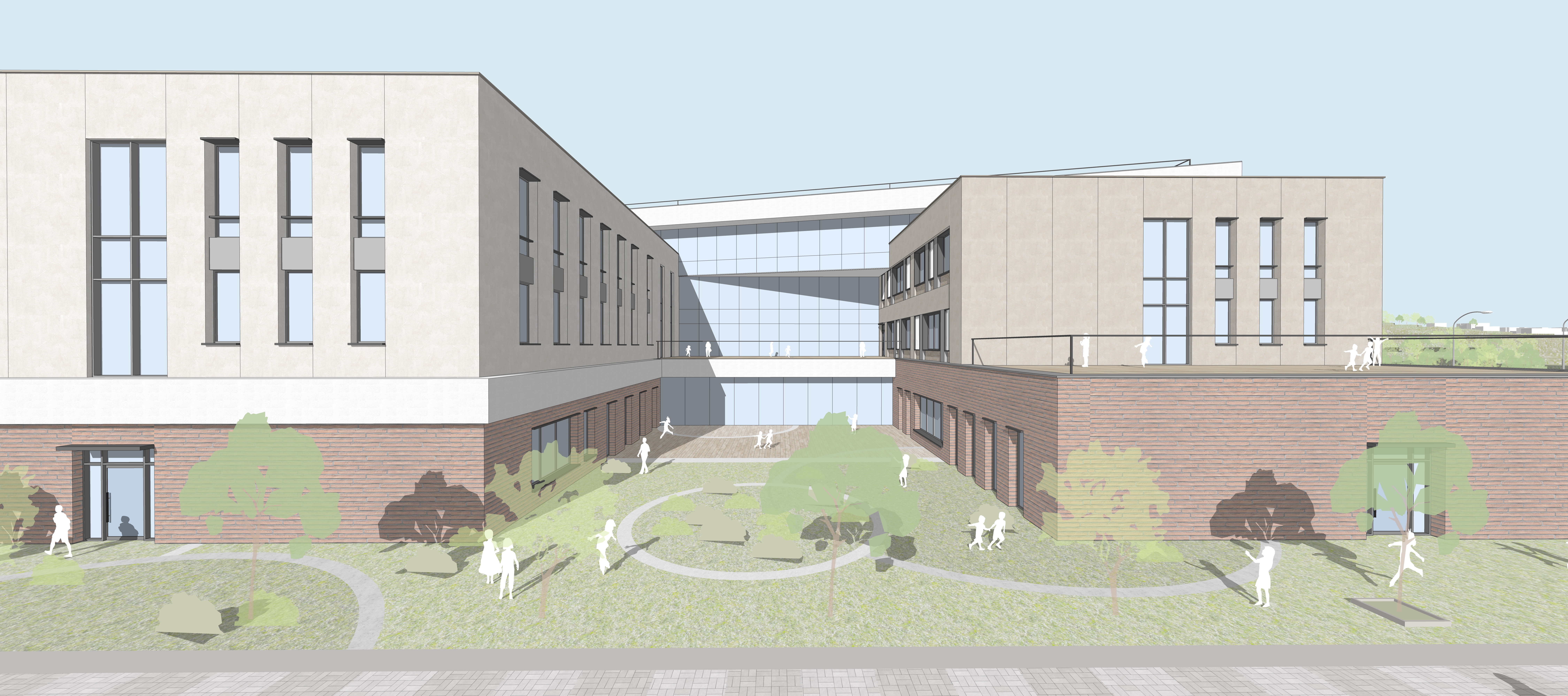 주거단지와 공원을 연결하는 보행로에서 내어주는 개방공간(도서실, 시청각실, 식당 등)계획으로 지역사회와 교류하고 일상을 연결하는 학교 계획