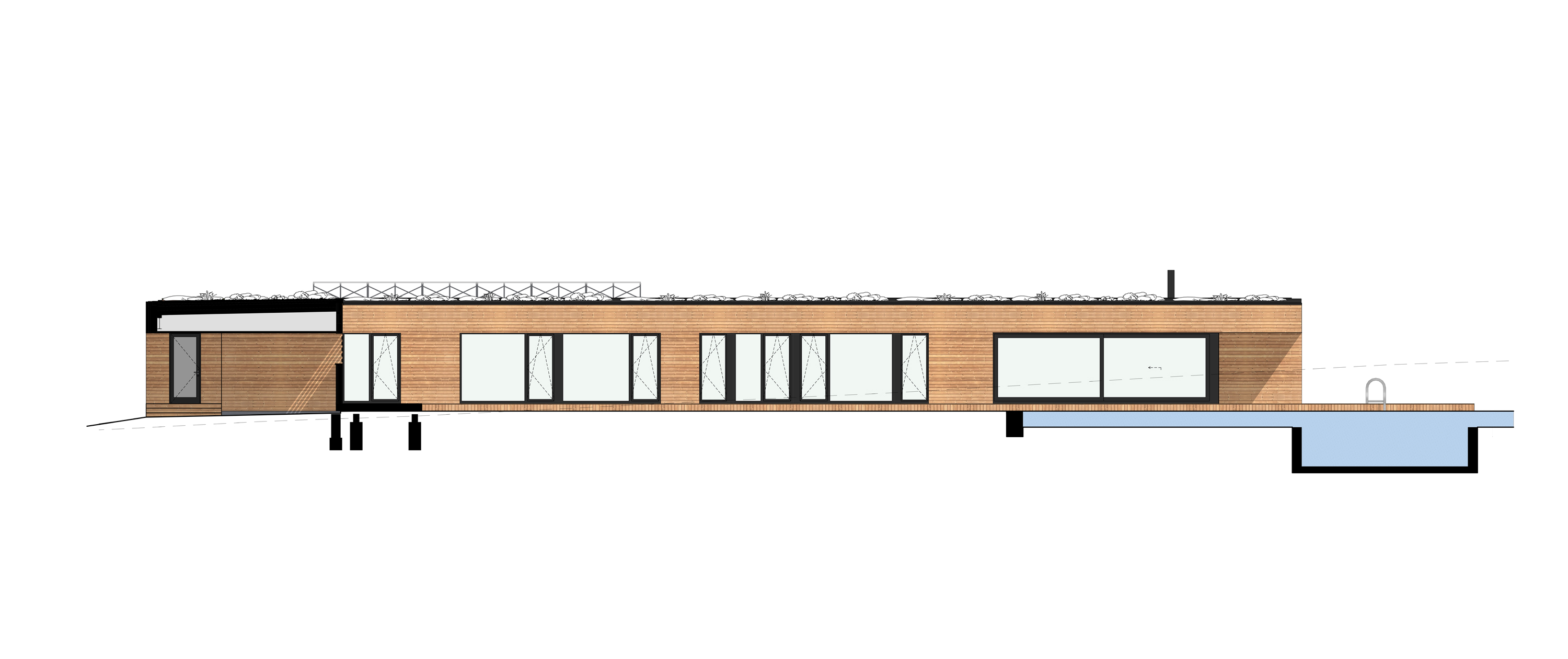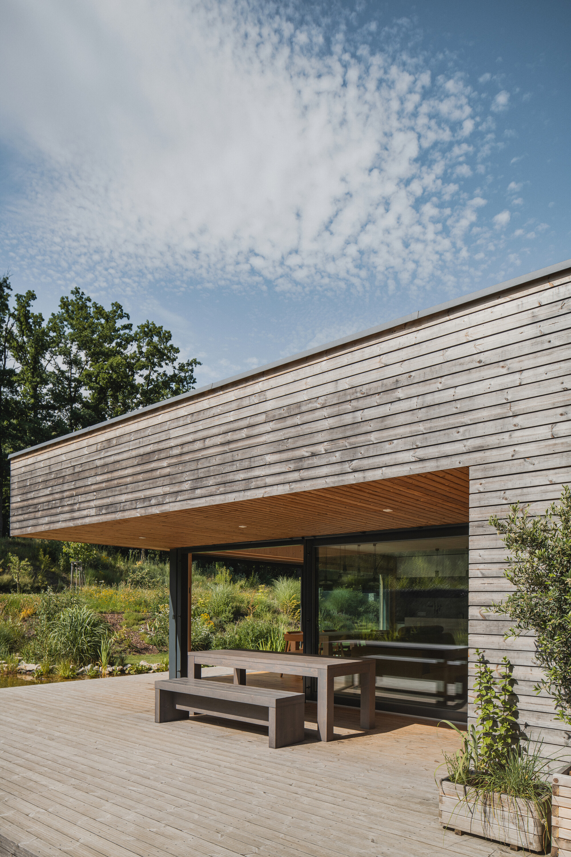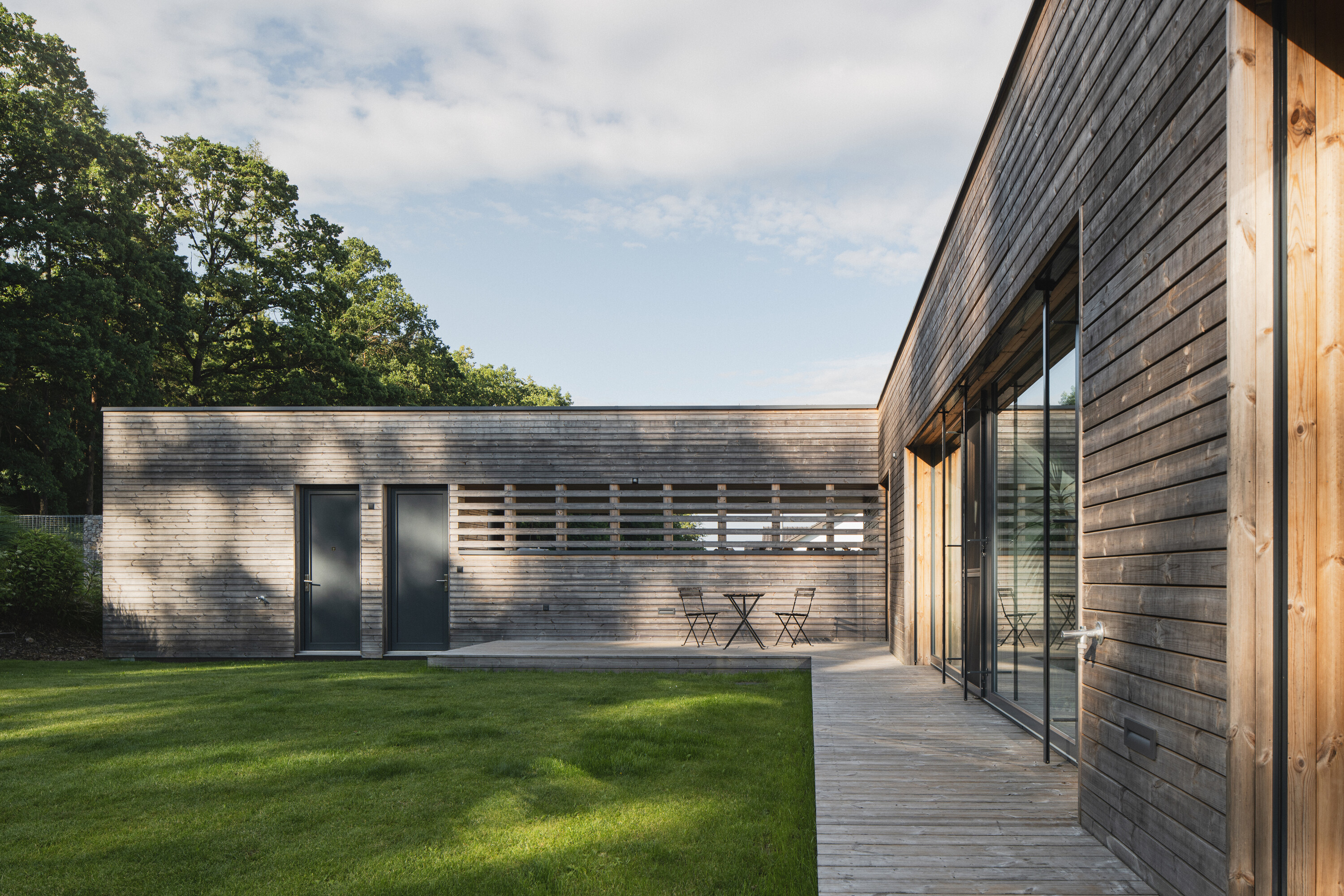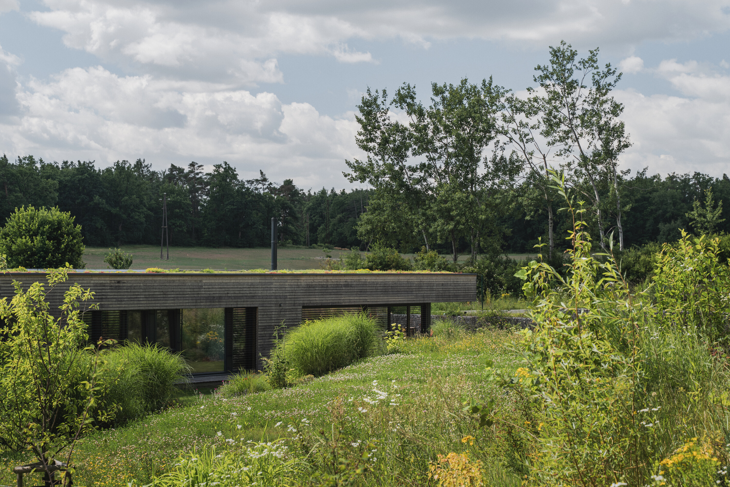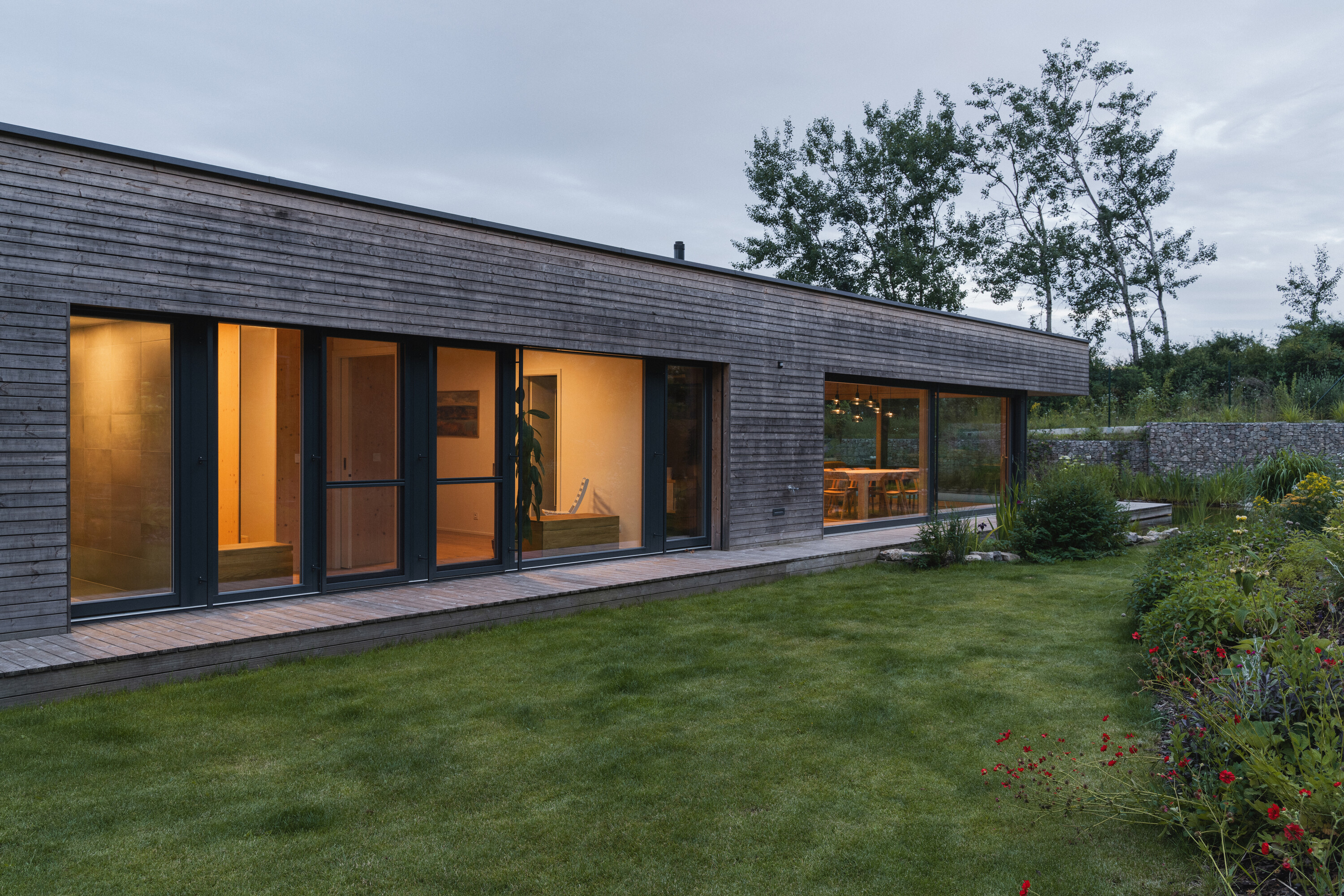 구조는 대면적 집성목 패널을 사용해 높은 강성과 단열 성능을 확보했고, 외장은 서서히 은은하게 변색되는 Thermowood를 사용해 주변 녹지와 자연스럽게 어우러진다. 단면 녹화 지붕은 열 환경을 완화하며 집을 지형 속에 스며들도록 만든다.