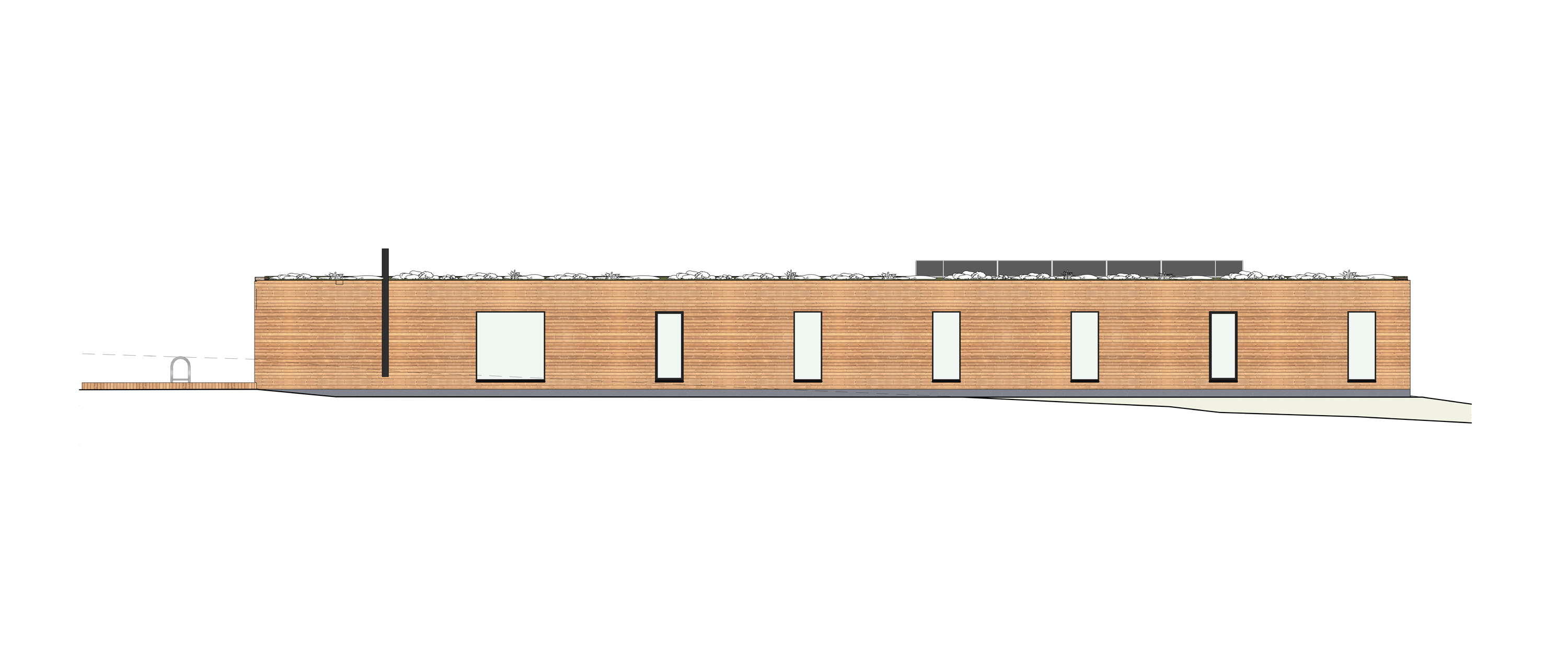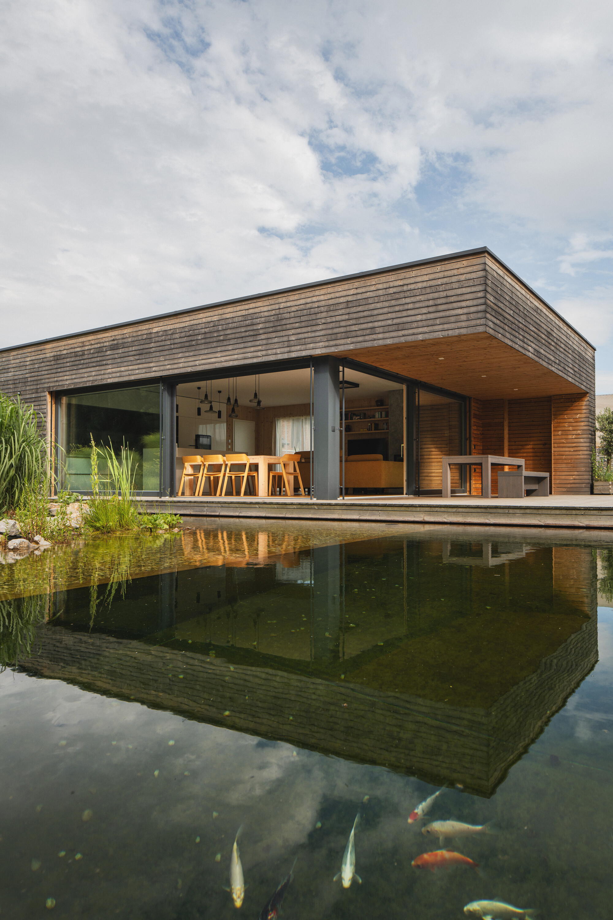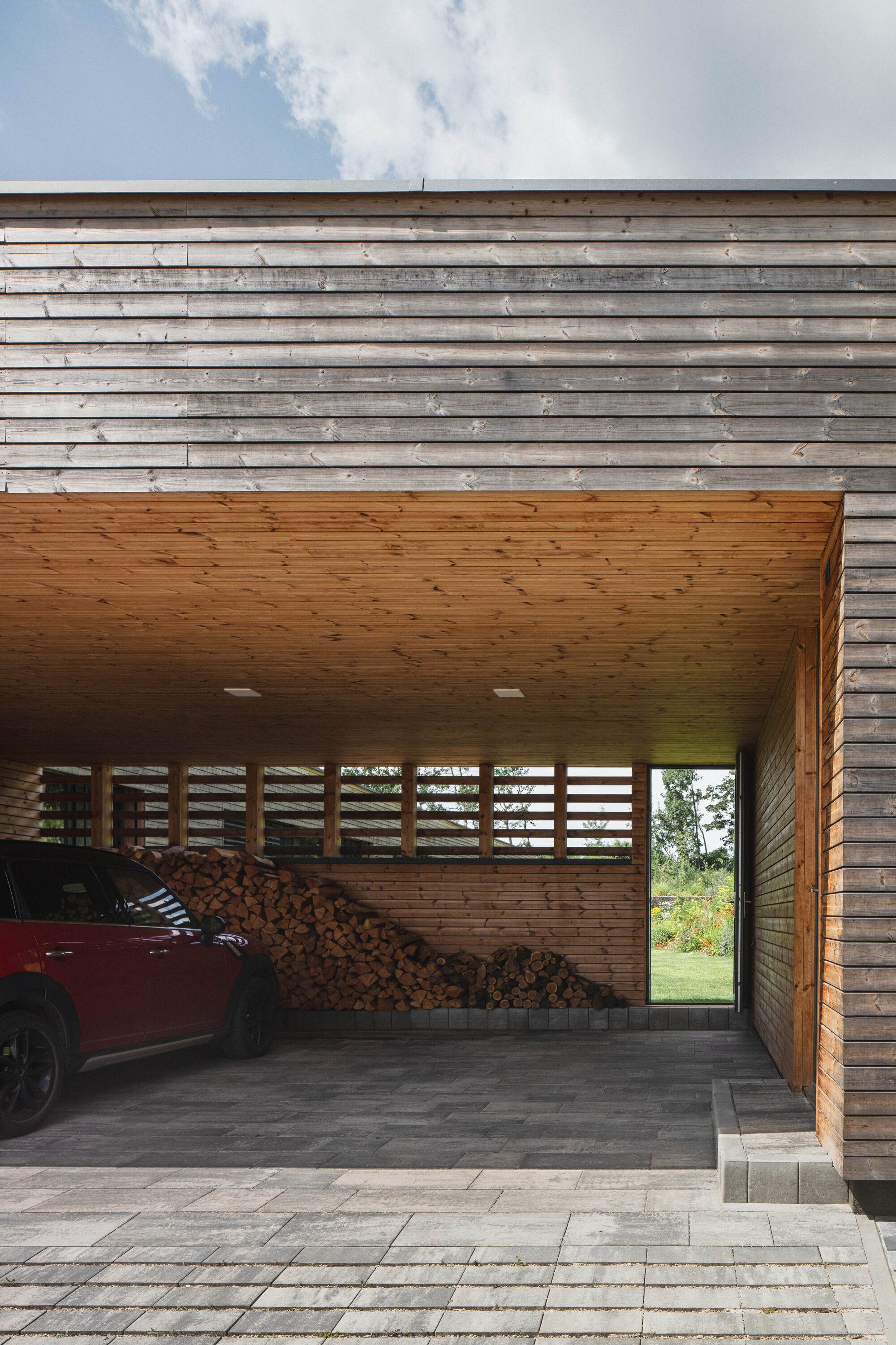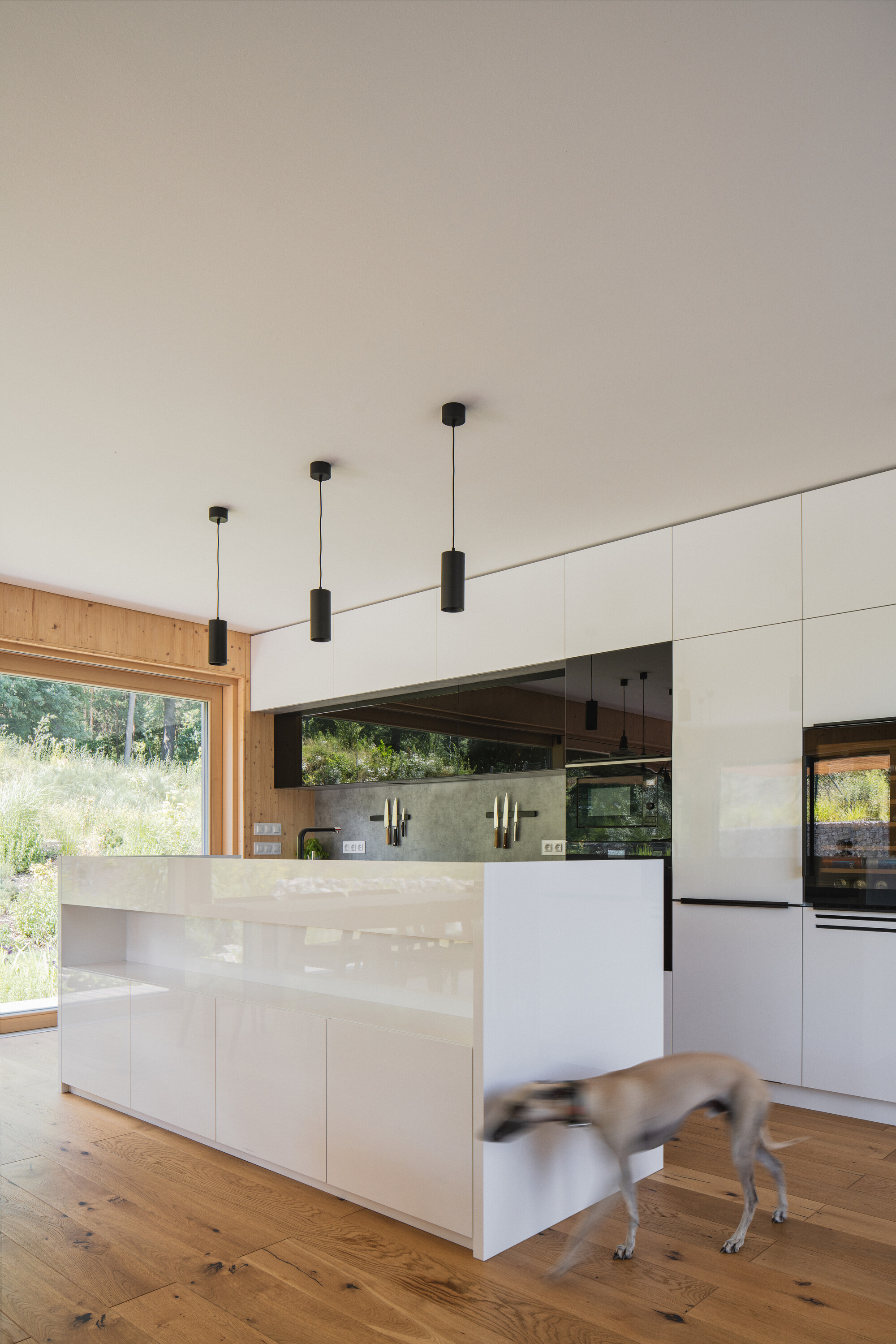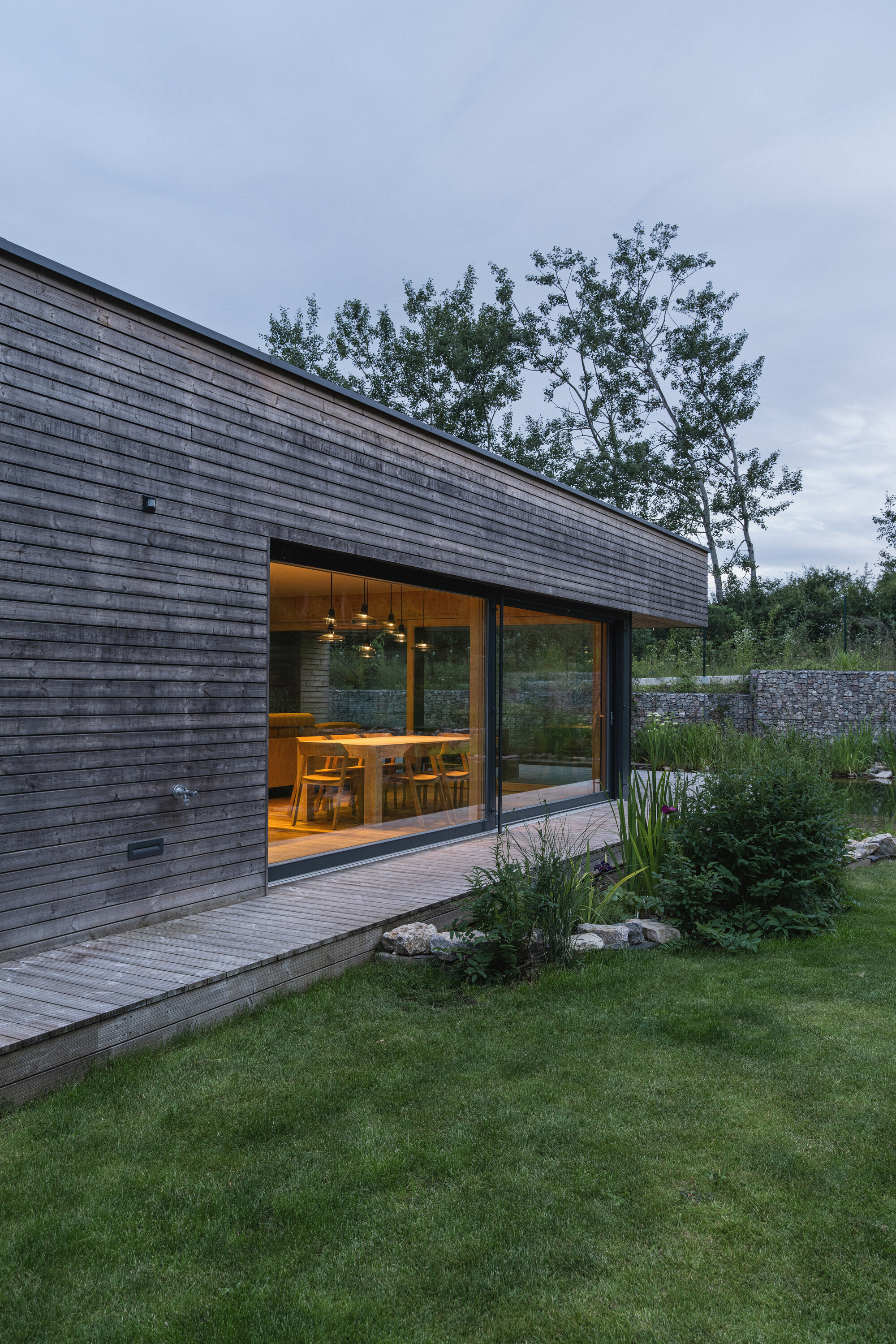 구조는 대면적 집성목 패널을 사용해 높은 강성과 단열 성능을 확보했고, 외장은 서서히 은은하게 변색되는 Thermowood를 사용해 주변 녹지와 자연스럽게 어우러진다. 단면 녹화 지붕은 열 환경을 완화하며 집을 지형 속에 스며들도록 만든다.