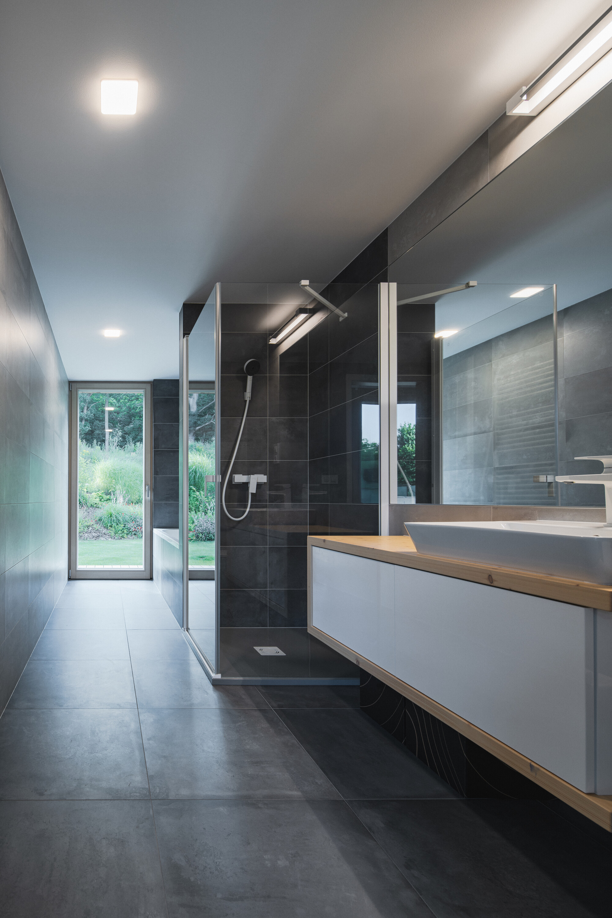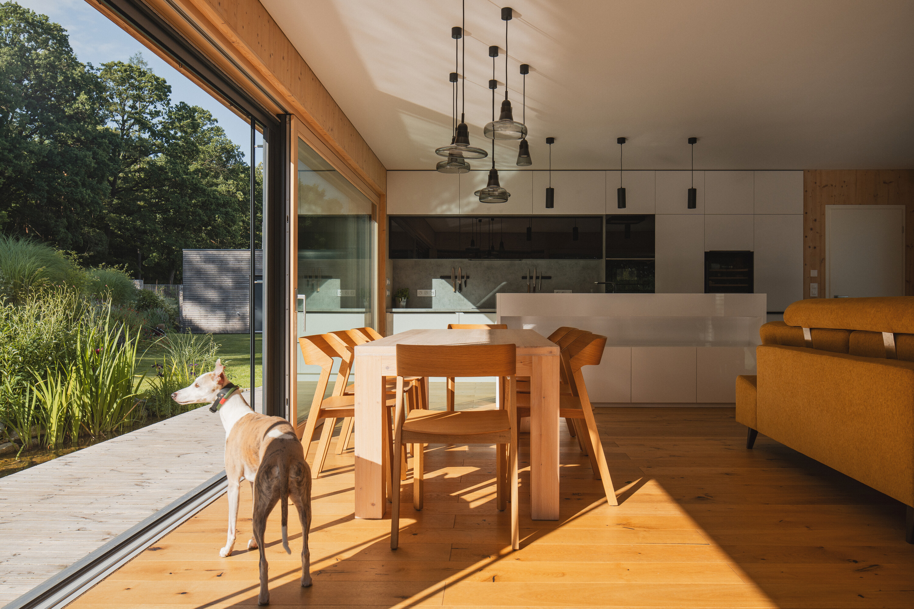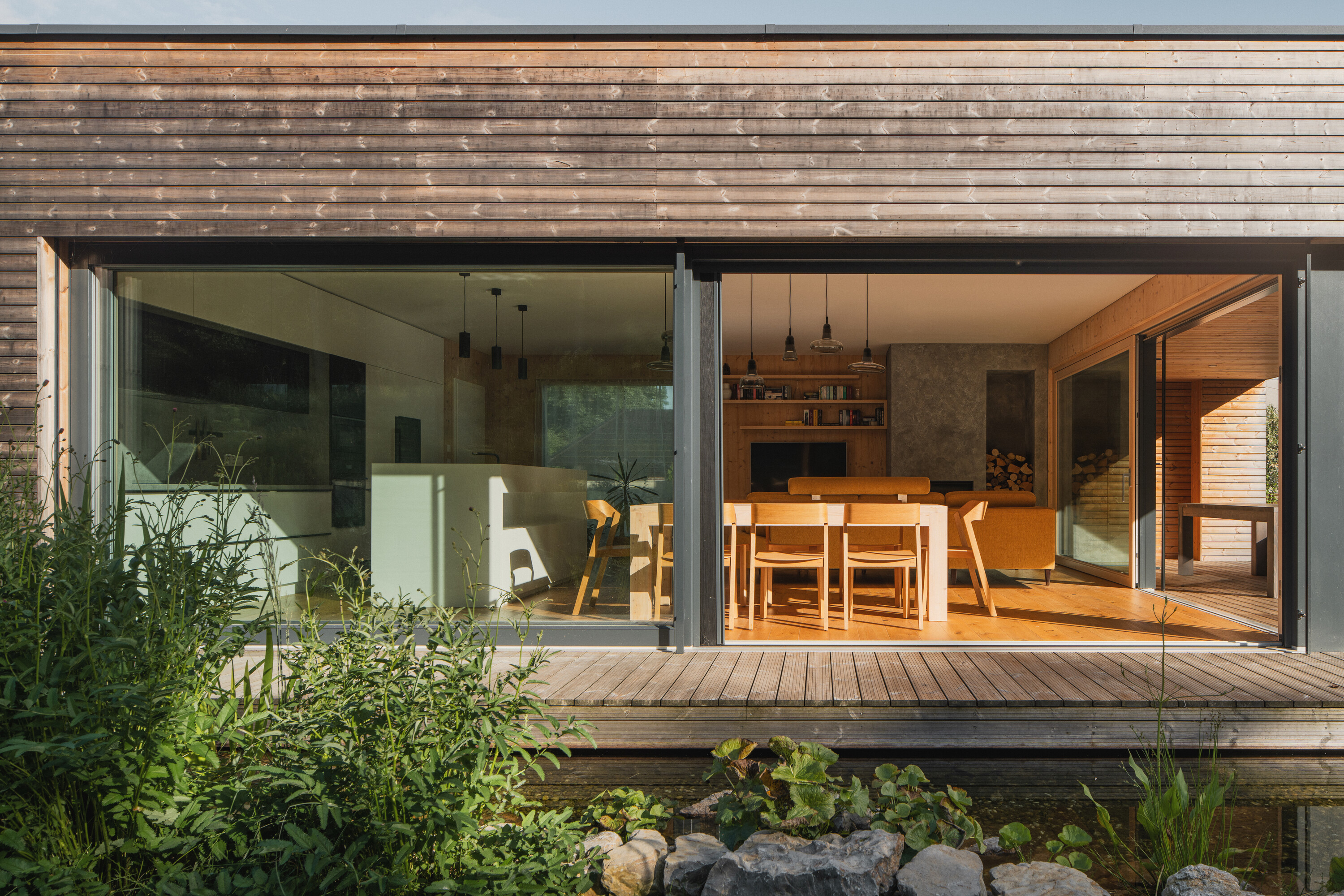 정원의 중심에는 수영 연못(schwimmteich)이 자리한다. 거실과 이어지는 목재 데크와 맞닿아 집의 일상 풍경을 구성하는 핵심 요소가 된다. 두 개의 대형 슬라이딩 포털(HS 포털)이 실내외의 경계를 지우며 거실–테라스–정원이 하나의 연속된 생활 장면을 완성한다.