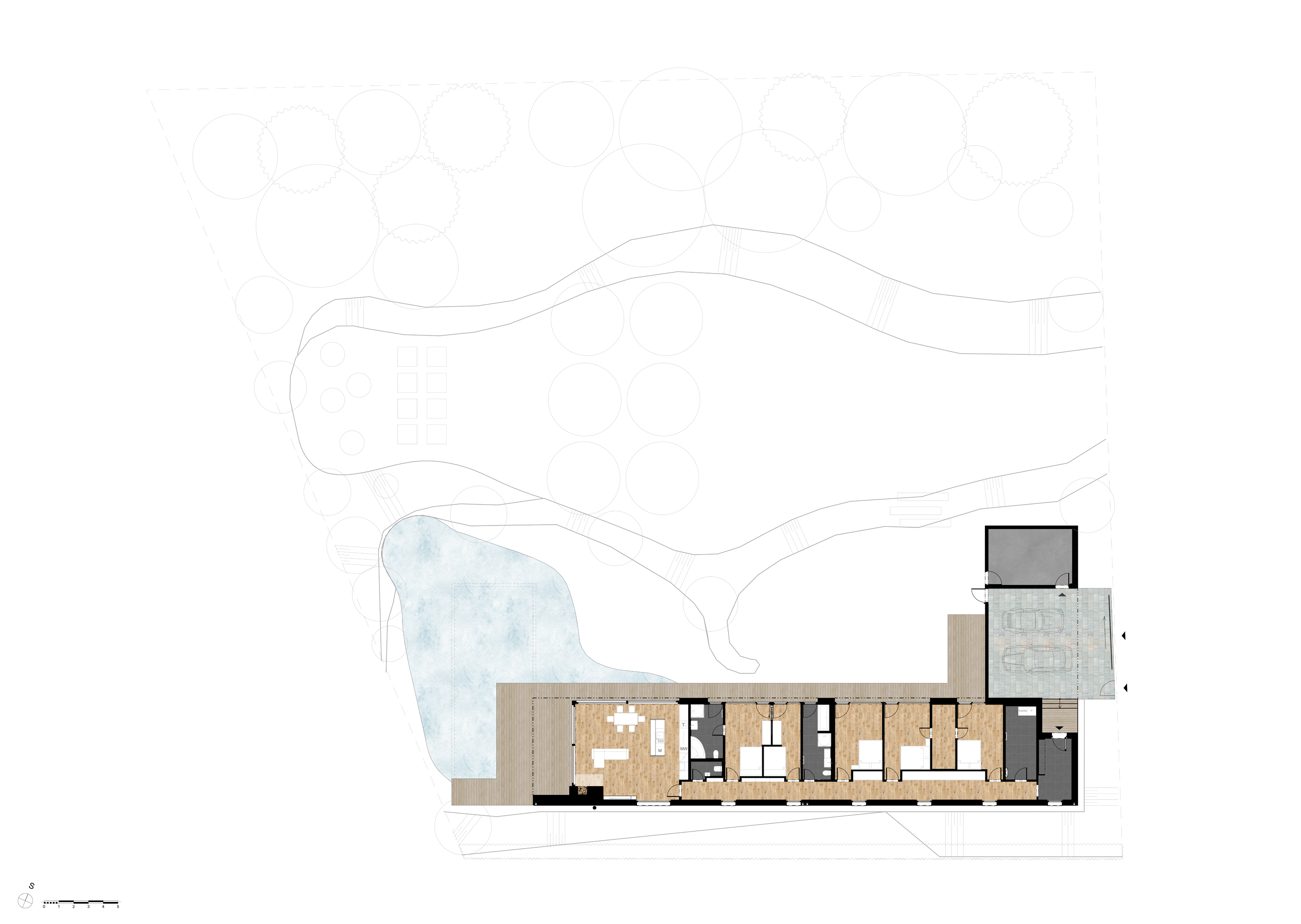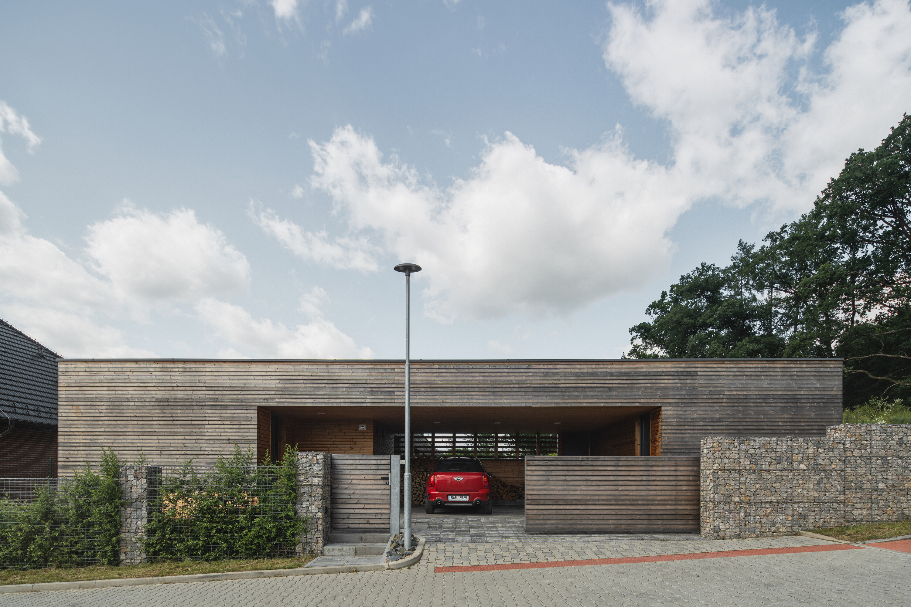 건물은 ㄱ자 배치로, 완만한 경사를 자연스럽게 흡수하며 구성된다. 도로 측에서는 낮고 폐쇄적인 인상을 주어 주변 마을과 조화를 이루고 사생활을 보호하지만, 내부로 들어서면 반대로 정원과 깊게 연결되는 열린 공간이 펼쳐진다. 경사지 위에 조성된 테라스형 정원은 숲으로 이어지며, 실내의 연장선처럼 작동한다.