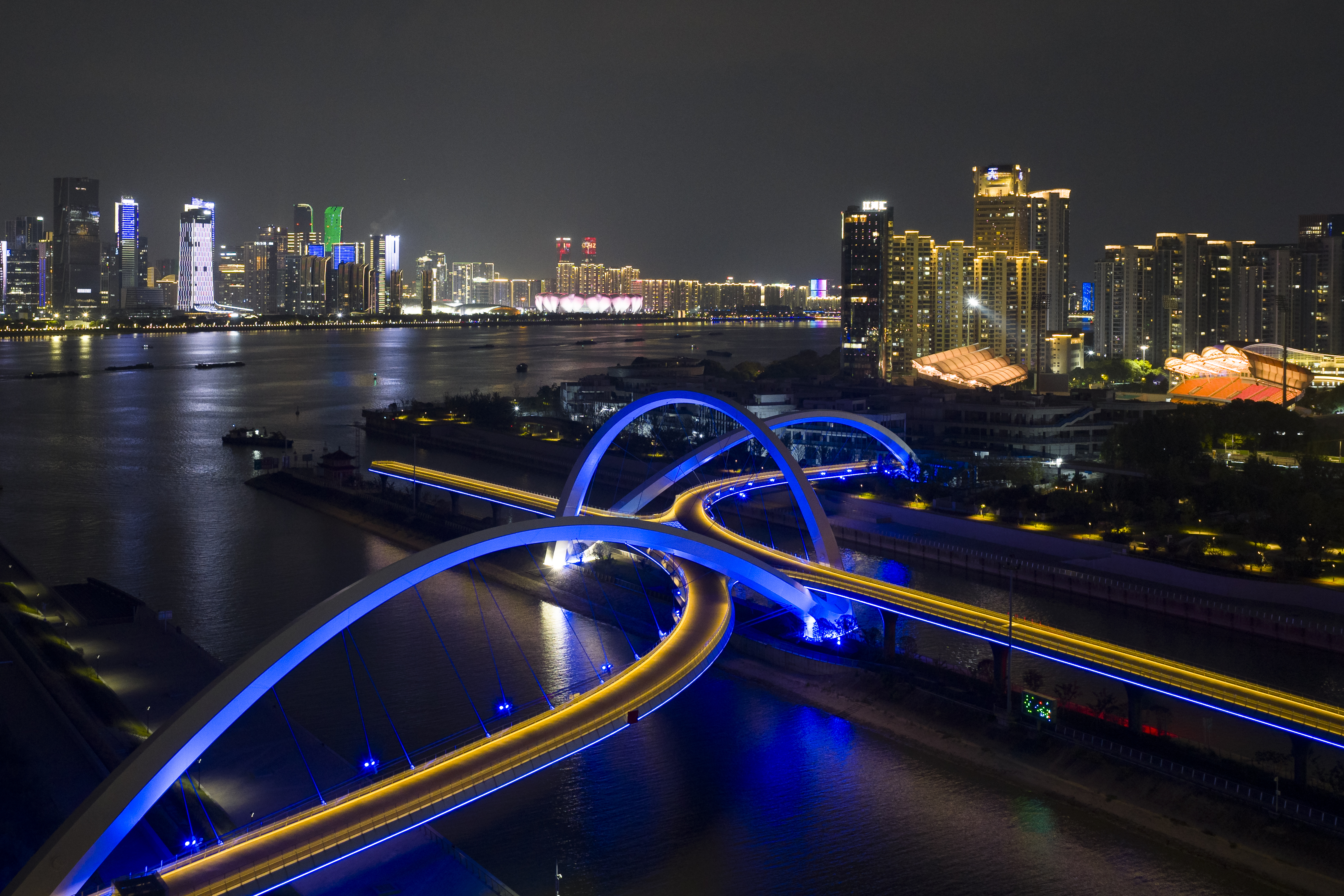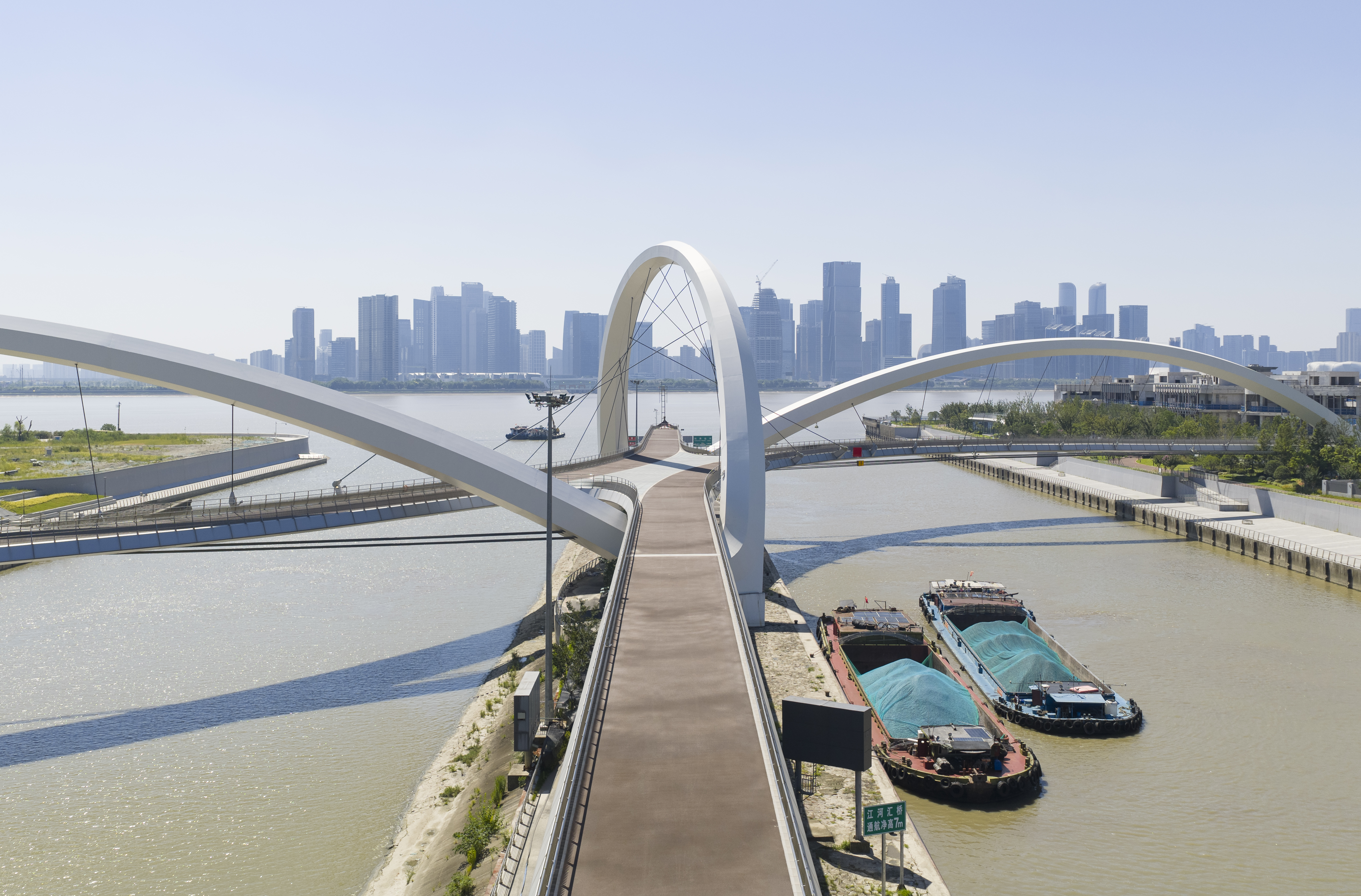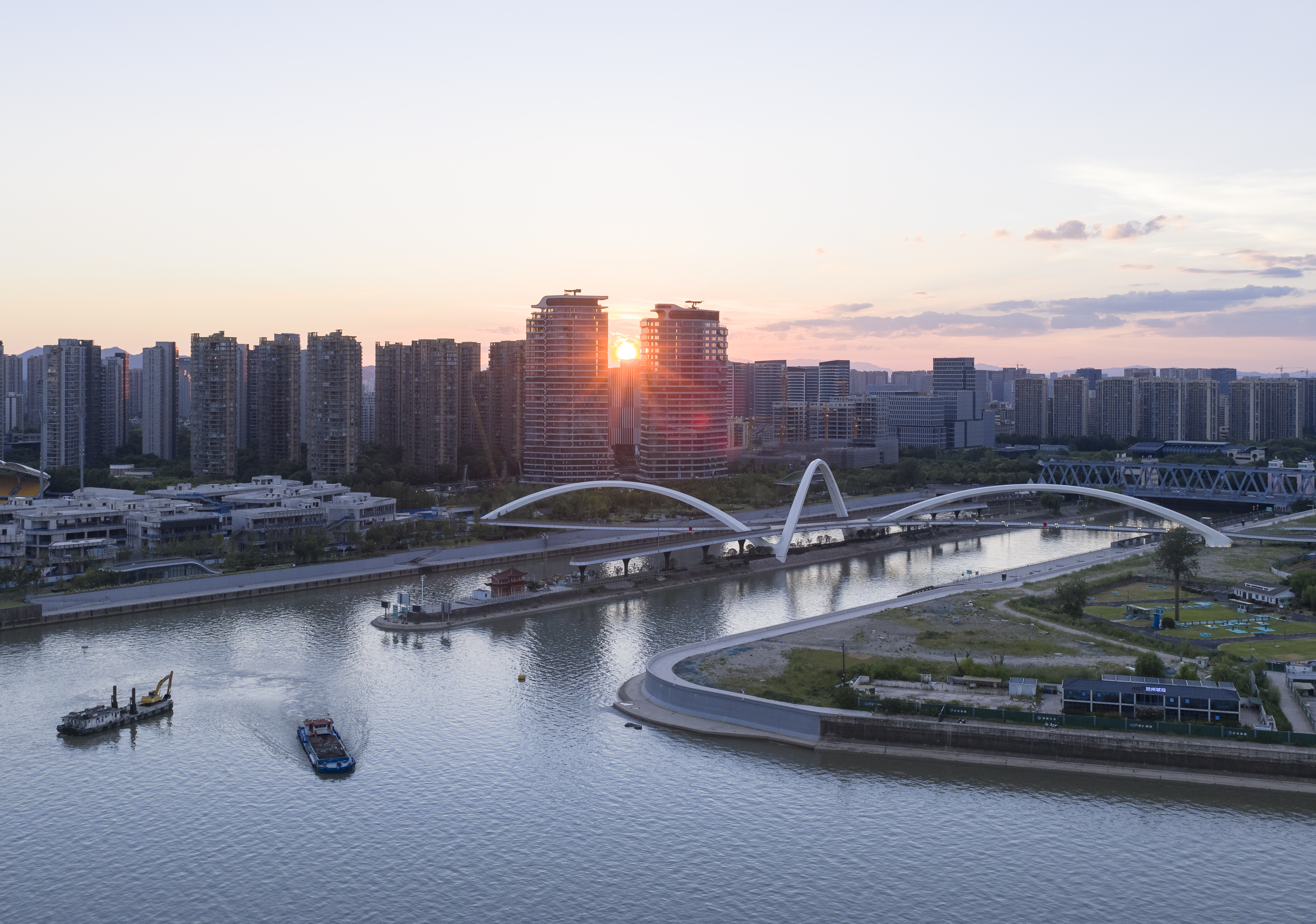 항저우는 전통 자수와 실크 공예로 유명한 도시다. 건축가는 이 지역의 문화적 맥락을 ‘직조’의 개념으로 해석하며, 교량의 구조를 실처럼 엮이고 겹치는 선형 시스템으로 구현했다. 세 개의 강철 아치가 얽힌 형태는 보행자와 자전거 이용자를 위한 부드러운 흐름을 만들며, 도시의 동·서측을 시각·동선 모두에서 자연스럽게 결합한다.
