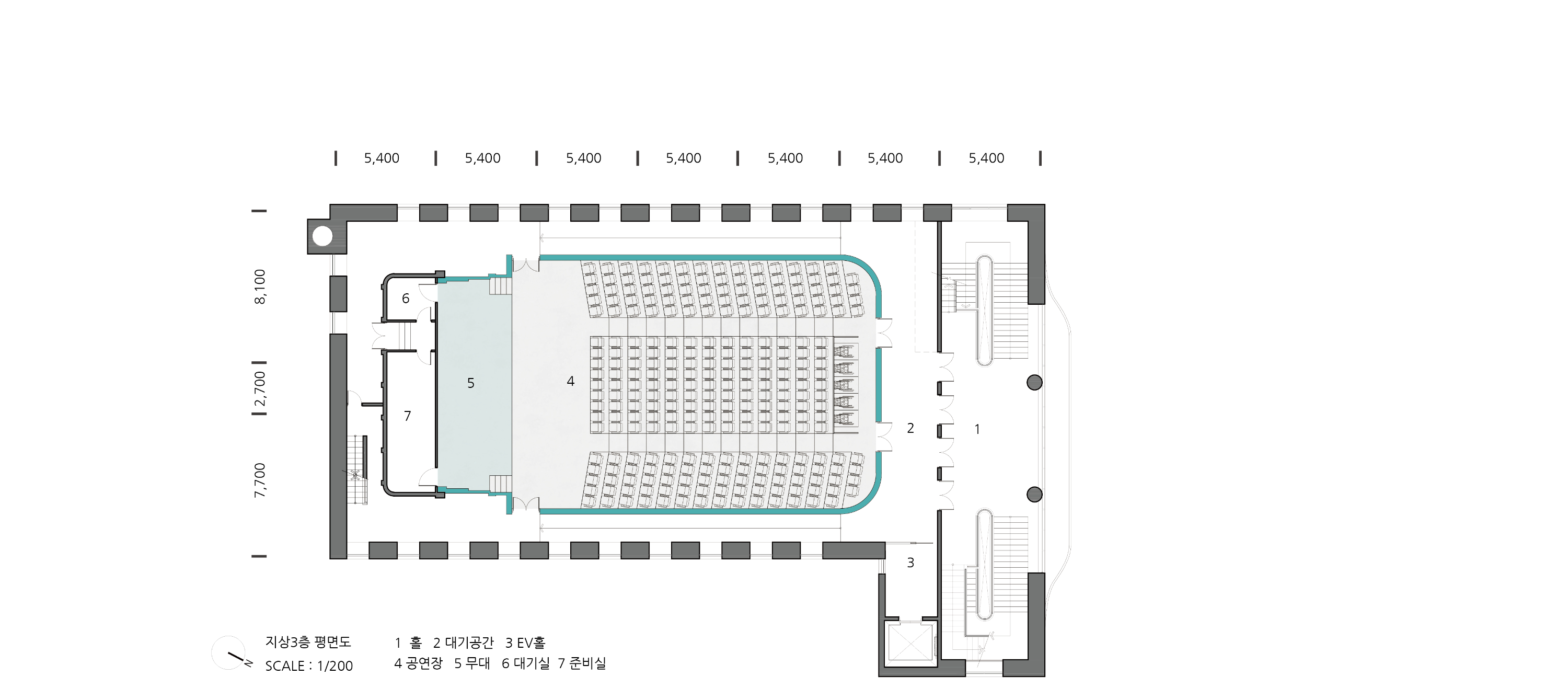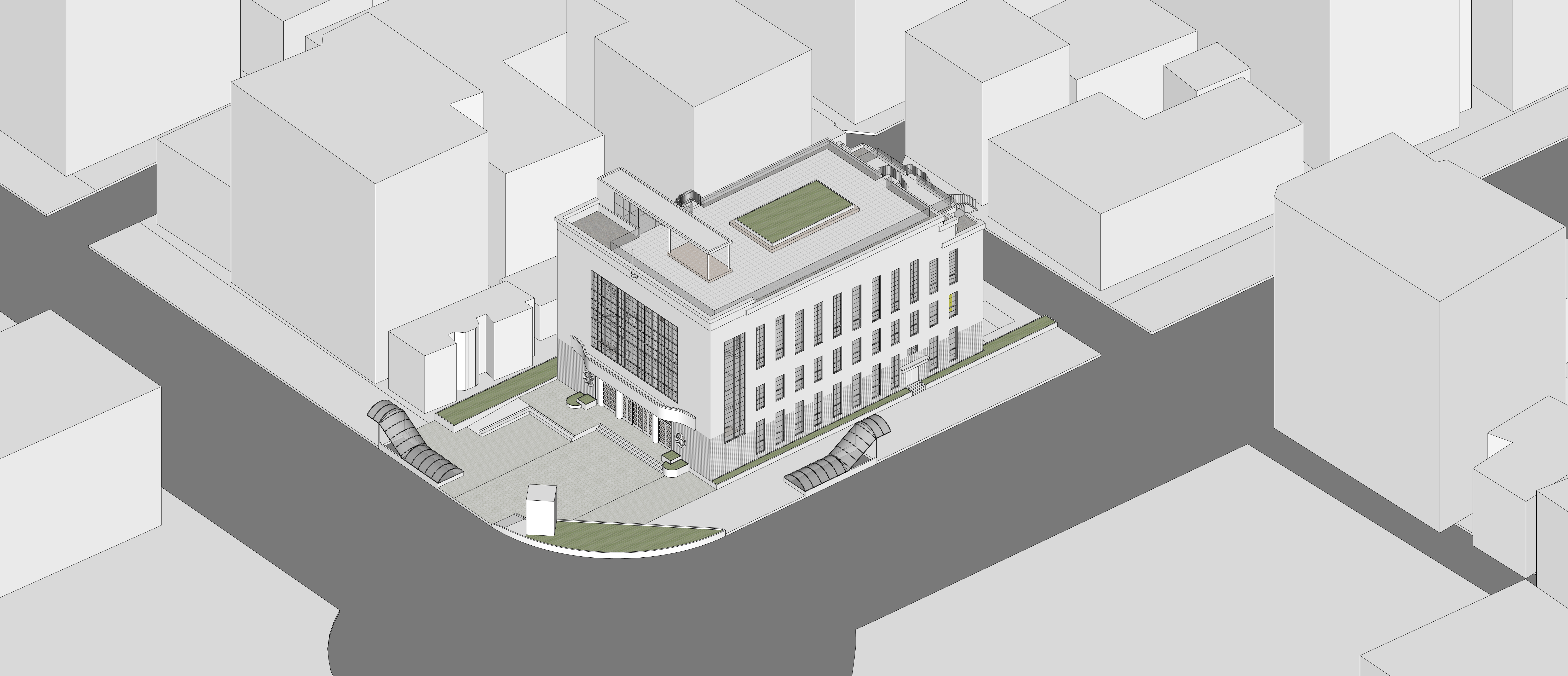 - 공회당 3층의 공간은 9미터의 층고를 이용한 강당을 계획한다. 3층 복원의 주요 요소인 출입구의 아치문과 영사실을 복원한다. 층고를 고려하여 냉난방은 바닥공조를 활용하고, 천장에 공기 순환을 위한 설비를 설치한다. 공연장은 약 3m의 벽으로 구분하고 벽체는 전시와 북카페로 활용을 고려하여 다목적화한다. 2층의 화장실 사용을 고려한 보도를 계획하고, 공연준비를 위한 준비실을 설치한다. 승강기홀은 공연을 고려하여 별도의 공간으로 구획한다. 3층은 공연장으로 사용이 되도록 계획하지만 객석의 수에 비해 좌석의 전체 바닥의 높이 차이는 1m도 되지 않아 적절한 시야각의 확보가 어렵고, 300명의 인원의 대기공간의 부족, 공연장으로 사용시 실 사용률의 저하를 고려하여 북카페를 바탕으로한 다목적 공간에 대한 계획을 제안한다.