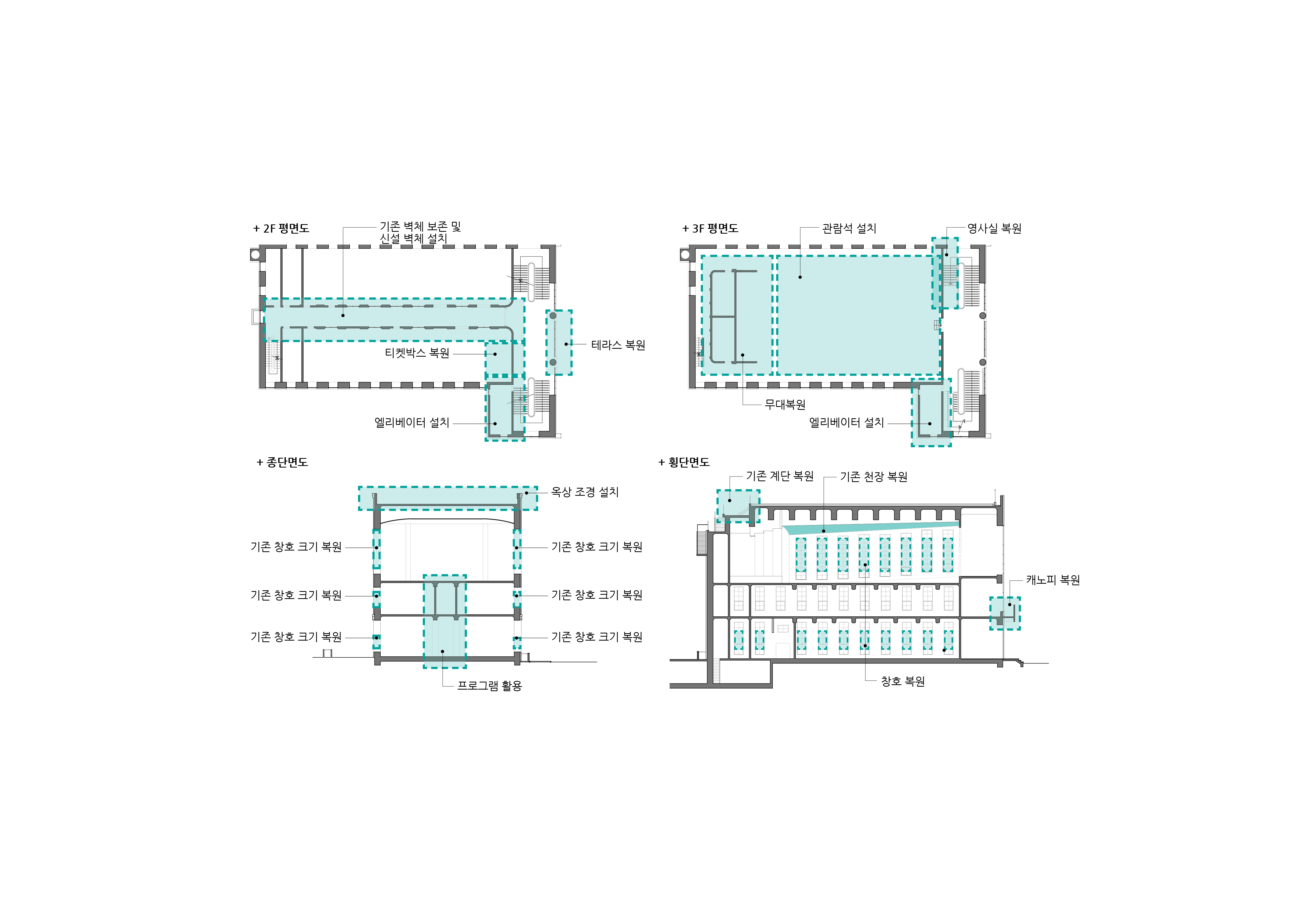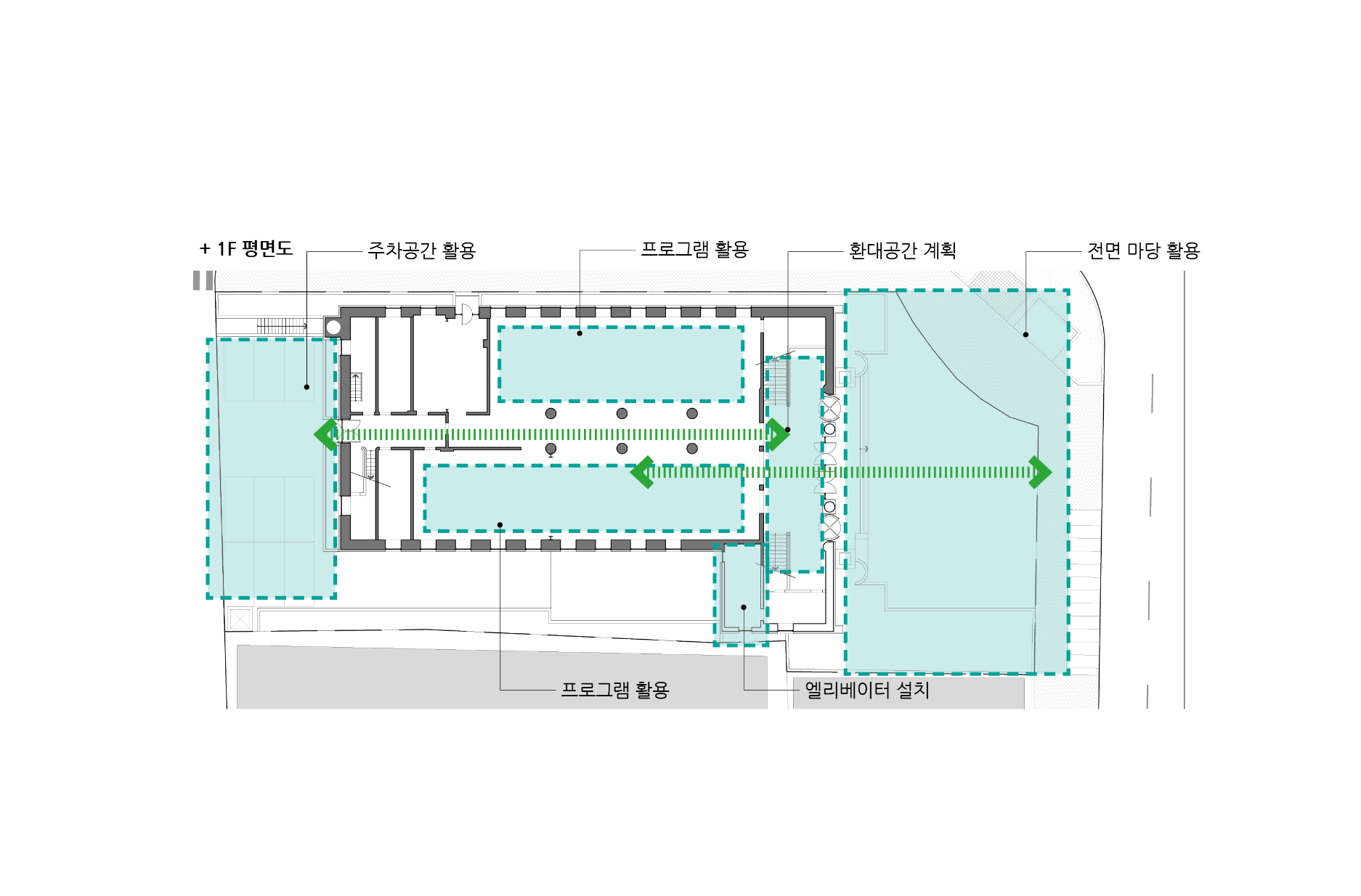 - 옥상의 활용도와 기존 구조의 안정성과 누수의 위험성을 최소화 하기 위해 엘리베이터 설치는 건축물의 주요공간과 분리된 기존의 공조설비 공간을 활용하여 설치한다. 옥상의 공간은 최소한의 활용을 권장하며, 조경의 설치도 건축물의 노후화와 누수의 위험성을 고려하여 위치를 한정하고, 무근콘크리트의 제거, 페데스탈 건식마감을 적용하여 하중에 대한 구조의 부담을 최소화한다.