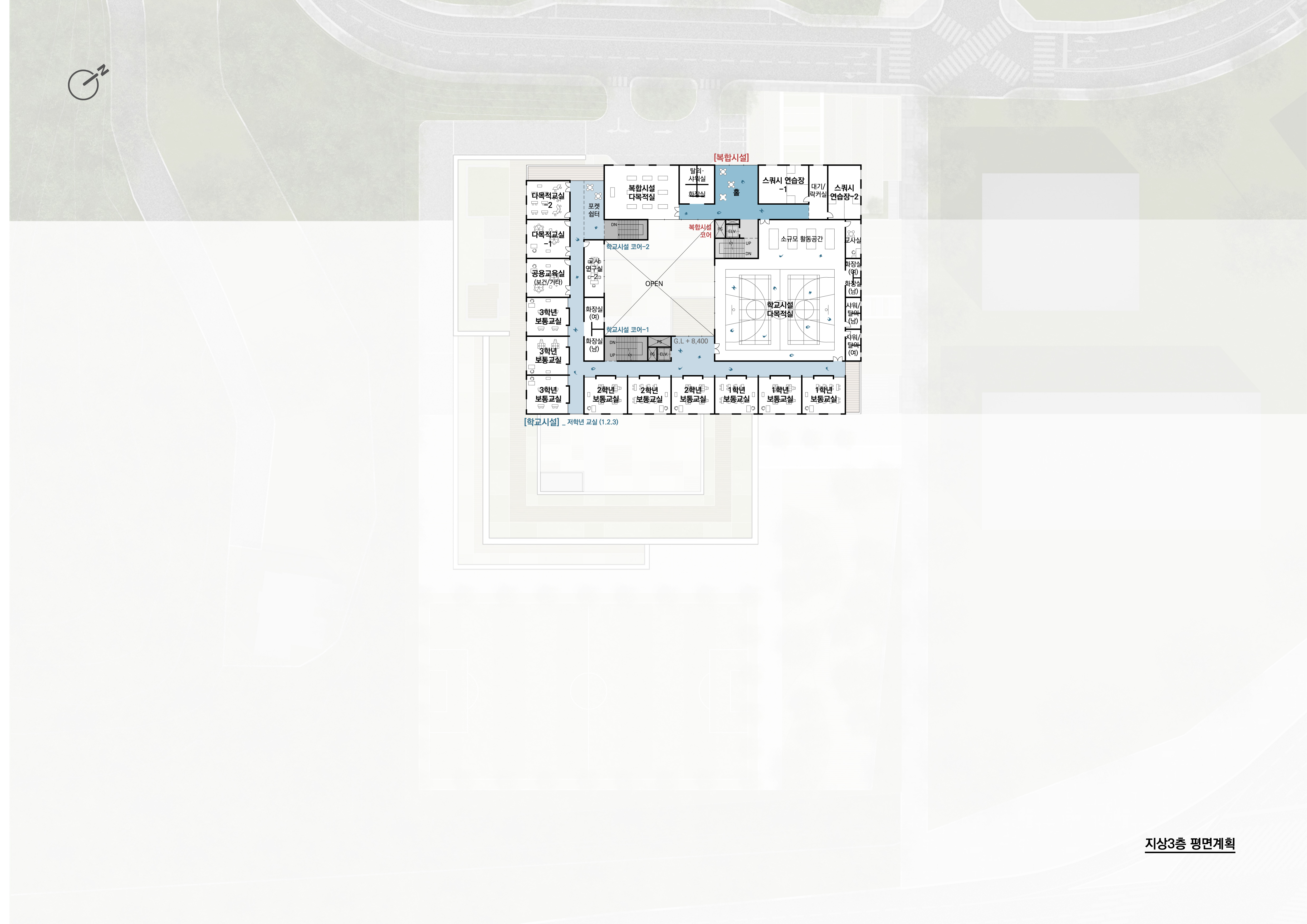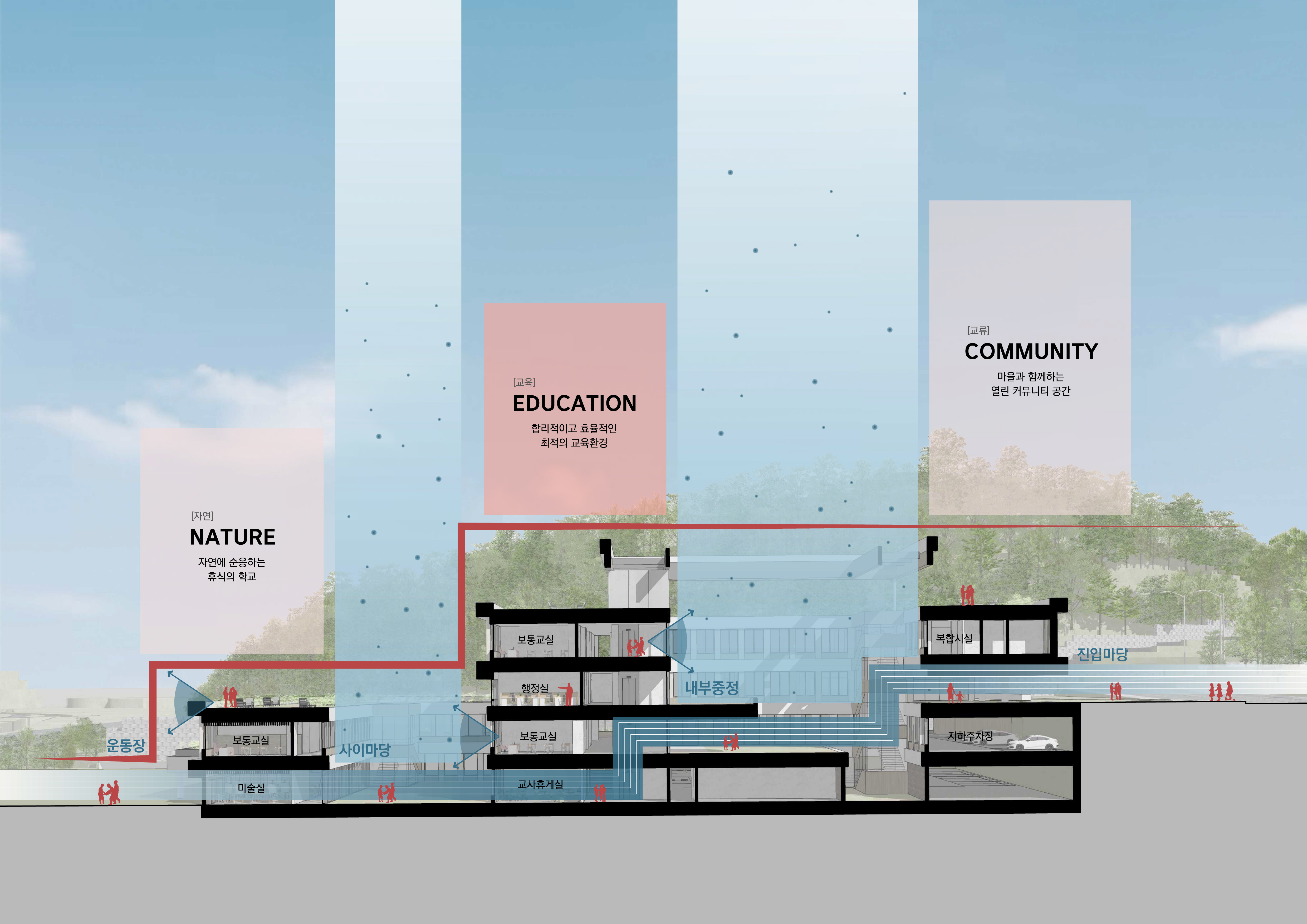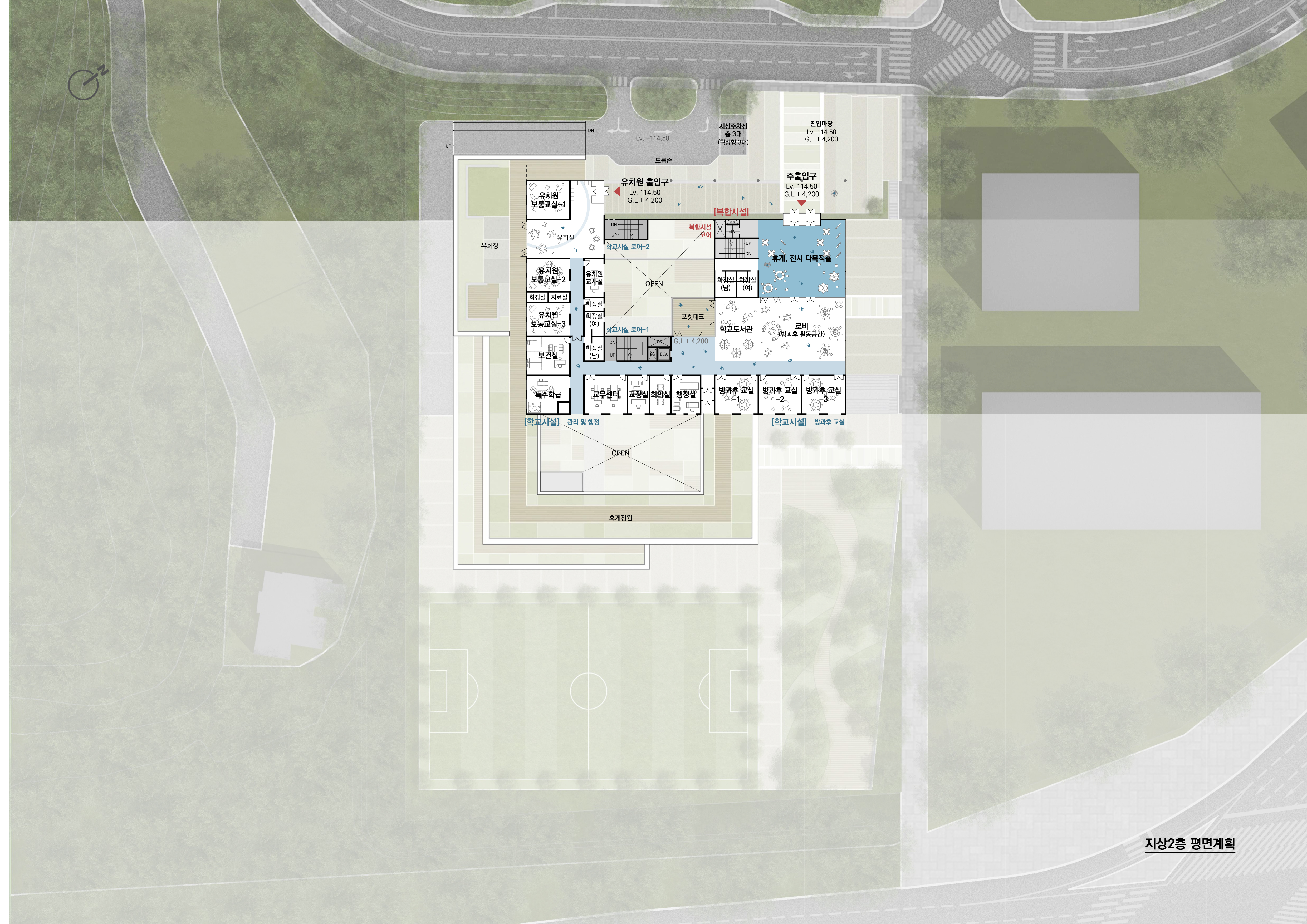 경사 지형의 특성을 고려하여 세 가지 진출입 레벨을 통해 다양한 외부공간과 동선을 형성하게 된다. 진입부와 넓은 진입마당이 조성되어 학교의 중심적인 출입 공간으로 기능하는 진입레벨, 지역 개방형 시설과 연계된 외부마당을 통해 주민과 학생이 만나는 접점을 제공하고, 마을과 학교가 함께 어울리는 열린 생활축을 만드는 부진입레벨과 운동장과 직접 맞닿아 학생들의 체육활동과 생활공간을 넓혀준다. 학교의 일상을 지탱하는 기반이 되는 운동장 레벨은 경사지의 맥락을 존중하면서도 학습·생활·지역 교류가 입체적으로 확장되는 교육환경을 구현한다.