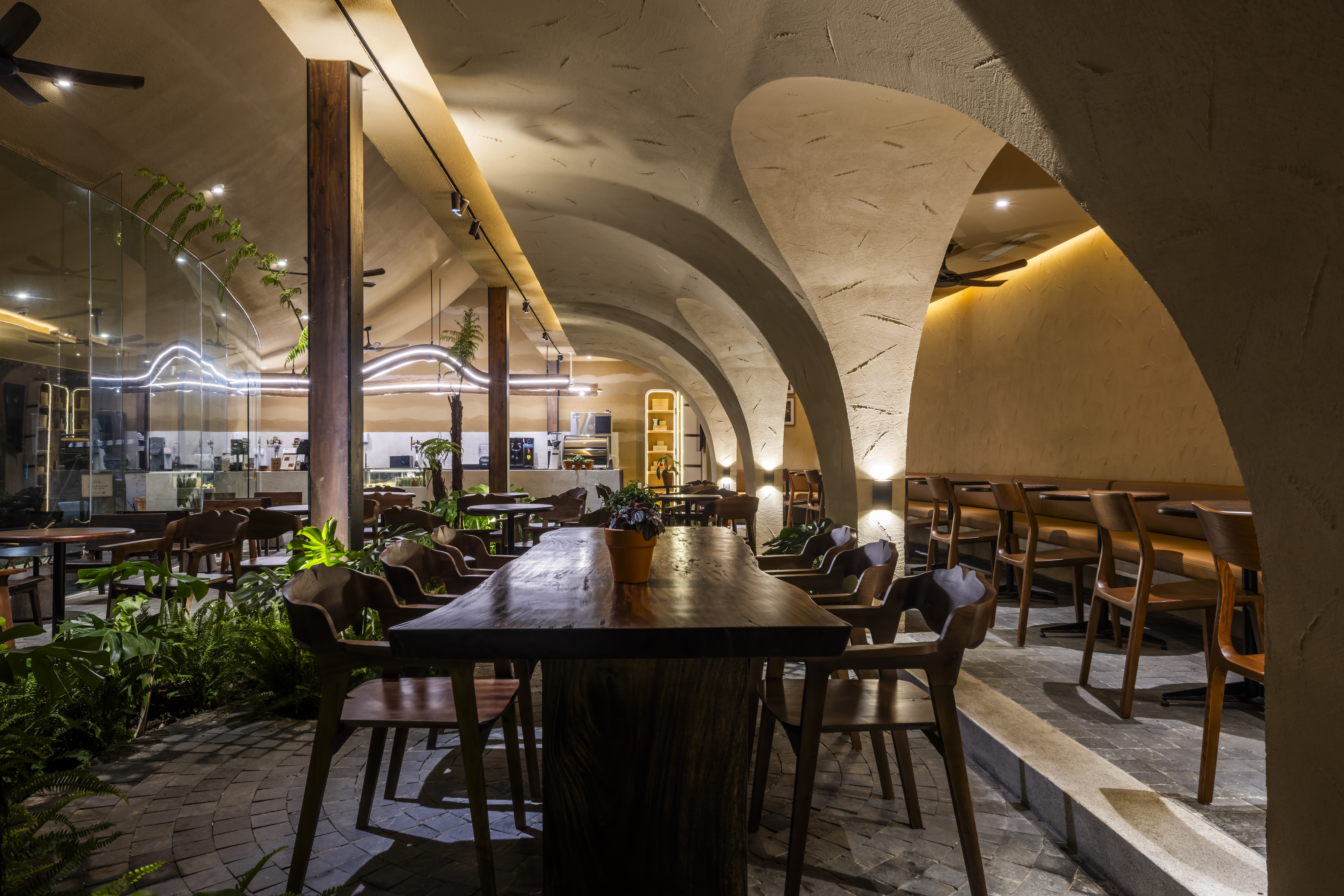 밤이 되면 빛은 다시 공간의 주인공이 된다. 은은한 LED 조명이 흙다짐 벽의 결을 드러내고, 나뭇결과 라탄의 짜임을 돋보이게 하면서 건물을 하나의 조용한 풍경처럼 만든다. 야외석은 녹지와 자연 소재로 둘러싸여 트로피컬 특유의 여유로운 공기를 품는다.