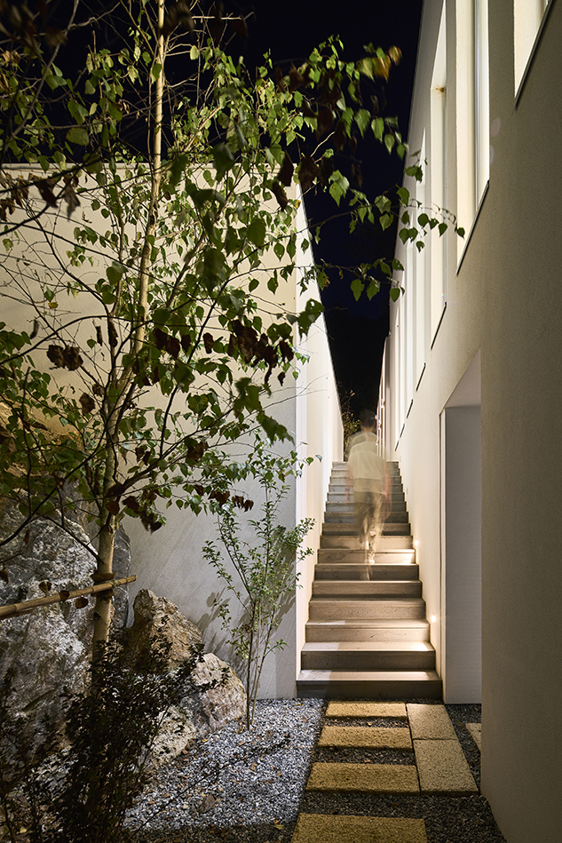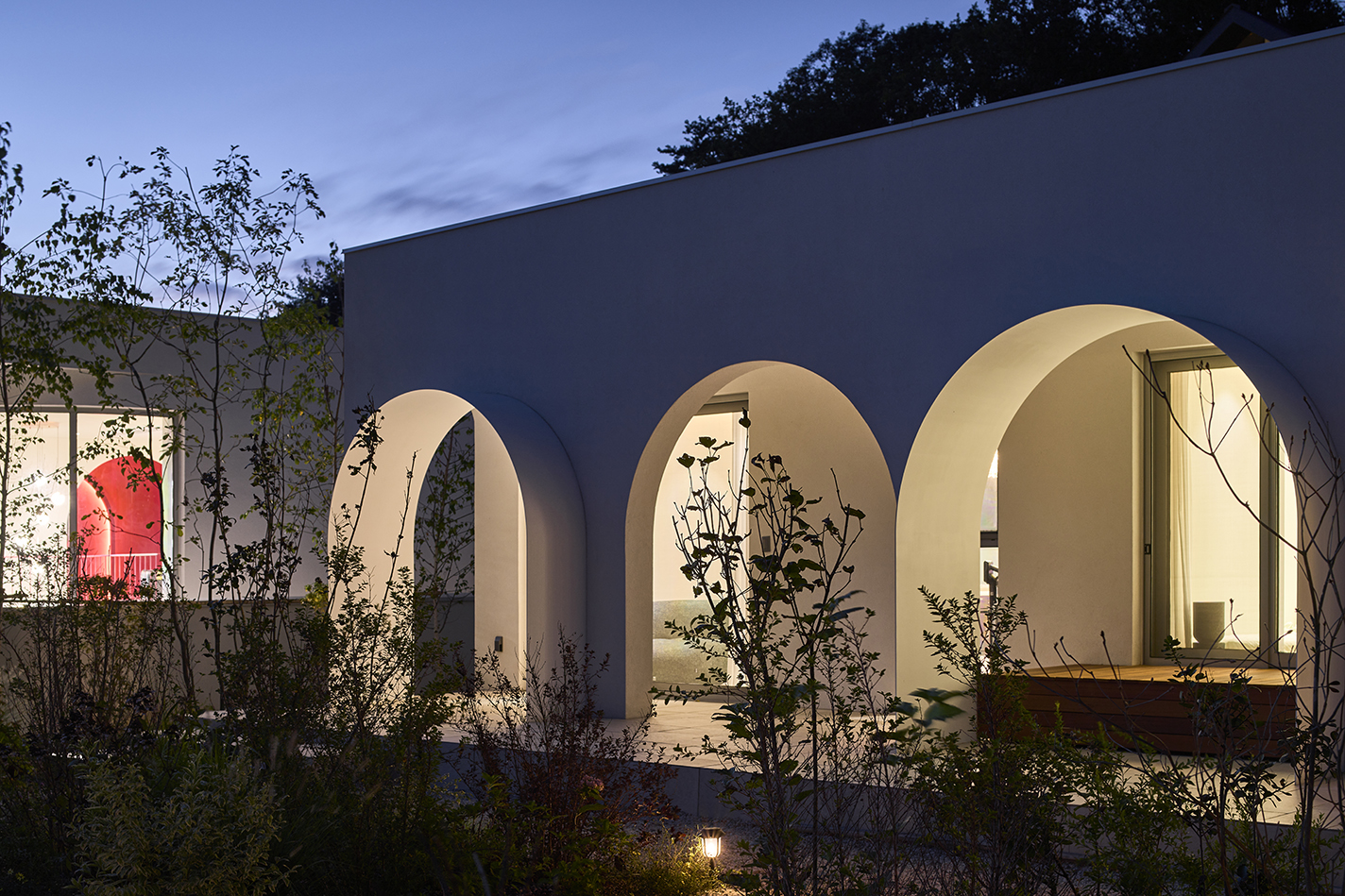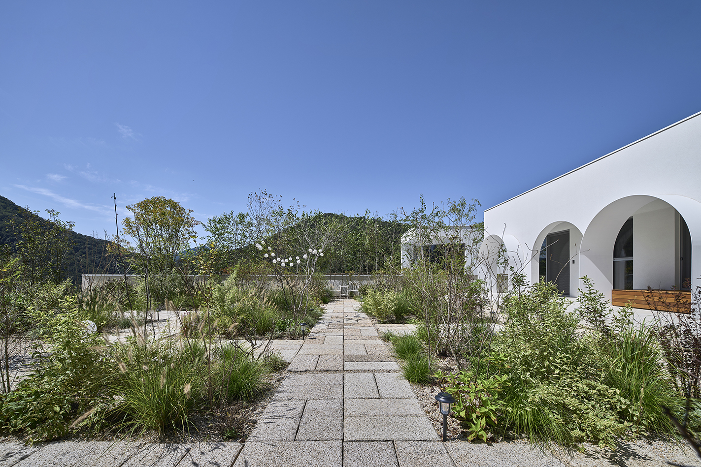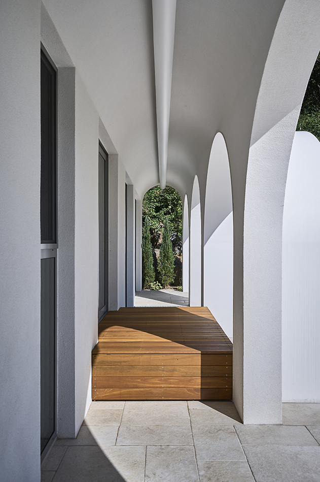 회랑에 수직으로 열리는 아치 틈새는 이 집의 또 다른 풍경 장치다. 멀리 산 능선과 하늘, 가까이 정원의 계절 변화가 아치 속에 프레임처럼 담기며, 시간이 천천히 머물다 흘러가는 감각이 만들어진다.
