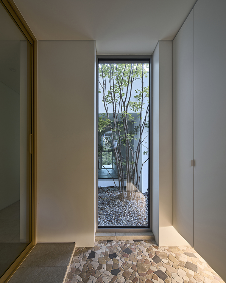 회랑에 수직으로 열리는 아치 틈새는 이 집의 또 다른 풍경 장치다. 멀리 산 능선과 하늘, 가까이 정원의 계절 변화가 아치 속에 프레임처럼 담기며, 시간이 천천히 머물다 흘러가는 감각이 만들어진다.