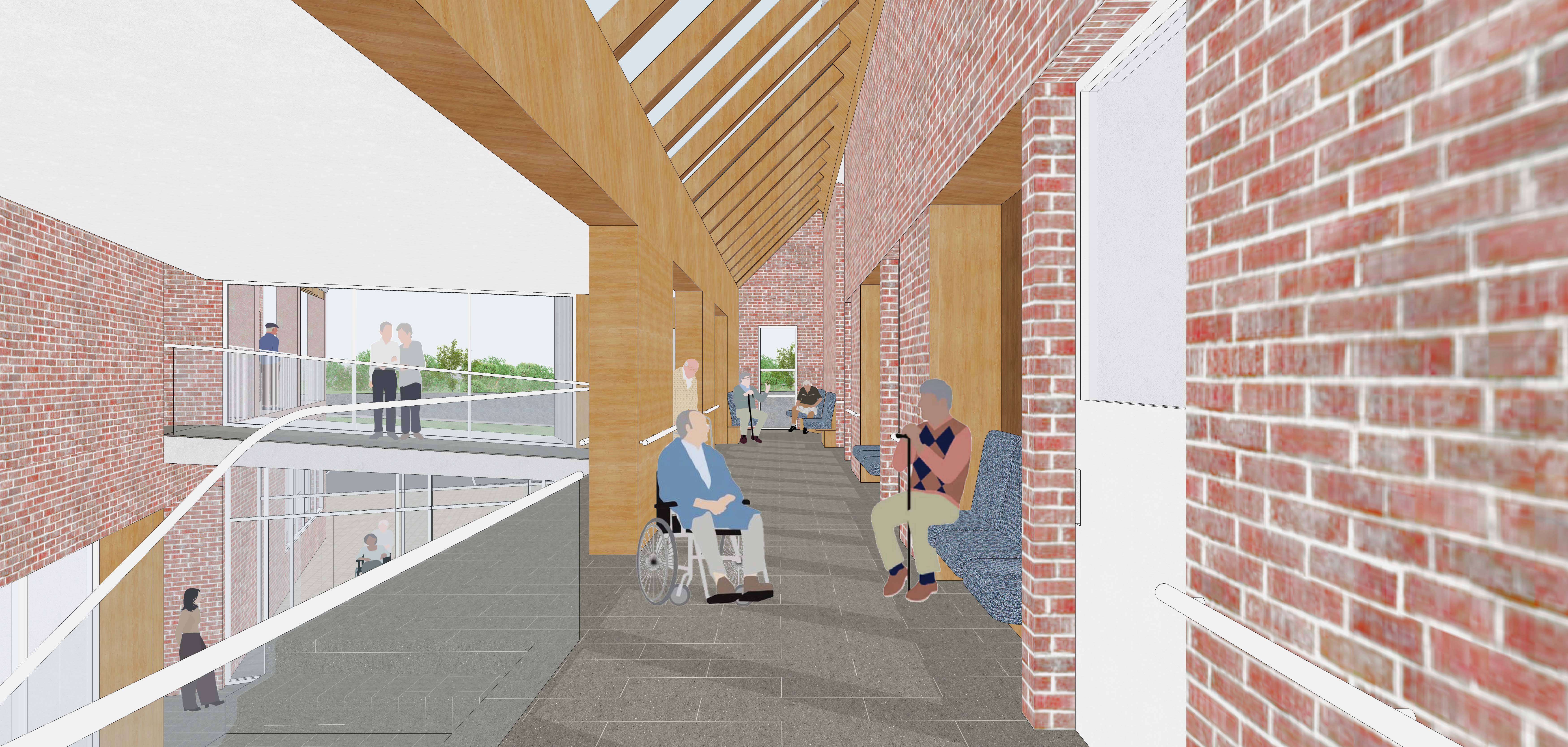침실과 같은 주요 생활실을 제외한 로비, 홀, 이동통로는 단순한 실내 복도가 아니라, 자연이 스며드는 반(半)외부적 공간으로 계획하였다. 천창과 커튼월을 통해 문을 나서는 순간 안마당에 들어선 듯 밝고 열린 공간감을 느낄 수 있으며, 이를 통해 거주자는 건물 안에서도 시간과 계절의 변화를 체감한다. 완만한 경사로 형성된 이동 동선은 노인들이 거닐며 자연스럽게 운동할 수 있는 걷는 풍경을 만들고, 이는 건물의 내부와 외부에서 동시에 인식된다. 이러한 공간은 건물을 단순한 거주의 틀을 넘어, 지역사회와 일상의 활동과 풍경을 공유하는 열린 복지 공간으로 확장시킨다. 매스 사이의 틈과 연결부는 자연을 건물 안으로 자연스럽게 받아들이고, 동시에 사람들의 움직임과 시선을 이끌어 내부와 외부, 개인과 공동체가 차츰 가까워지는 경험을 만든다.