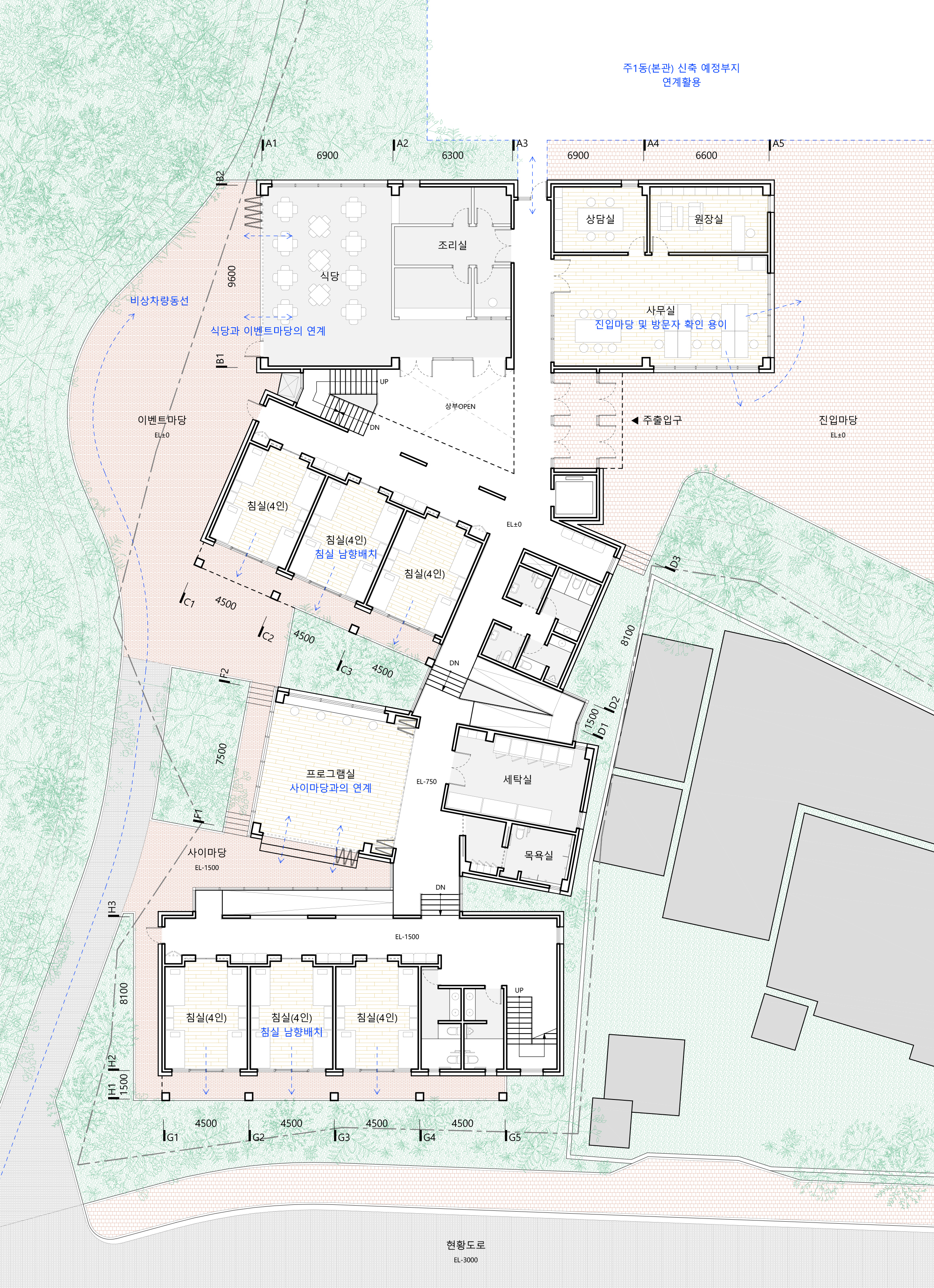 네 개의 매스는 서로 투명한 이동공간으로 연결되어 있으며, 각각의 바닥 레벨에 높이차이를 두었다. 이는 북쪽으로 갈수록 높아지는 기존 대지 레벨에 순응한 결과로, 건물이 지형의 흐름과 연속성을 자연스럽게 받아들이도록 계획하였다. 이러한 단차계획은 모든 매스를 남향으로 배치하면서 매스 간 높이 차를 두어 햇빛이 깊숙이 스며들도록 한다. 또한 자연스럽게 형성된 매스 사이의 경사형 이동 공간은 노인들이 완만한 경사를 따라 거닐며 운동 및 산책할 수 있는 풍경을 만들어내며, 건물의 내외부에서 경험될 수 있도록 한다.