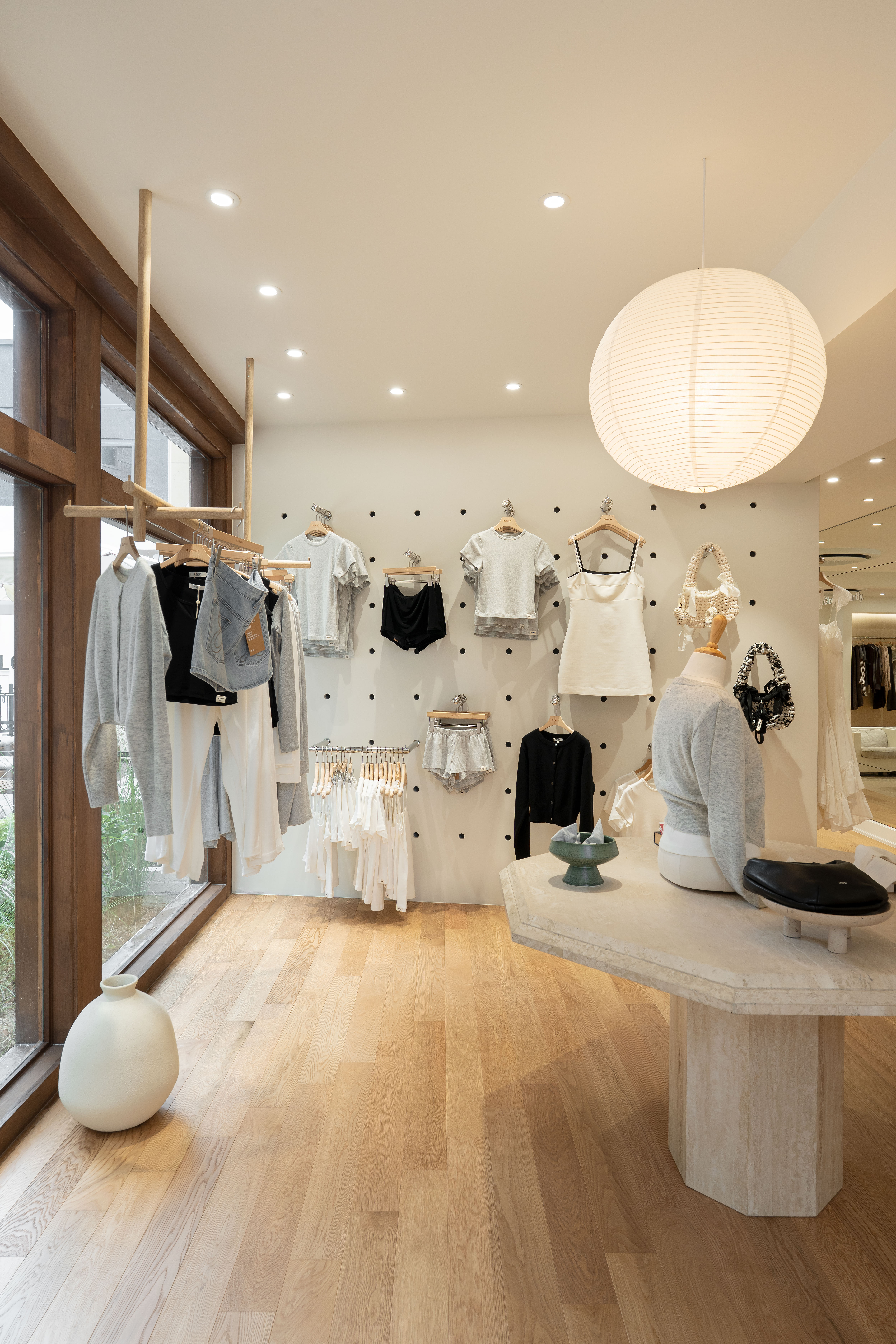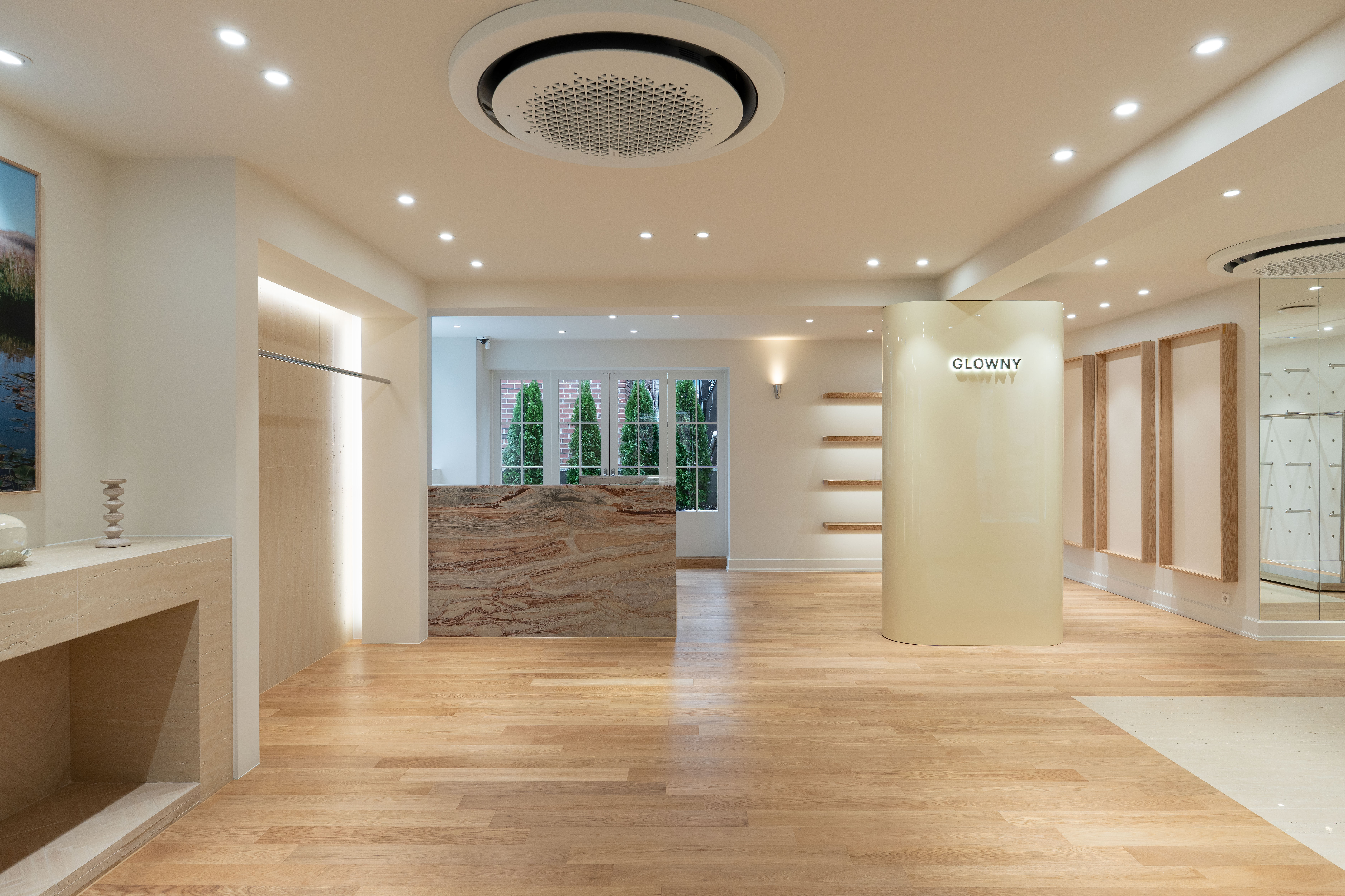 1층은 서양식 주택의 입구 공간인 포이어(Foyer)를 모티프로 삼아 ‘집에 초대되는 경험’을 설계의 중심에 두었다. 동선의 시작점에는 글로니의 슬로건을 모자이크 타일로 새겨 시각적 장면을 만들었고, 전체 공간은 리빙룸의 분위기를 바탕으로 구성했다. 특히 오브제 역할을 하는 페치카와 소파가 배치된 영역은 바닥 재료를 원목 마루에서 트래버틴 타일로 전환해 공간감을 분리했다. 트래버틴 카운터, 블루엔젤 식재, 클래식한 테라스 도어는 이국적이면서도 감각적인 분위기를 형성했다. 중앙 구조물과 선반장에 적용한 ‘버터 컬러’는 도산 플래그십을 대표하는 새로운 키컬러로, 글로니의 시그니처 무드를 한층 강화했다. 한지 팬던트 조명, 미니멀한 우드 행거, 수국 조경 등이 더해진 테라스 구역은 따뜻하고 여유로운 공간으로 완성되었다.