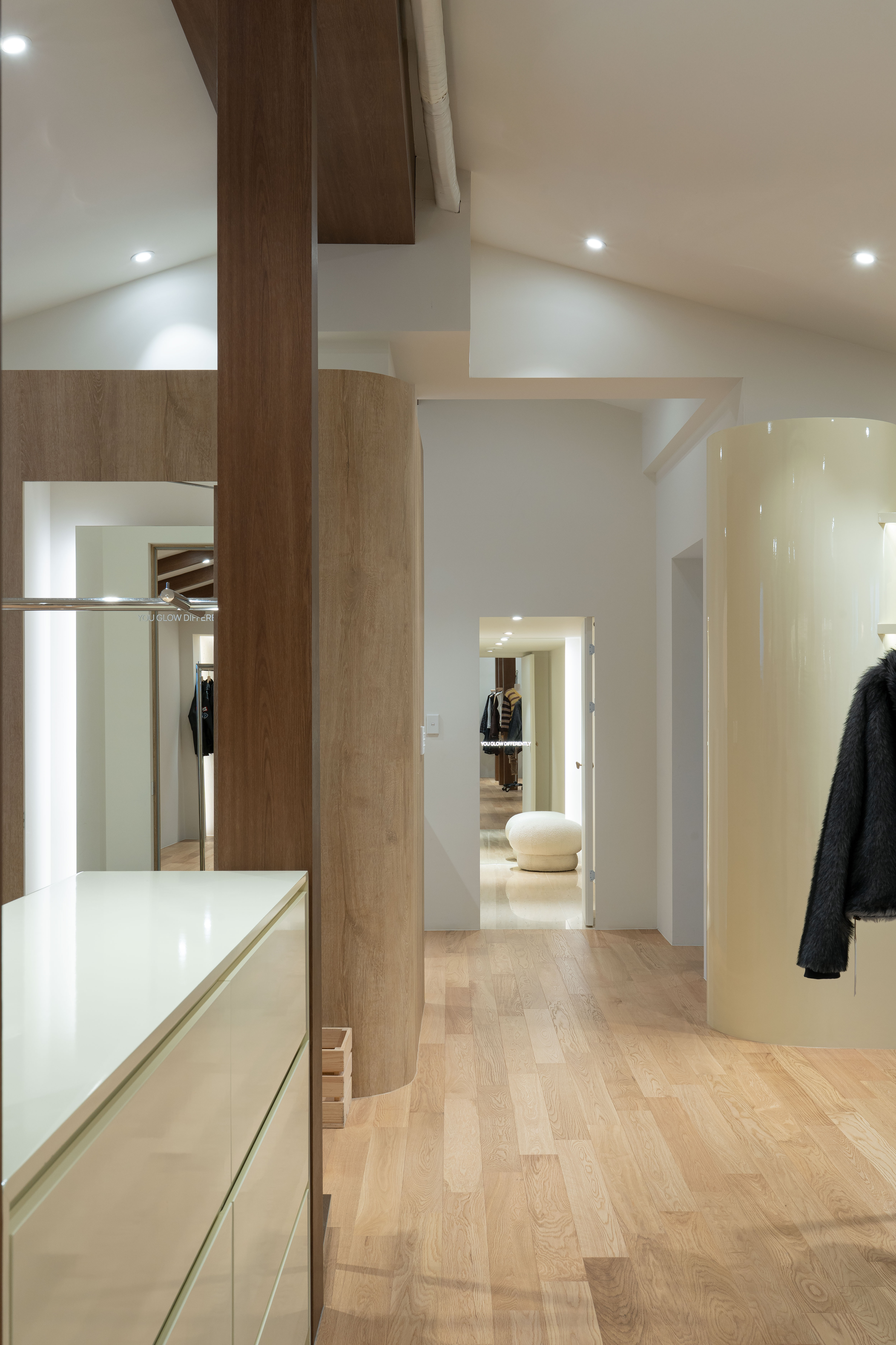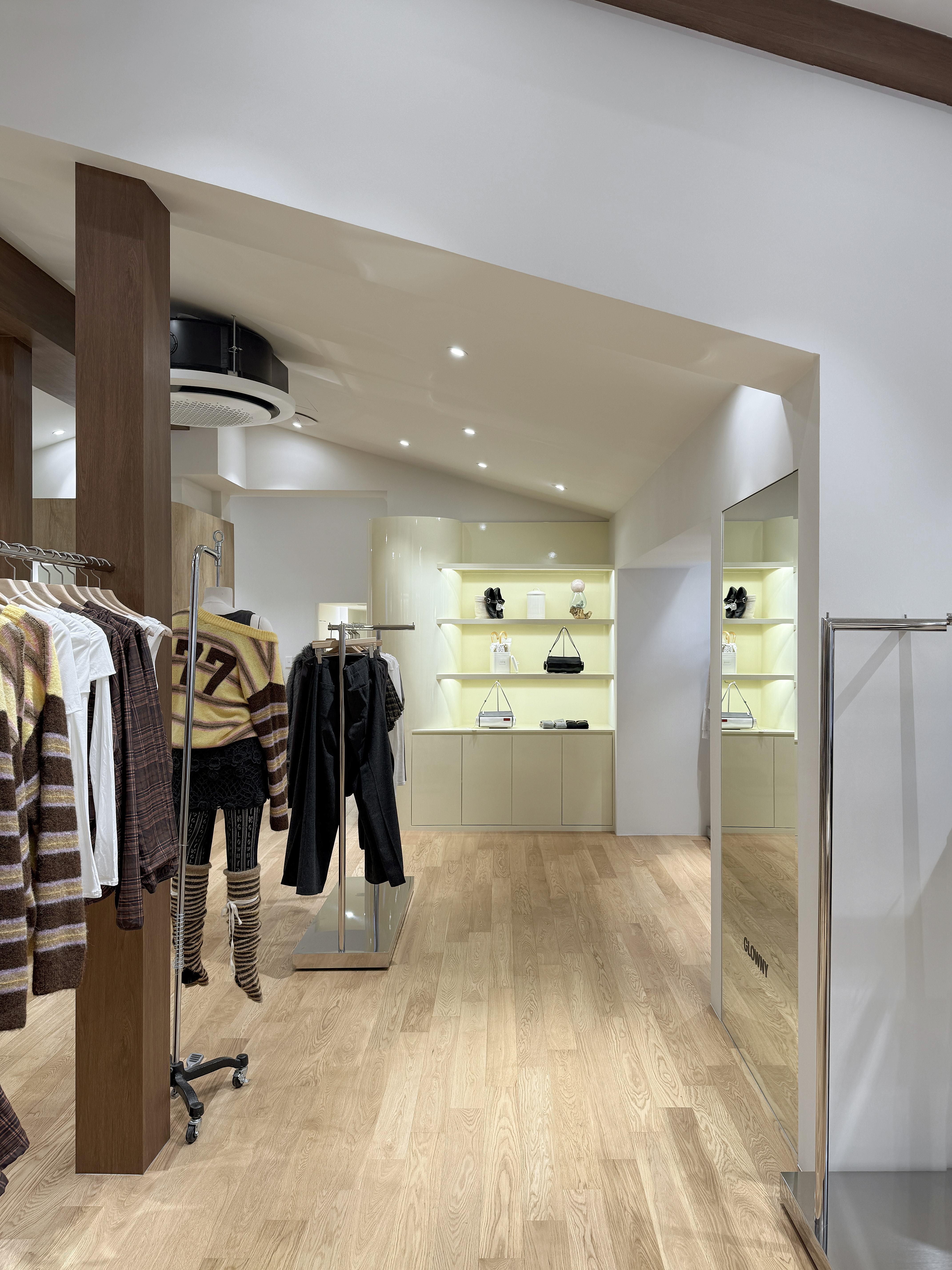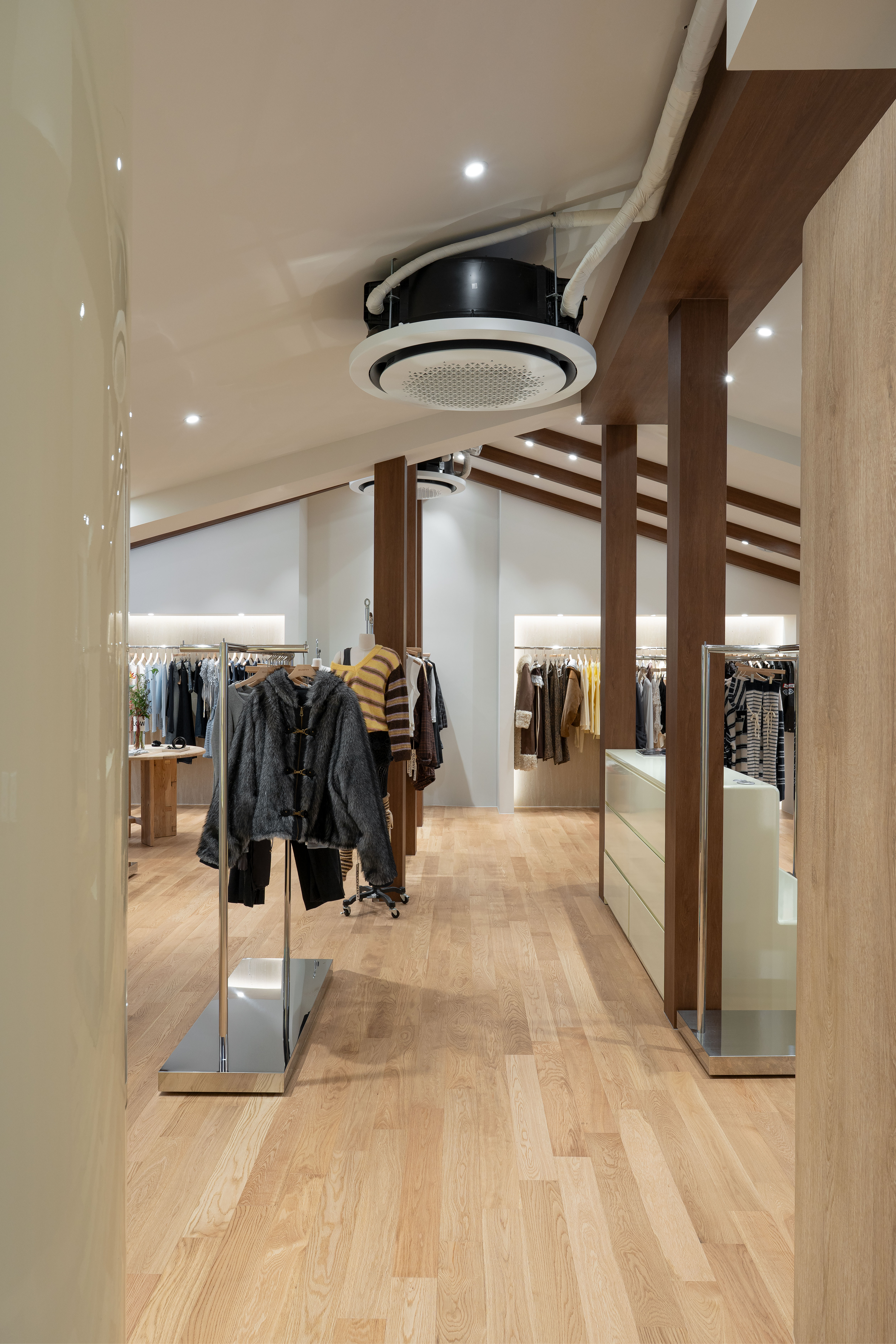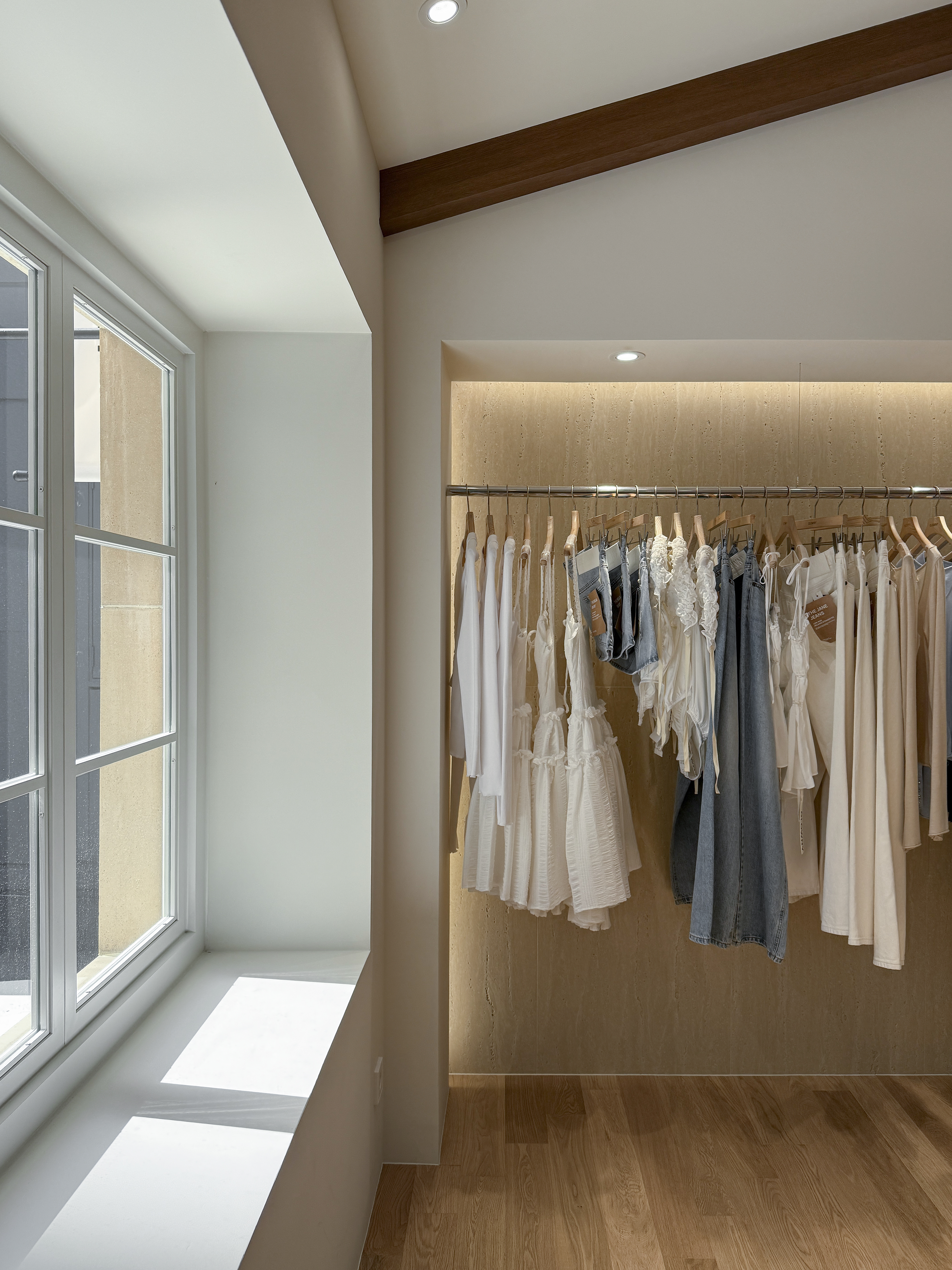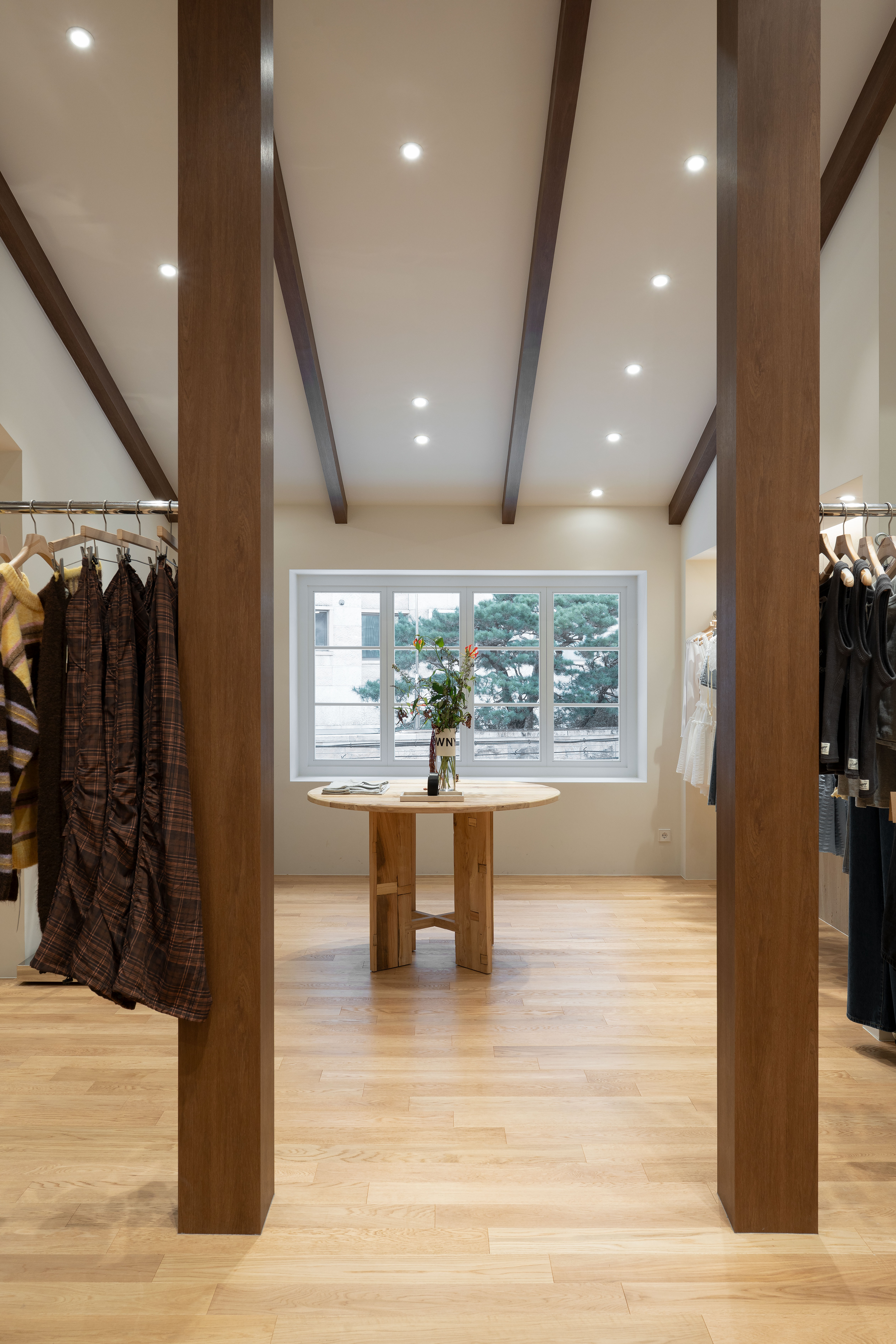 2층은 기존 건물이 지닌 박공 천장 구조를 적극적으로 활용했다. 노출된 목재 서까래는 직선과 사선이 만드는 구조적 리듬을 강조하며, 아늑한 주택의 분위기를 자연스럽게 이끌어냈다. 이곳의 선반 가구와 벤치 겸용 카운터 또한 1층과 동일한 버터 컬러로 제작해 전체적인 통일감을 형성했다. 코너에 R값을 적용한 피팅룸은 그린 모자이크 타일을 사용해 포인트를 주었고, 기존 화장실을 재구성한 VIP 전용 피팅룸과 DP존은 라틴 텍스처의 지사 벽지와 우드 소재가 어우러져 빈티지하면서도 목가적인 무드를 배가했다.