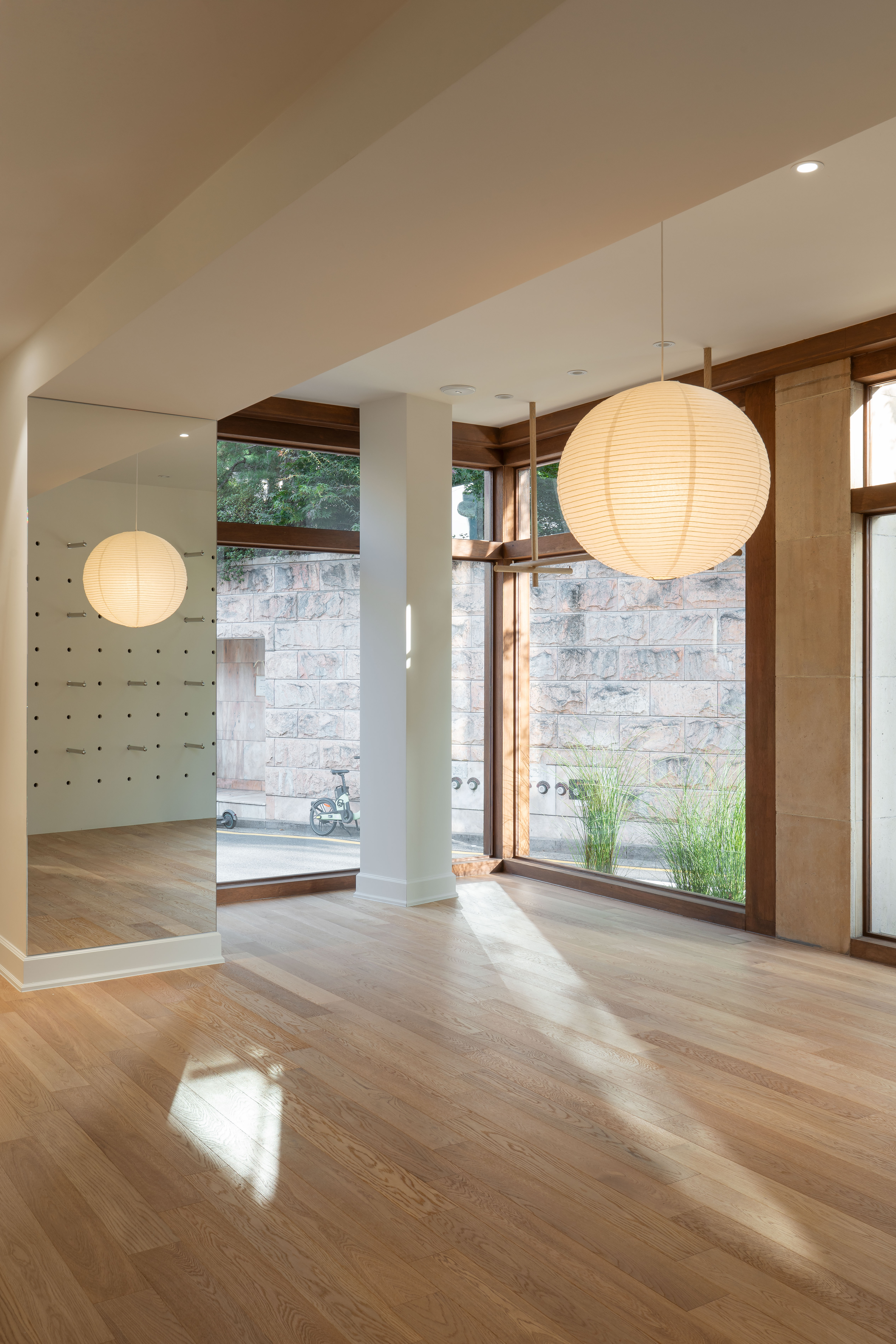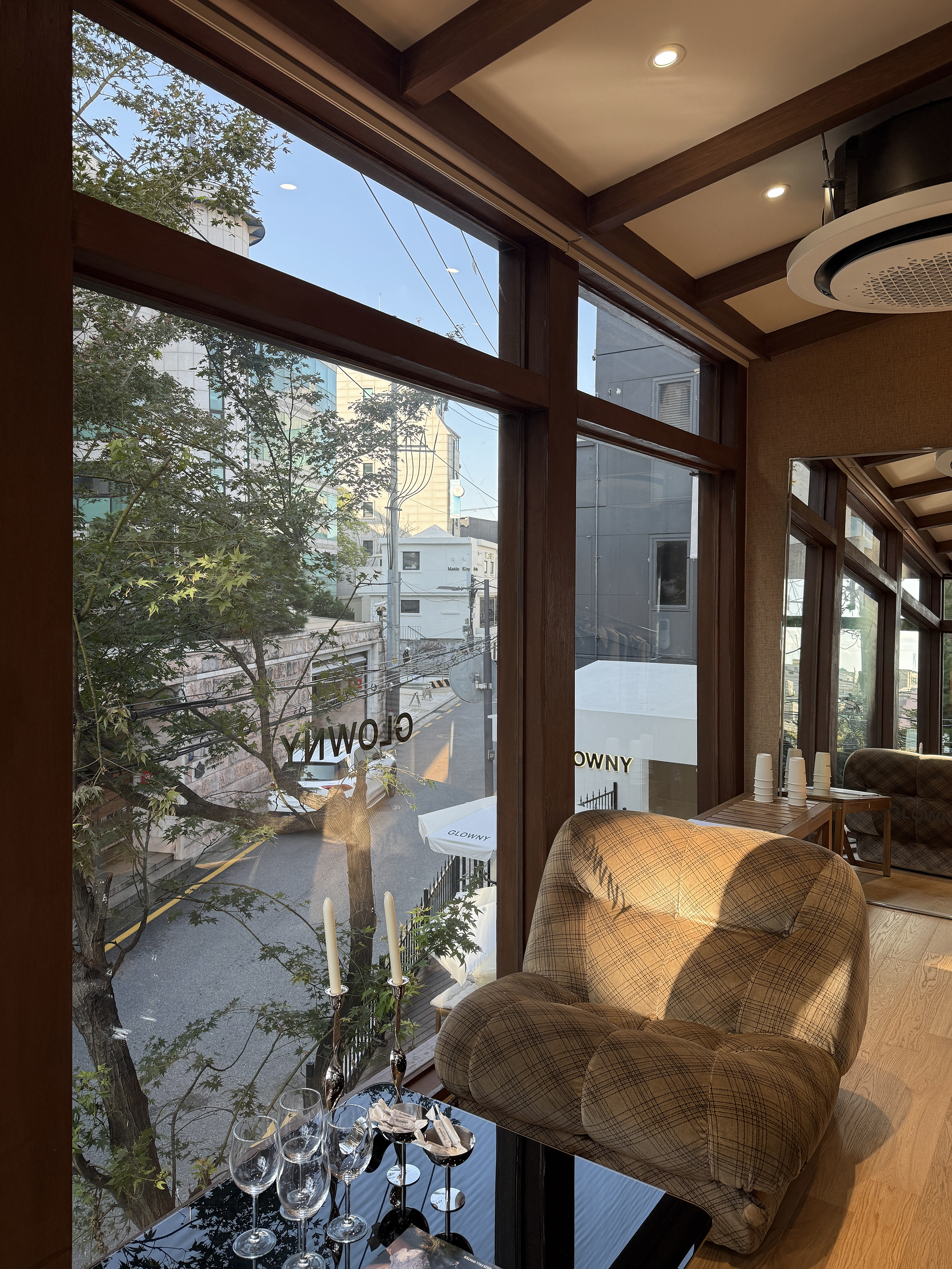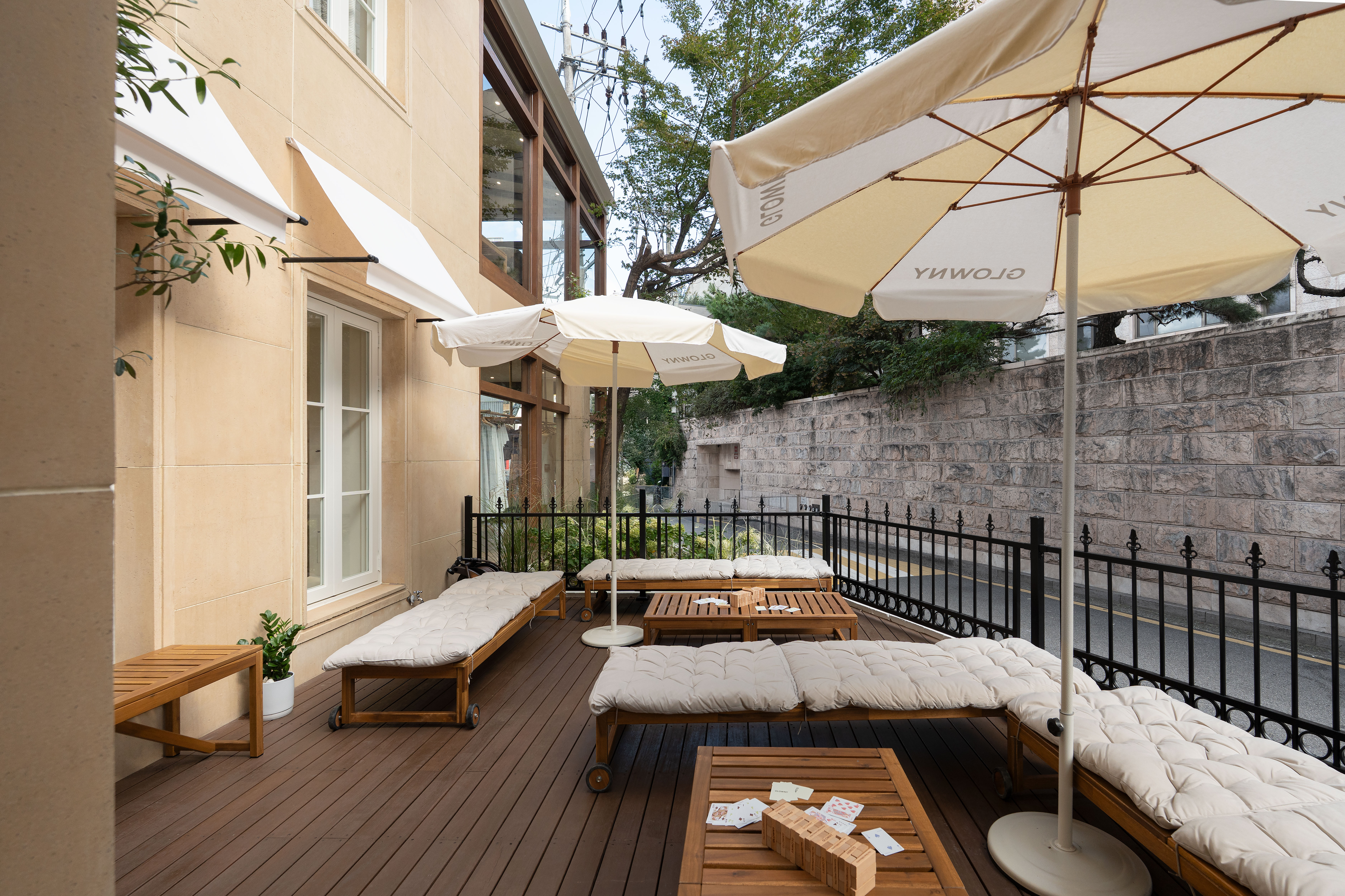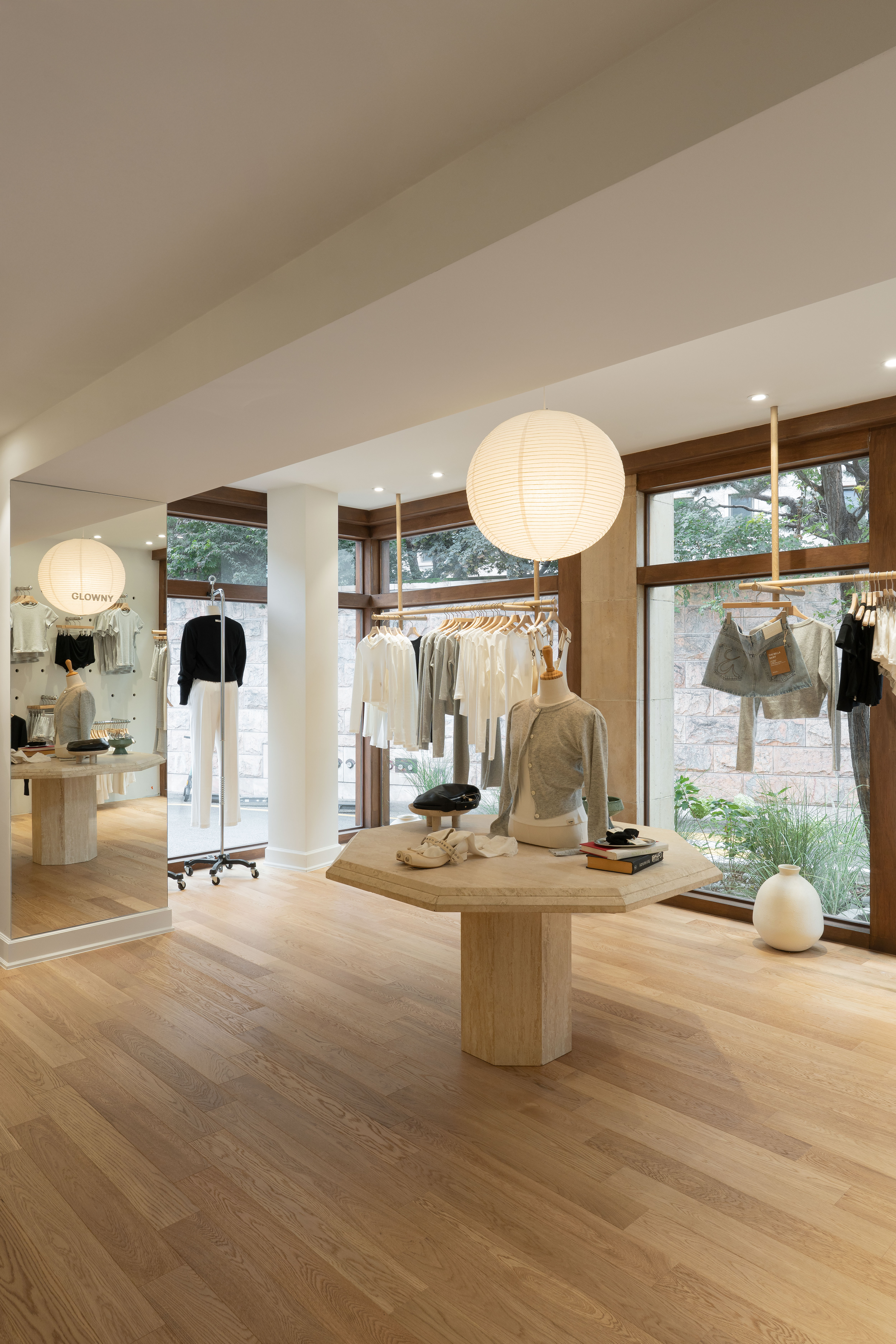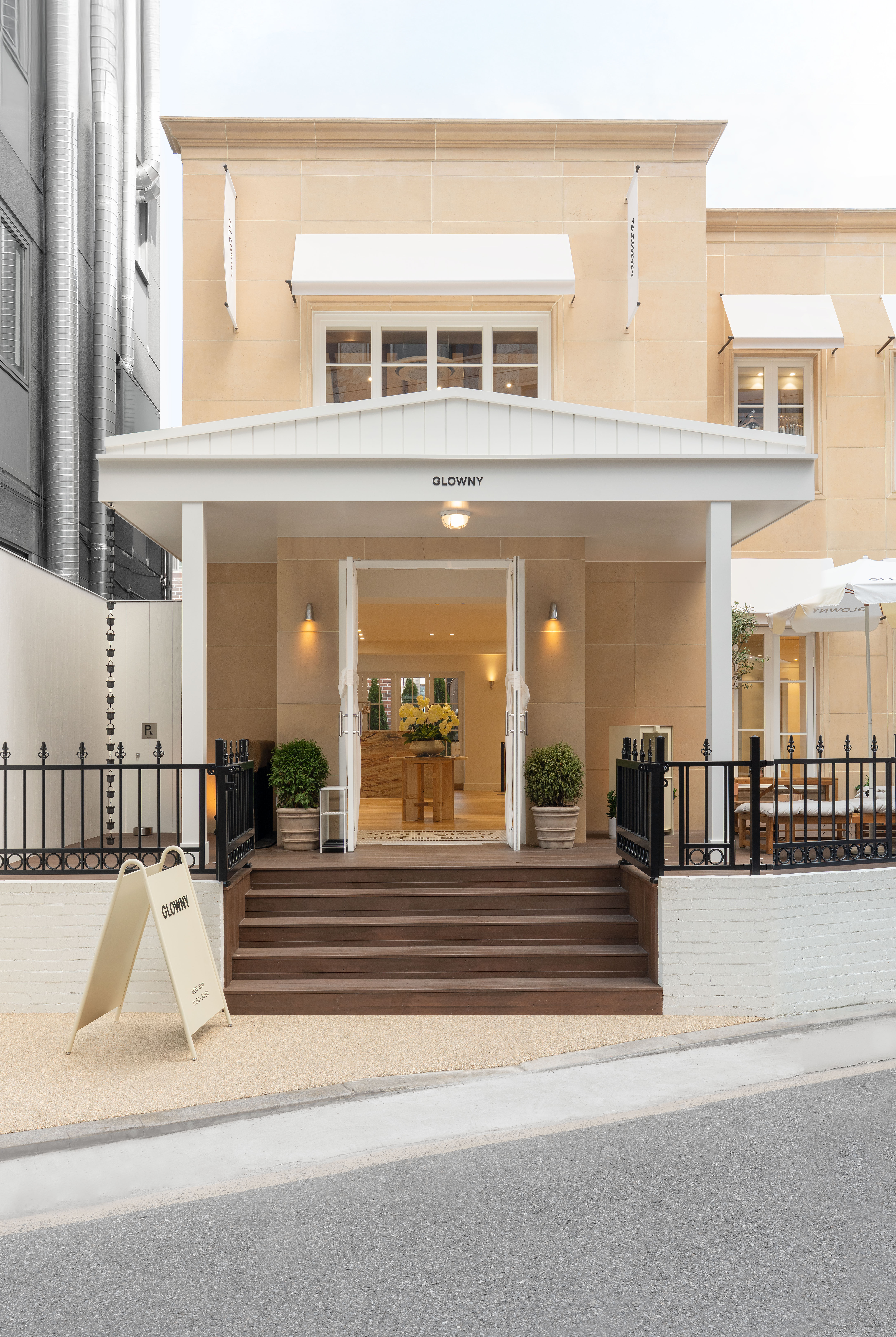 건물 외벽의 베이지 석재 타일은 유지해 오래된 상점이 가진 정취를 남겼고, 화이트 프레임의 창, 어닝, 포치 구조, 테라스의 화이트 브릭 담장, 그리고 볼드한 목재 프레임의 유리 파사드를 통해 글로니 하우스 특유의 클래식한 감성을 강조했다. 새롭게 조성한 우드 데크 테라스는 브랜드의 자유로운 무드를 시각적으로 표현함과 동시에 방문객이 편하게 머무를 수 있는 외부 공간으로 기능한다. 파사드의 조경(한 그루의 나무와 수국)은 외관과 자연스럽게 어우러지고, 측면 솔리드 벽면에는 슬로건 “You Glow Differently”를 포토 스폿으로 구성해 브랜드 메시지를 명확히 드러냈다.