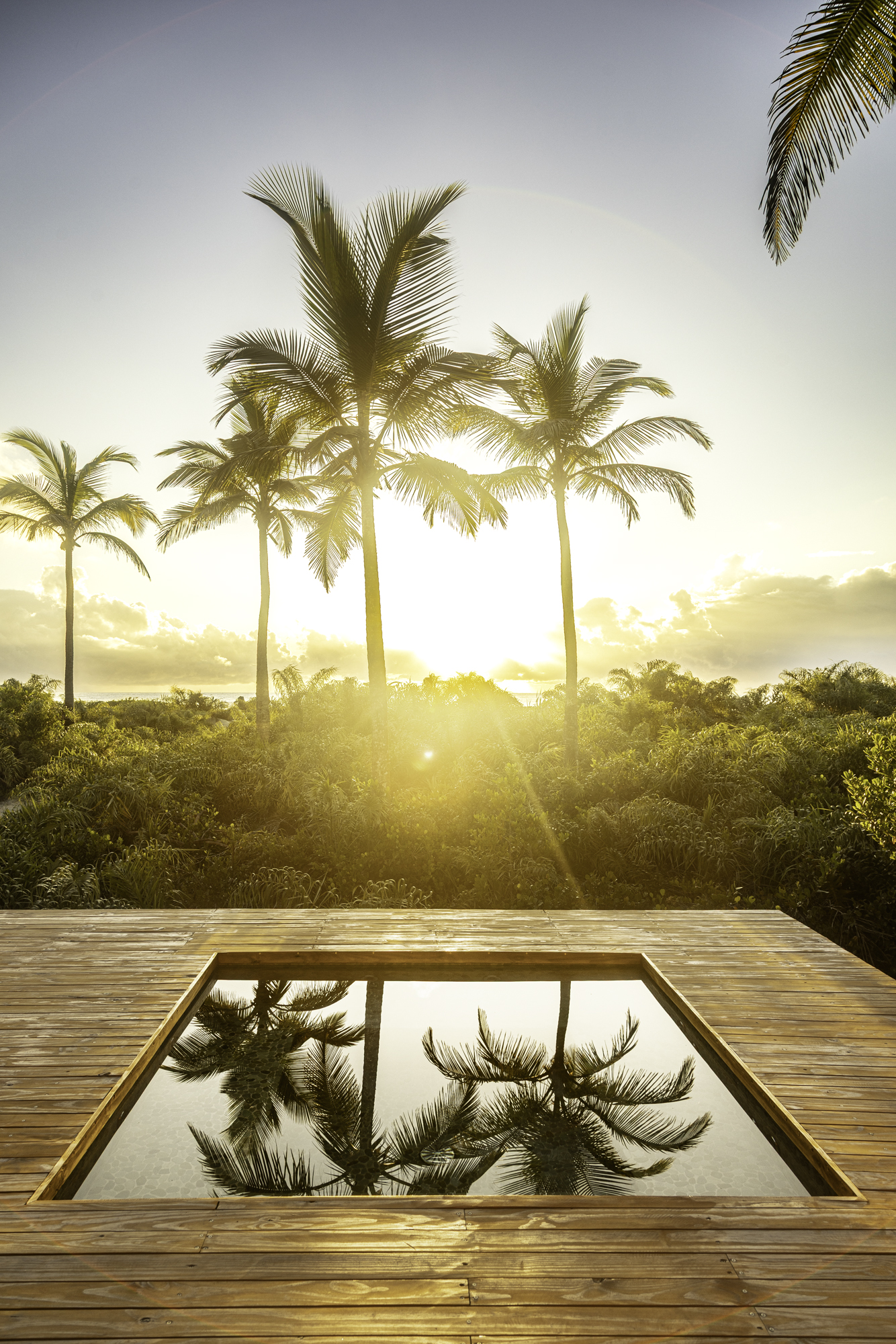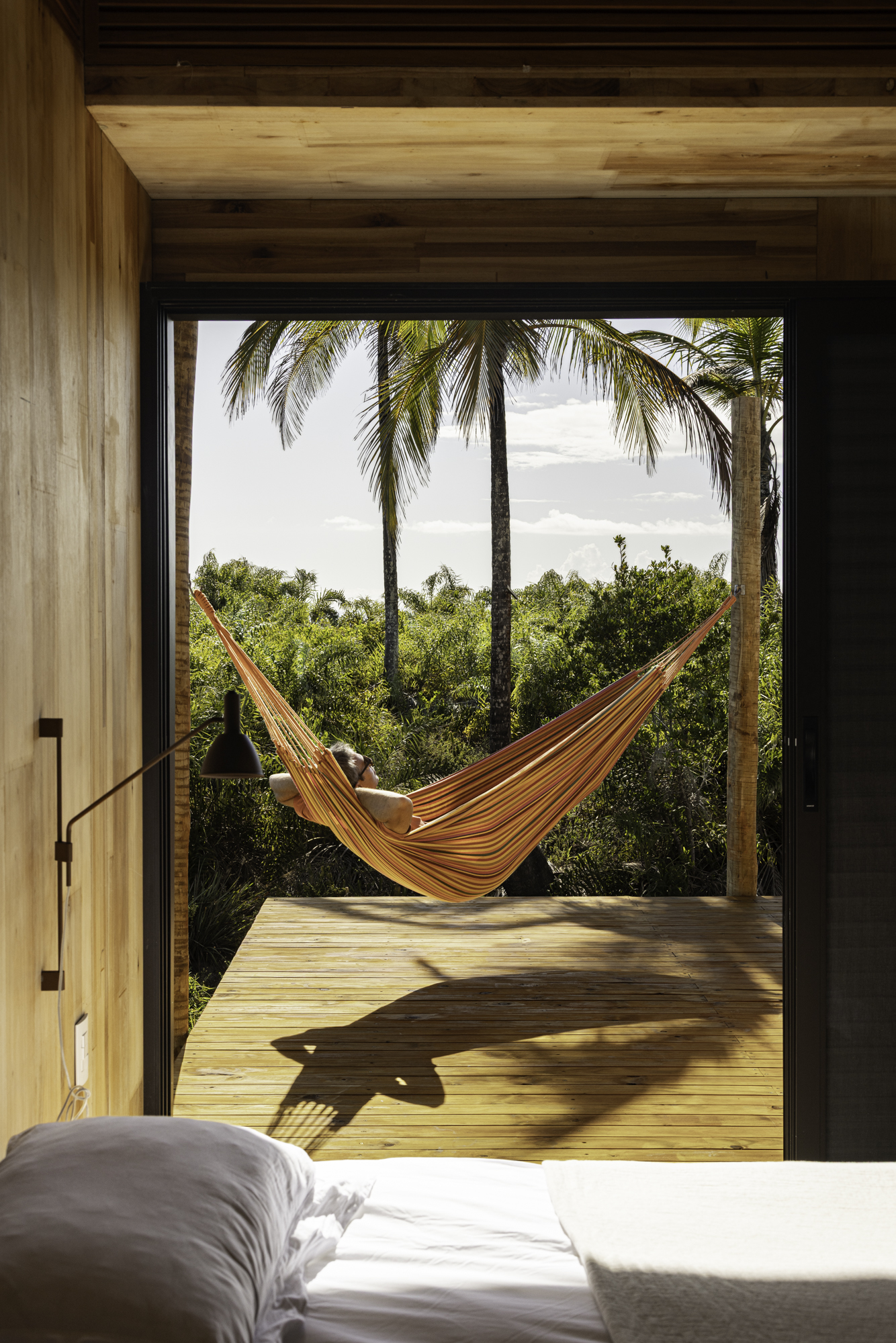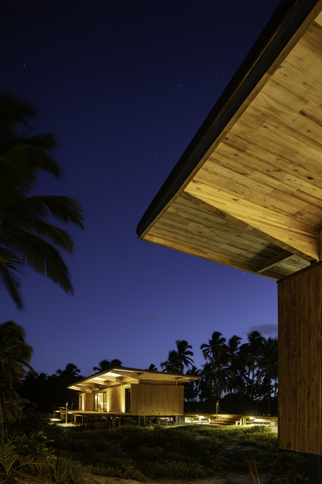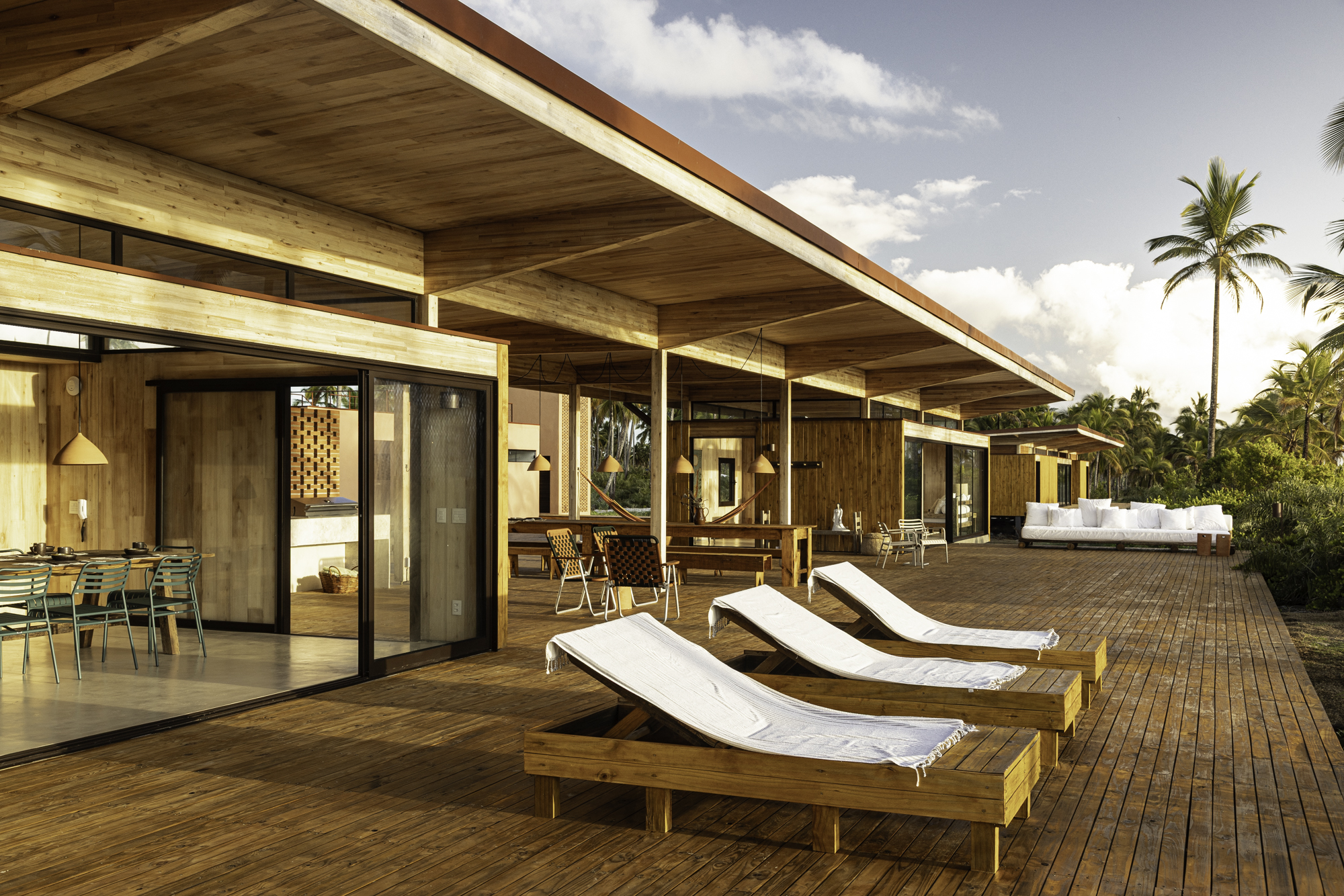 실내는 노출 목재가 벽과 천장을 감싸며 따뜻한 분위기를 만든다. 넓은 유리 개구부는 깊은 처마 아래 보호되어 빛을 부드럽게 들이고, 실내에서 바라보는 풍경을 시각적으로 확장한다. 넓게 펼쳐진 우드 데크는 베란다와 테라스로 이어지며, 모듈 간의 연결 경로를 자연스럽게 형성한다.
