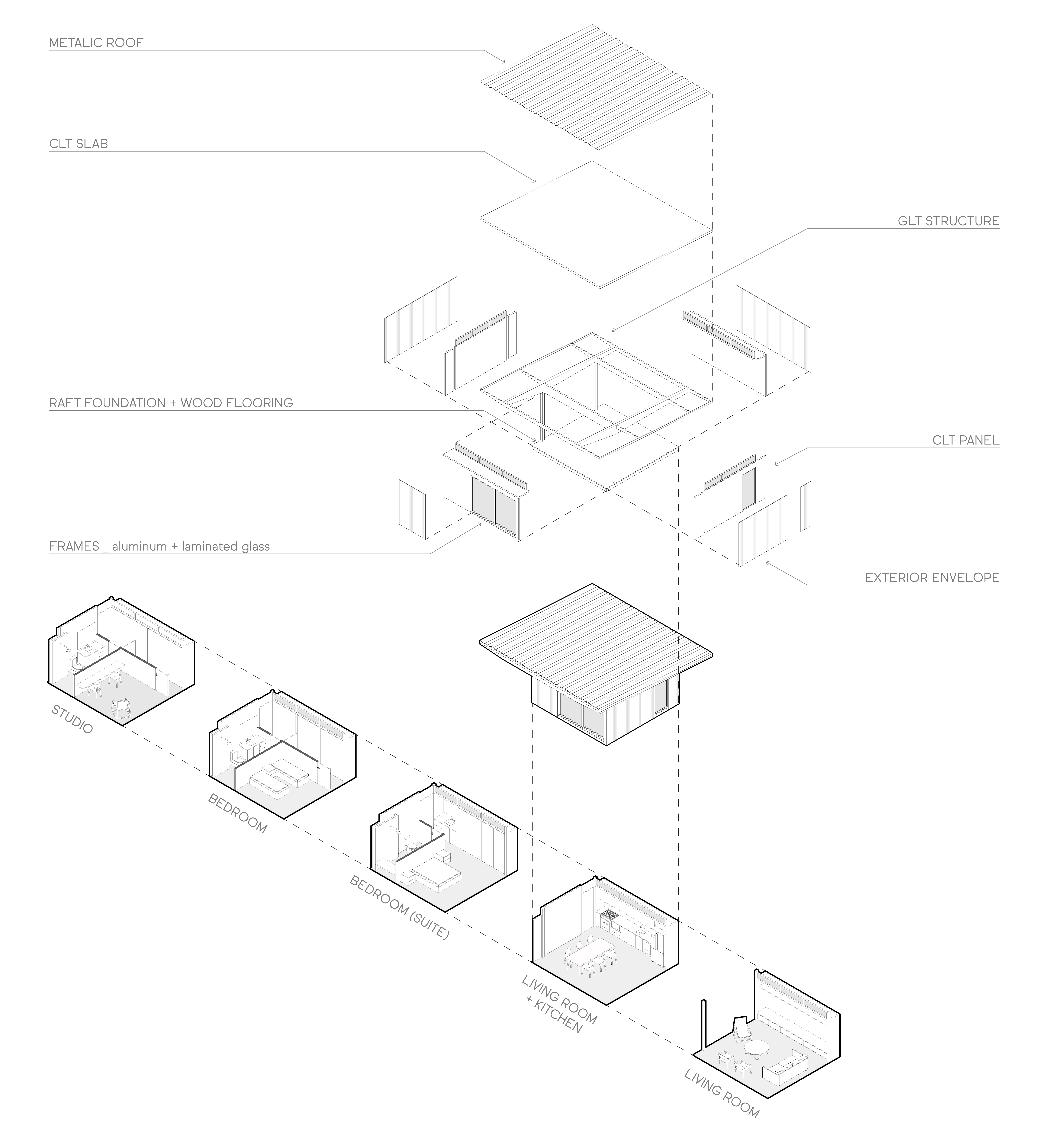 모듈러 바이아는 독립 목구조 + CLT 패널을 기본 구조로 사용해 공정의 속도를 높이고, 현장의 폐기물을 최소화했다. 재조림 목재 사용, 모듈화된 구성요소, 깊은 처마를 통한 일사 차단, 마주 보는 입면의 개구부를 통한 효율적 자연 환기, 물 재사용 시스템, 패시브 에너지 전략 등 지속가능성 전반을 설계의 초기 단계부터 반영했다. 경사지붕은 뜨거운 공기를 자연스럽게 배출해 냉방 없이도 열환경을 안정적으로 유지한다.