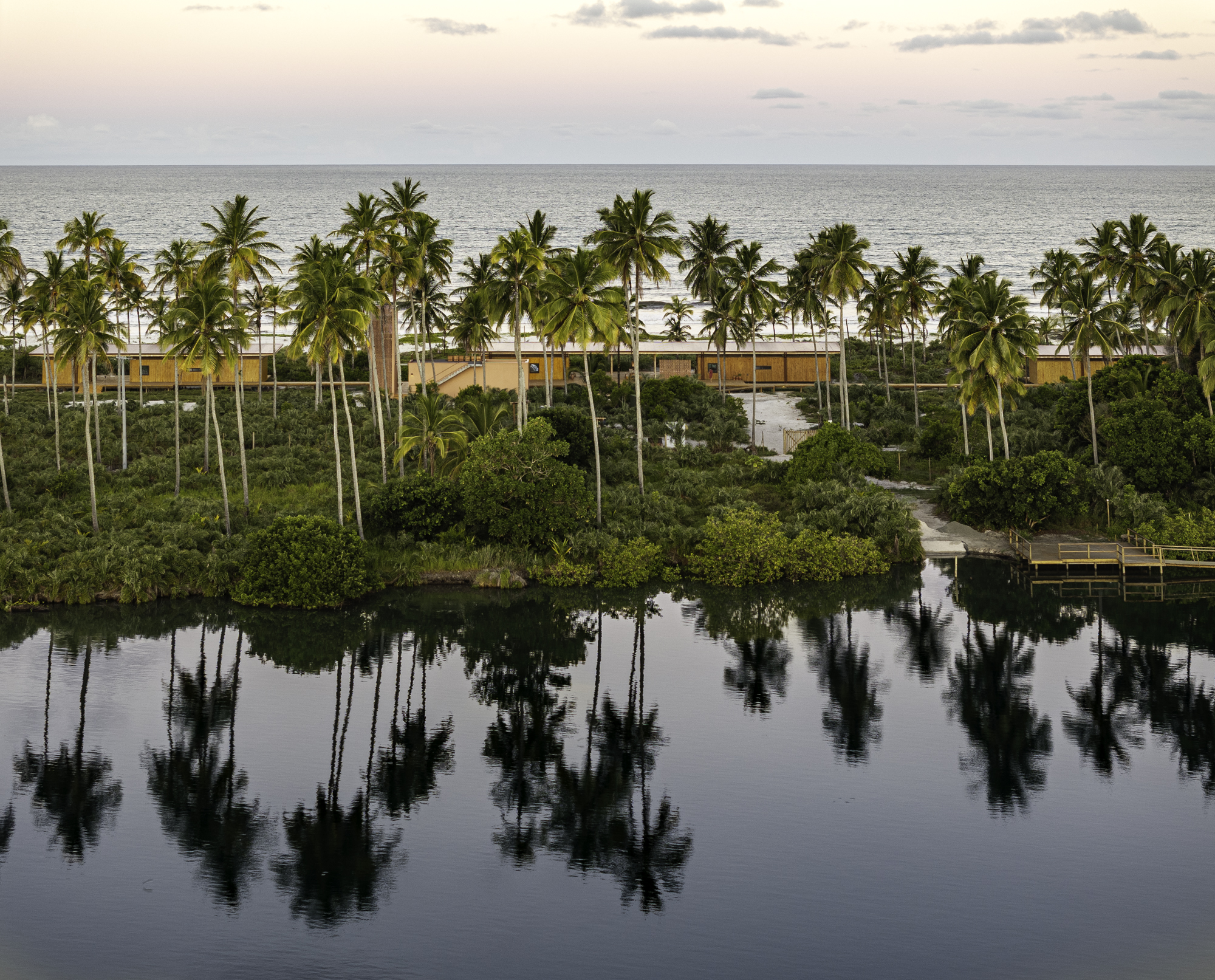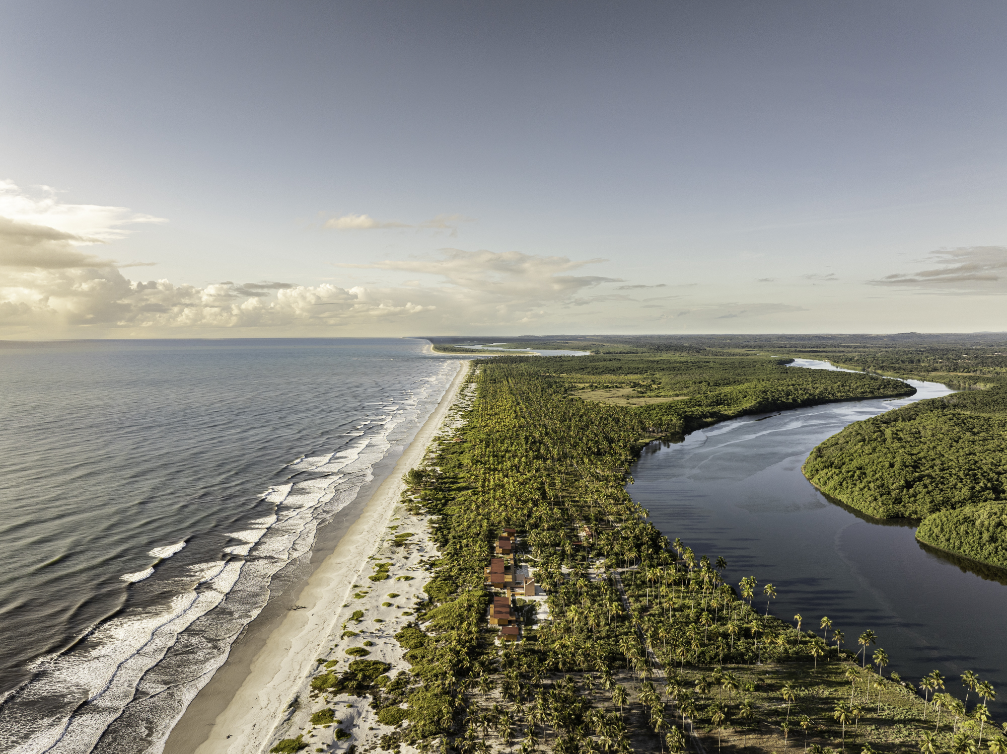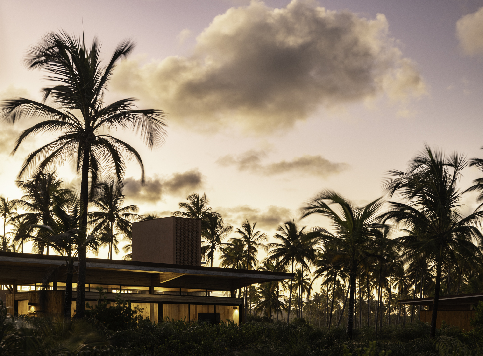 브라질 남부 바이아 주, 강과 바다가 만나는 반도 위에 자리한 모듈러 바이아(Modular Bahia)는 지역 환경과 기후에 민감하게 반응하는 현대적인 열대 리트릿으로 설계되었다. 이 프로젝트는 UNA barbara e valentim이 개발한 산업화된 모듈 시스템과 생물기후 전략을 결합해, 주변 풍경과의 통합을 극대화한 주거 모델을 제안한다.