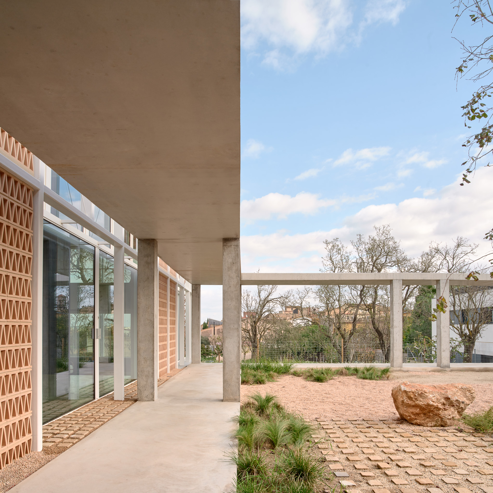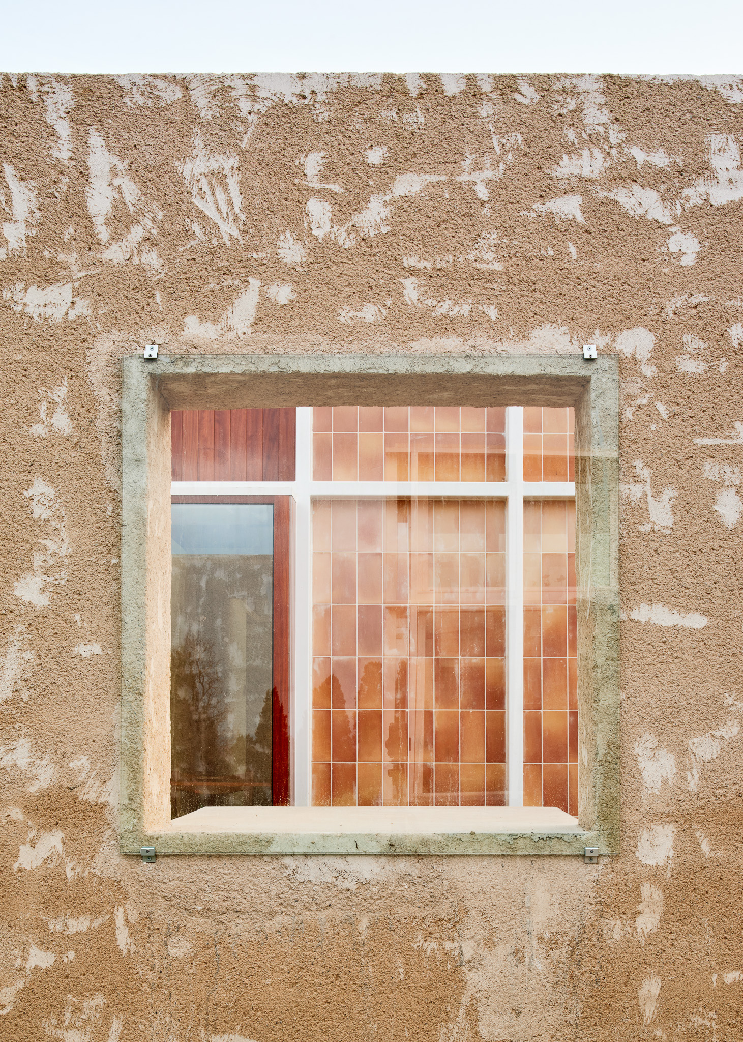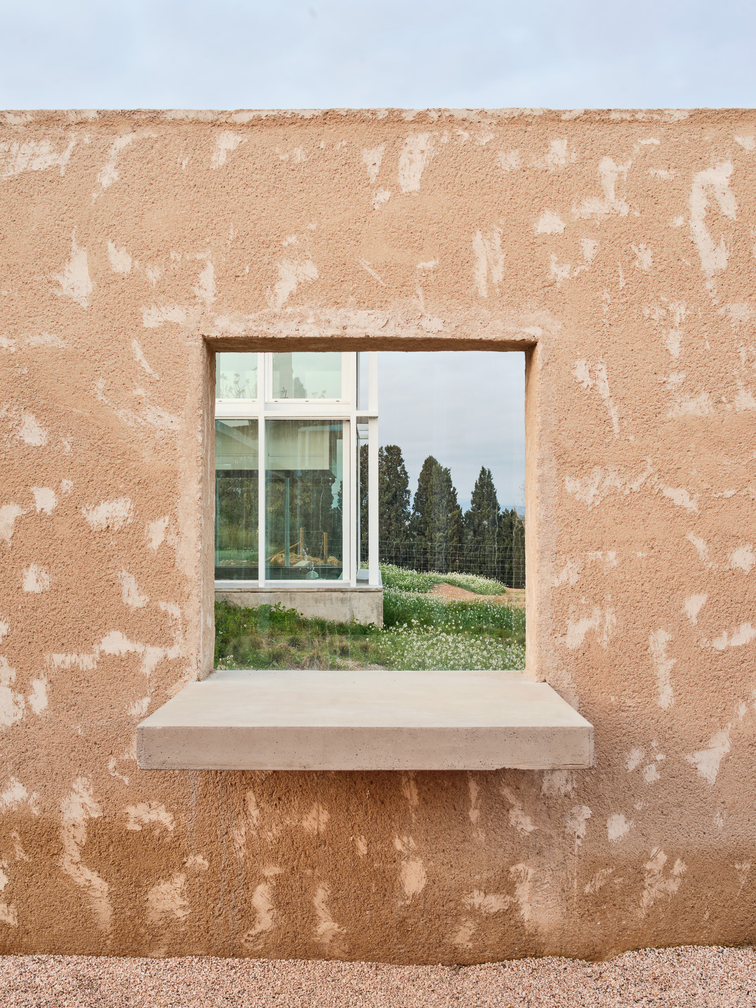 콘크리트 보행로, 큰 창호, 중정과 연결되는 샤워부스 등이 그 경계를 흐리며, 트라문타나(Tramuntana) 바람을 막기 위한 러프한 흙 미장 외벽이 부지를 감싸 집을 보호한다.