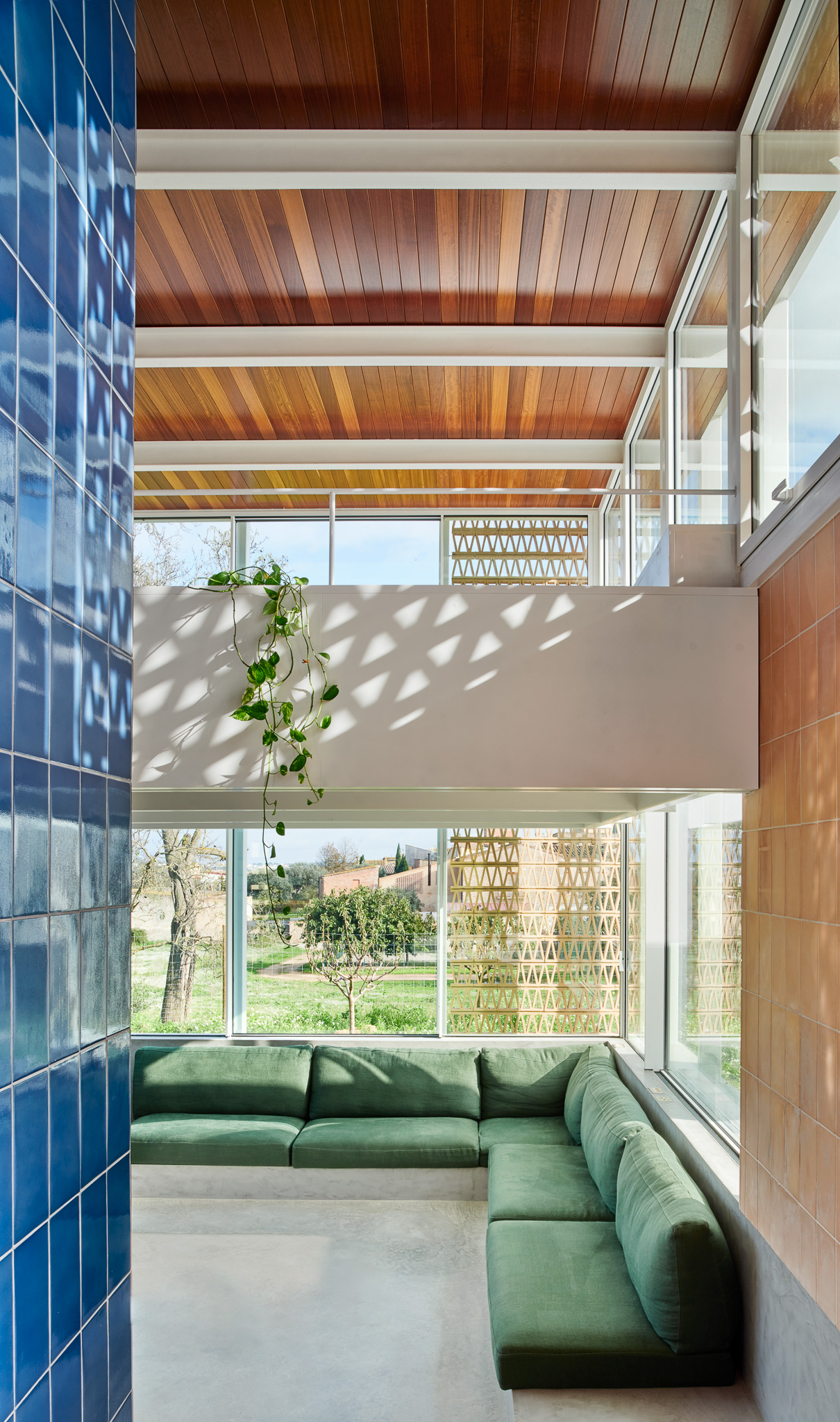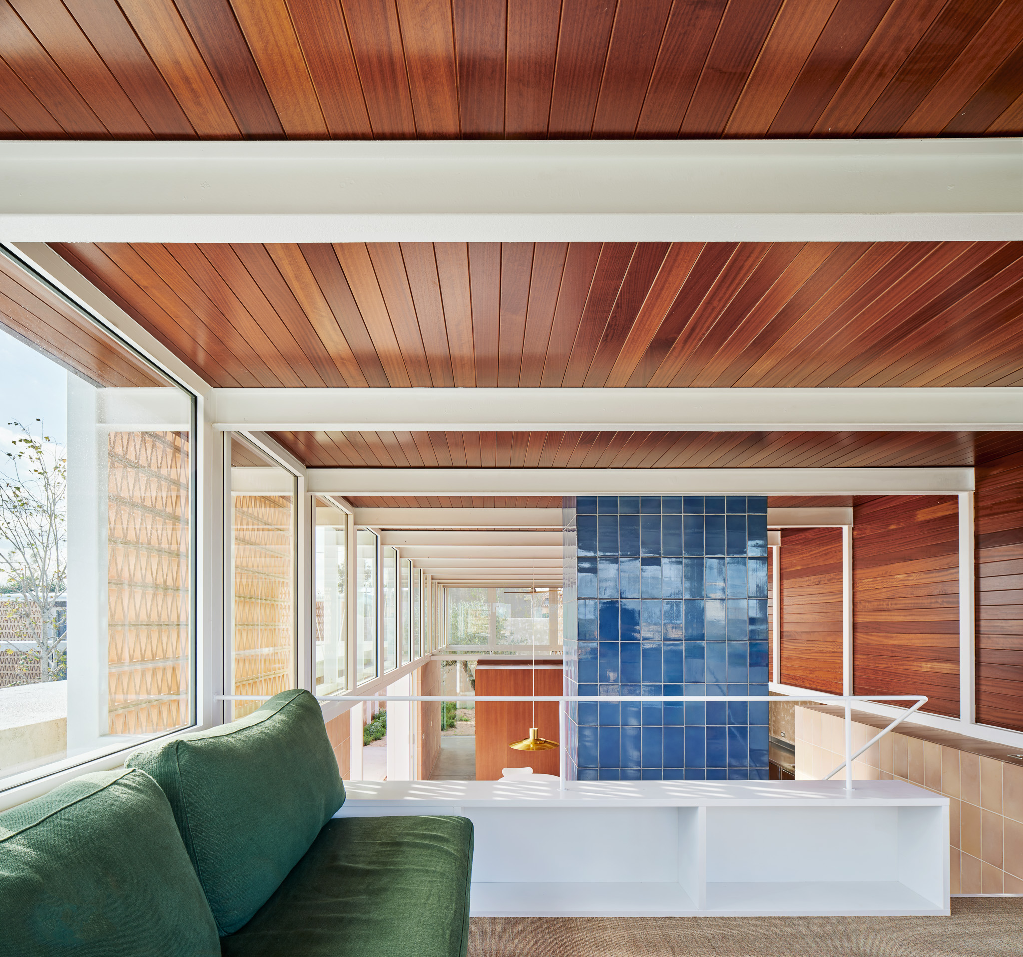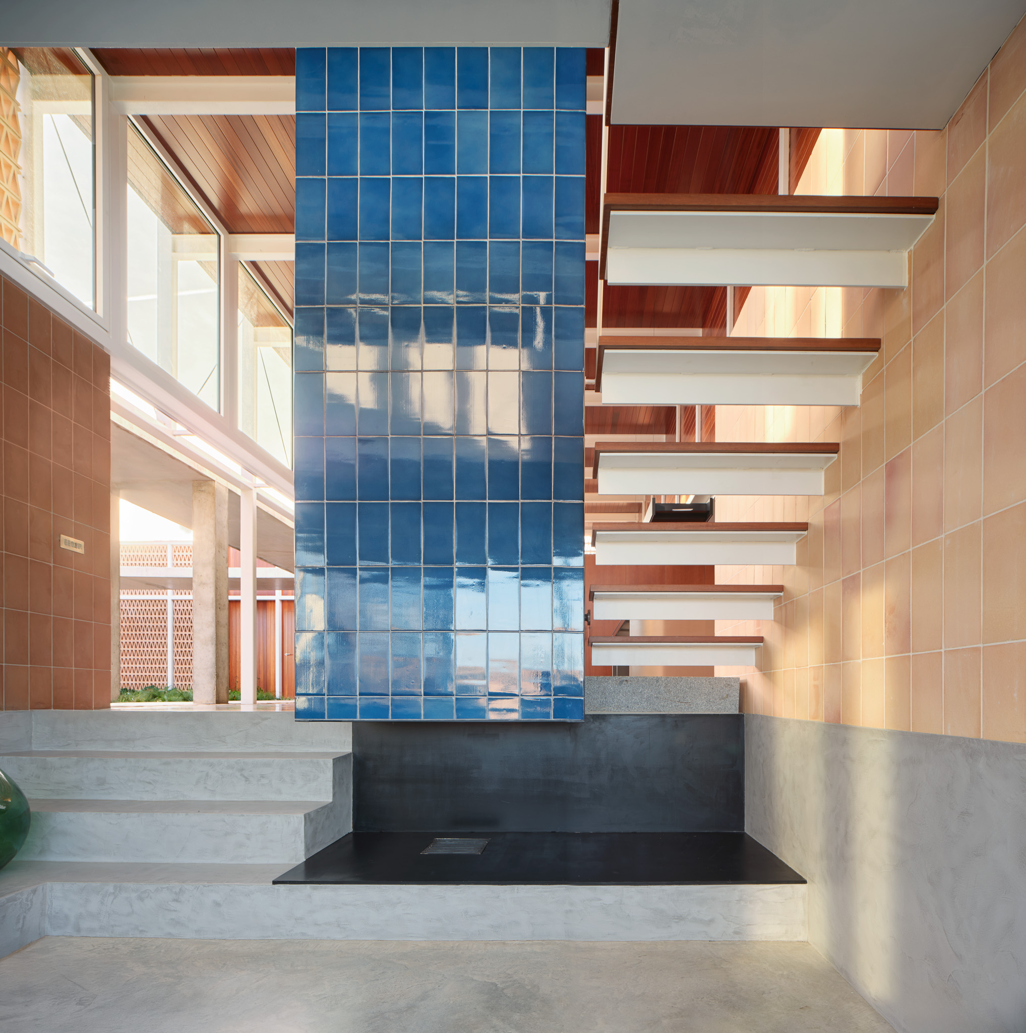 구조는 가볍고 이동 가능한 듯한 느낌을 주는 목재·스틸·세라믹 라티스, 그리고 큰 유리 개구부로 구성되며, 지역 장인의 세라믹 라티스와 파란 타일이 중간중간 삽입되어 지역성과 질감을 더한다.