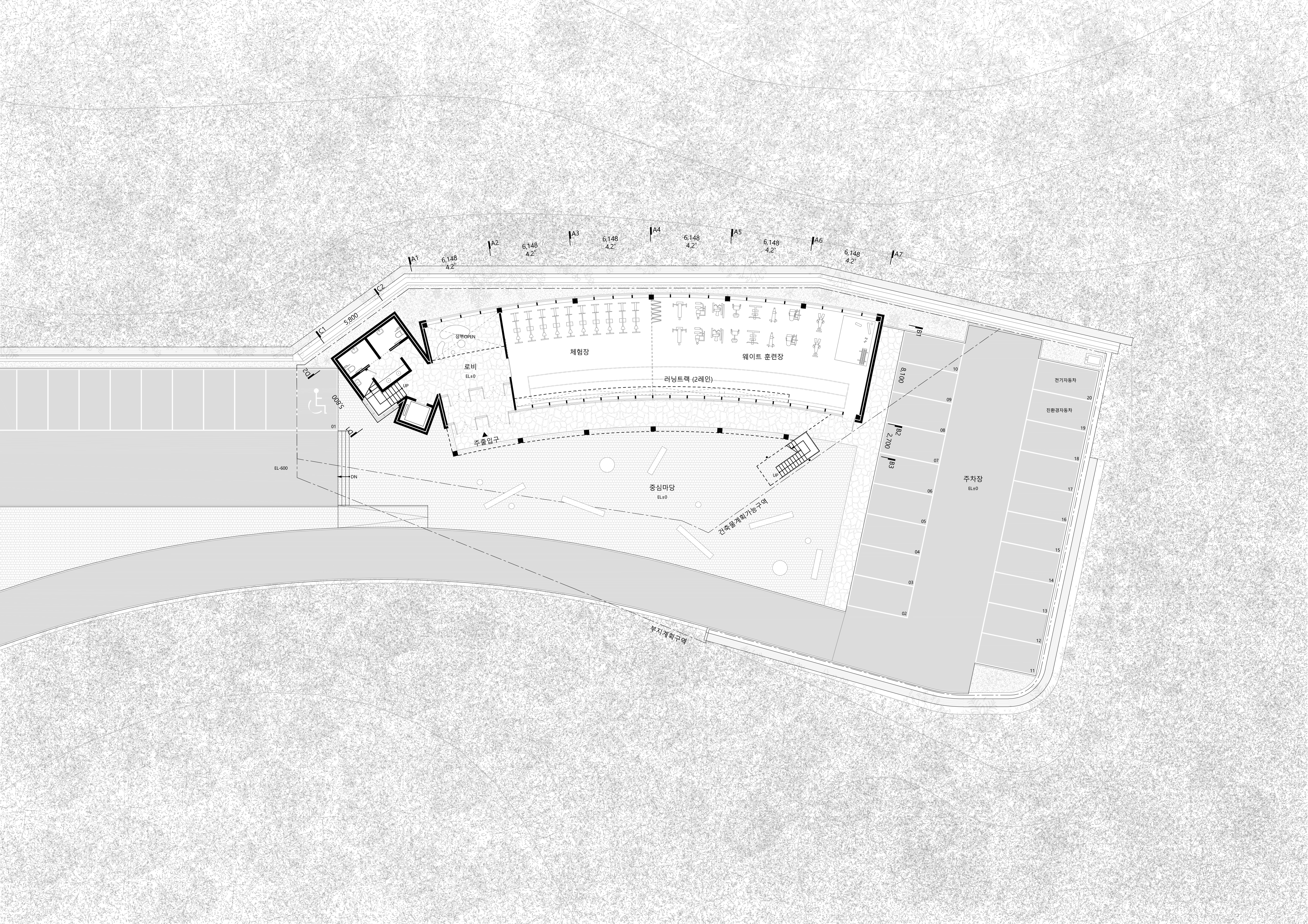 진양호공원 산 위쪽 중심부에 위치한 대지는 동쪽으로 트인 조망과, 주변이 풍부한 자연경관으로 둘러싸여 있다. 건물의 규모는 비교적 소규모로, 단순한 형태 속에서도 전용공간과 공용공간을 명확히 분리하며, 조형성과 구조적 완결성이 드러날 수 있도록 계획하였다. 우수한 조망 여건을 적극적으로 활용하기 위해, 모든 실에서 외부 경관을 향한 시각적 개방감을 확보하고자 하였다. 이에 따라 건물을 2개 층으로 계획하였으며, 1층에는 운동시설을, 2층에는 부대시설을 배치하여 기능을 명확히 구분하였다. 건물은 동측으로는 도심 방향의 조망을 확보하고, 서측으로는 건물과 수목이 어우러진 아늑한 위요공간을 형성하여 이용자가 개방감과 안정감이 공존하는 내외부 환경을 경험한다. 2층의 면적은 1층의 면적보다 작아 자연스럽게 테라스가 형성되며, 서측 마당을 향한 이 공간은 외부계단과 함께 중심마당을 작은 무대와 같은 장소성을 가지게 한다. 이처럼 건물은 주변 자연과 조화를 이루며, 기능과 형태의 균형을 통해 단순한 구조 속에서도 풍부한 공간적인 경험을 제공하고자 한다.