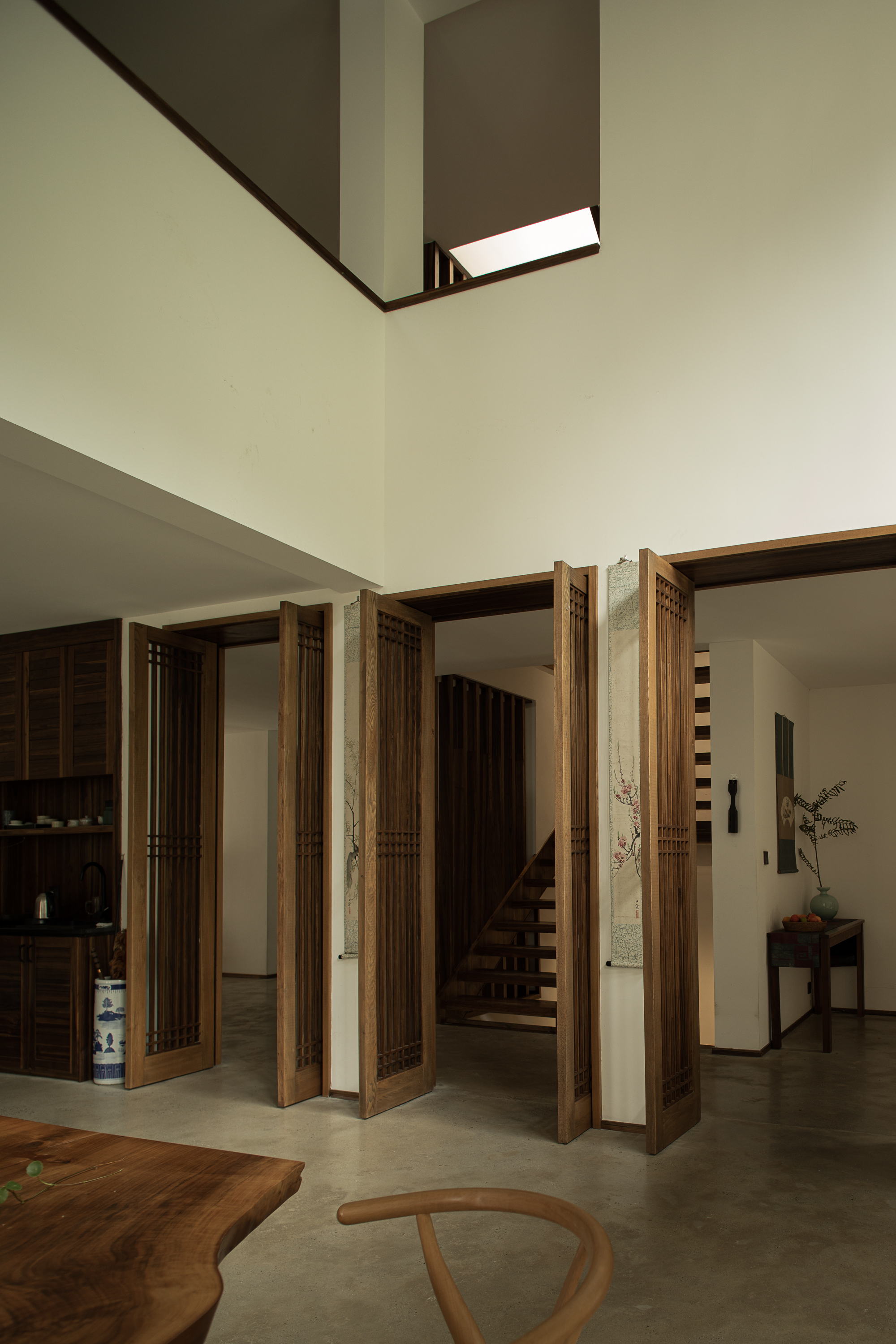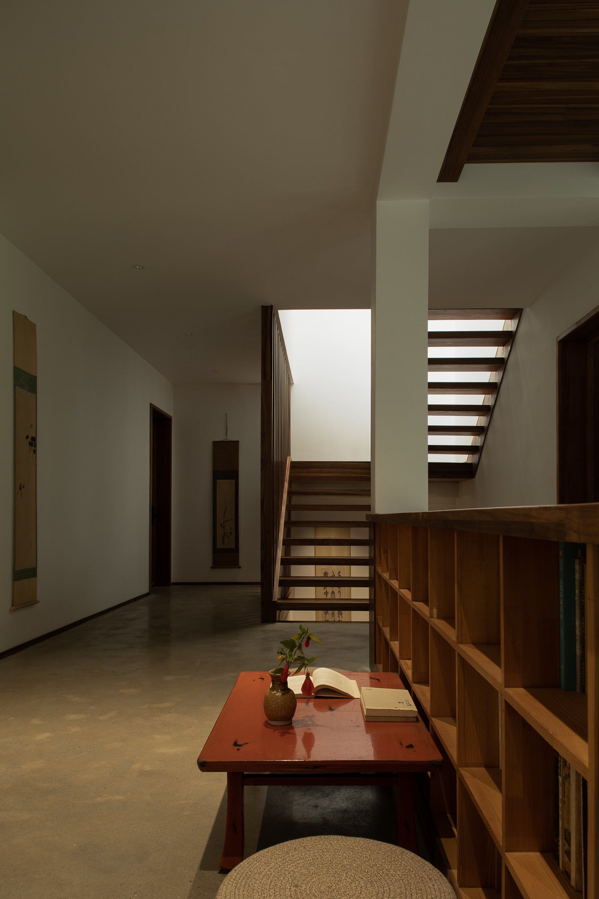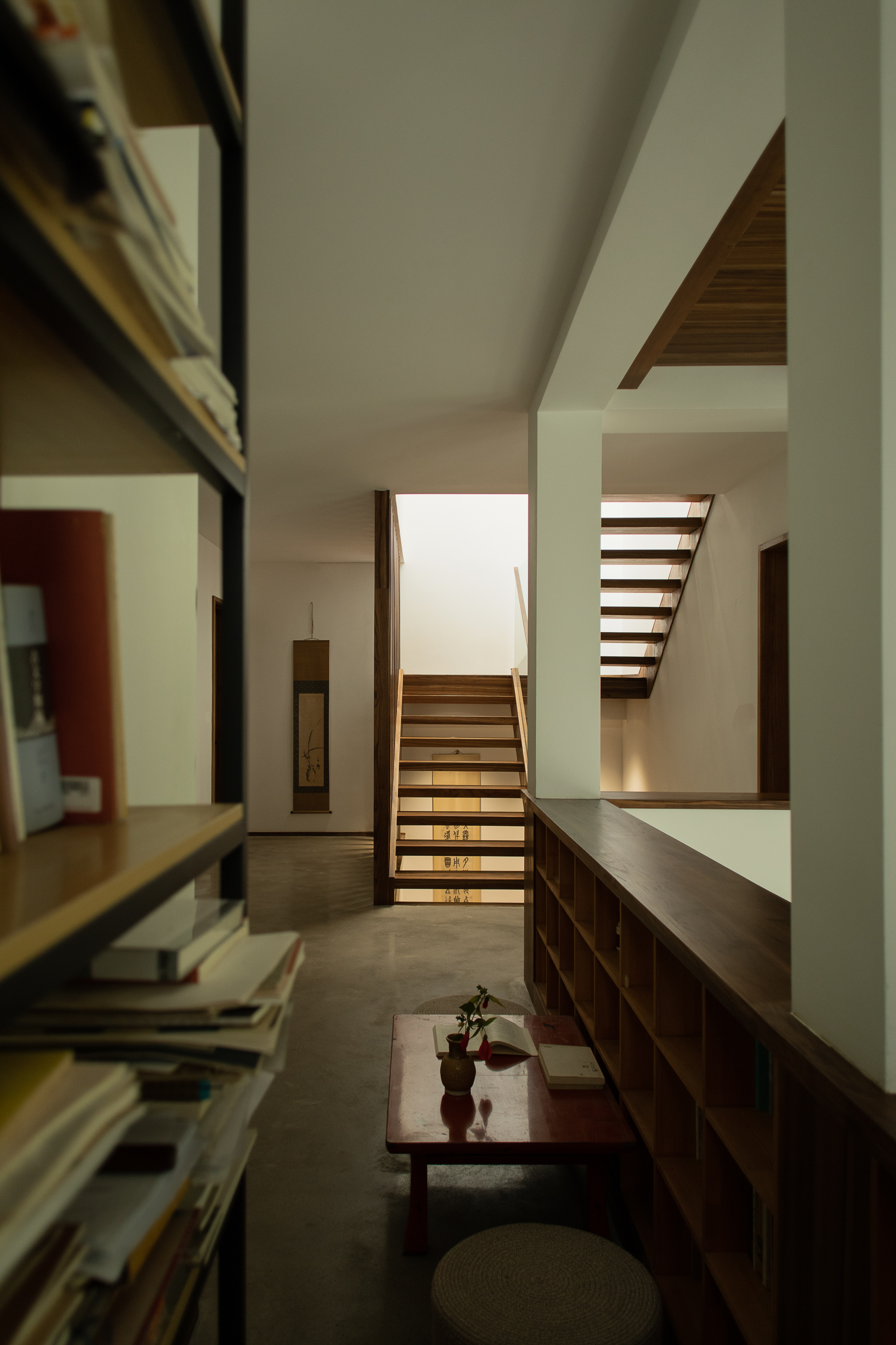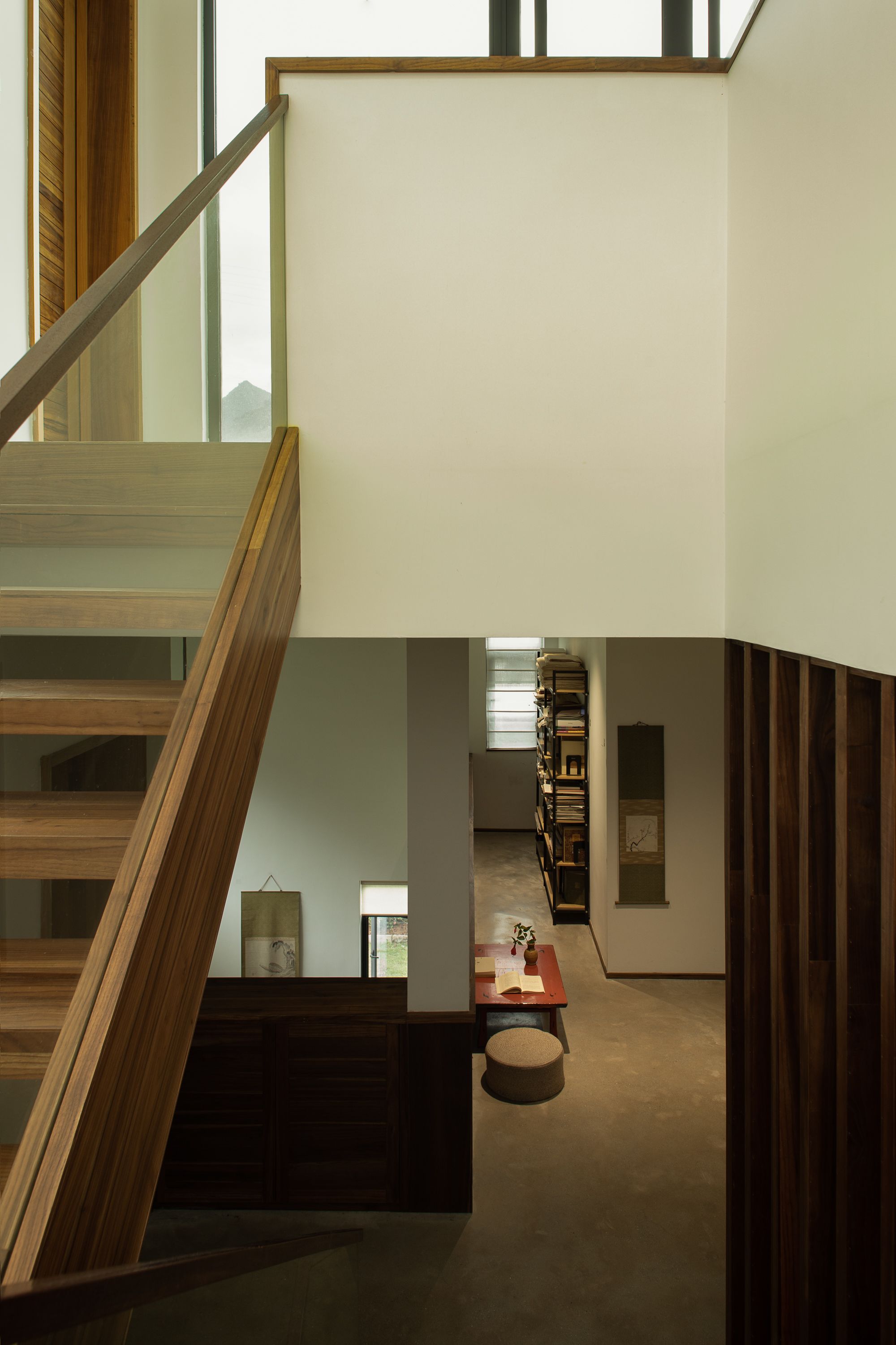 기존 건물은 어두운 아메리칸 타운하우스 구조로, 방들이 단절되고 채광이 부족했다. 건축가는 이를 과감히 뜯어내고 개방성과 흐름, 미니멀한 외관으로 재구성했다. 여기서 중요한 전략은 기능을 고정하지 않는 공간 구성이다. ‘거실’, ‘서재’ 같은 명칭 대신, 상황에 따라 명상이 가능하고, 차를 마시거나 손님을 맞는 공간으로 변화할 수 있는 ‘장면 기반의 공간(scene-based flexibility)’을 제안한다. 계단참과 복도 주변의 여유 공간은 거주자의 해석에 따라 역할이 달라지며, 집 전체는 느슨하게 연결된 하나의 유기체처럼 작동한다.