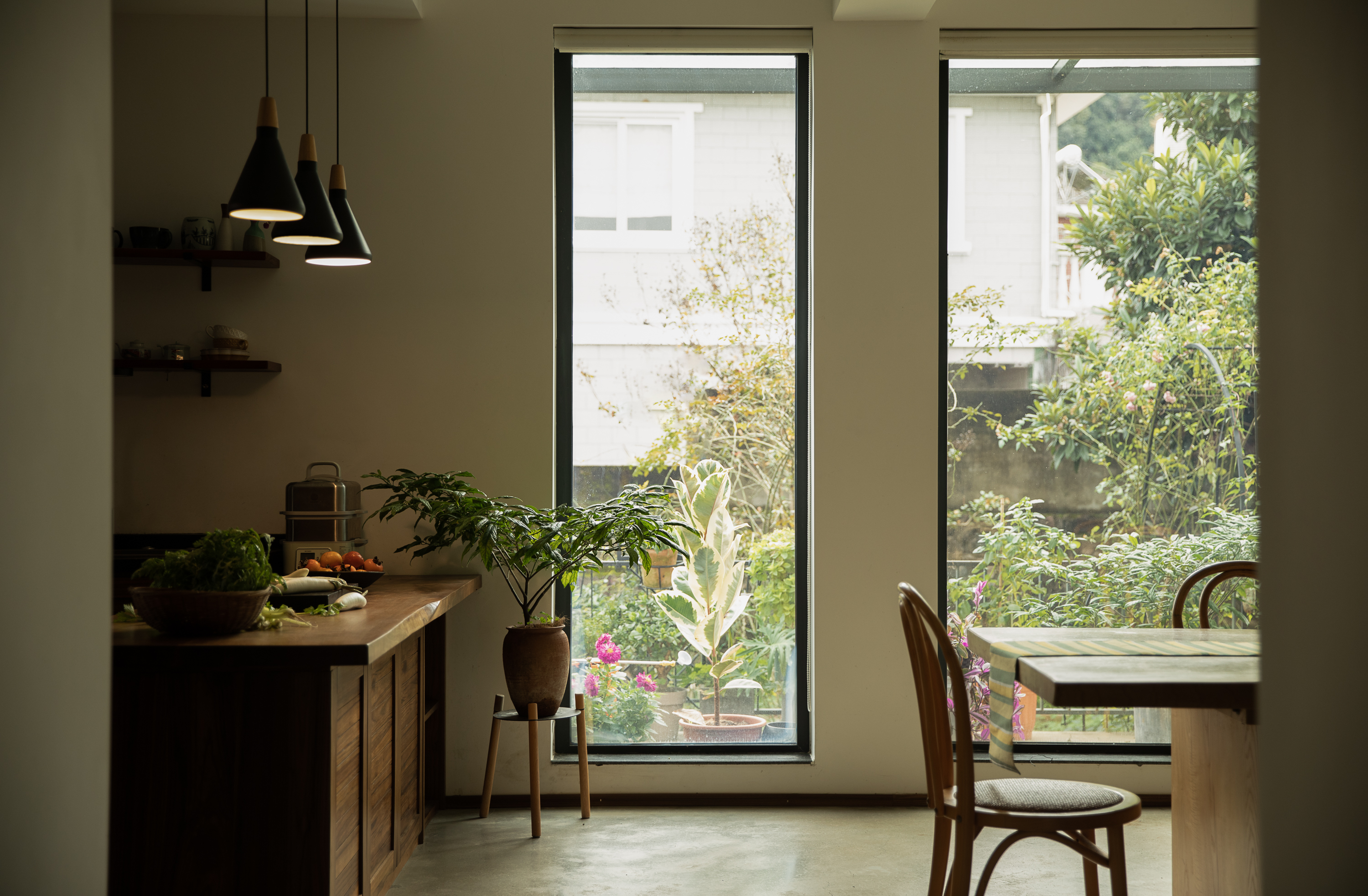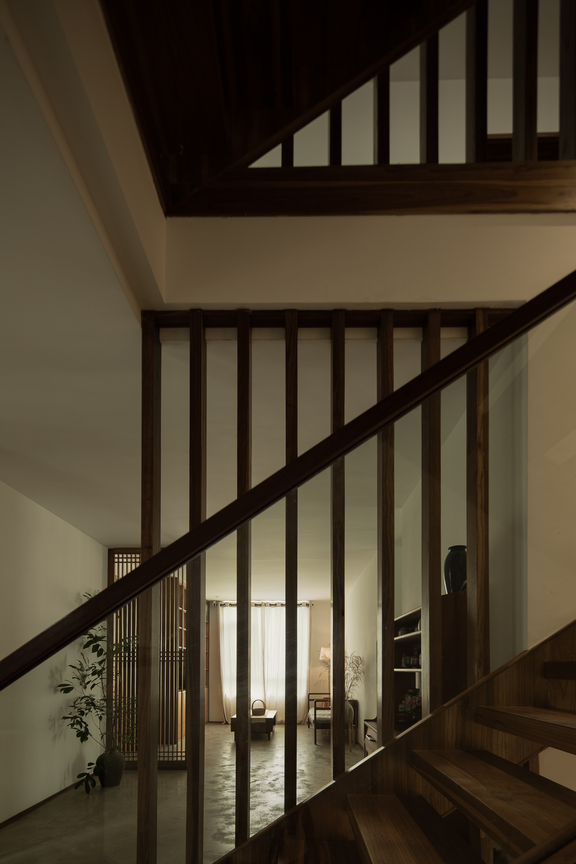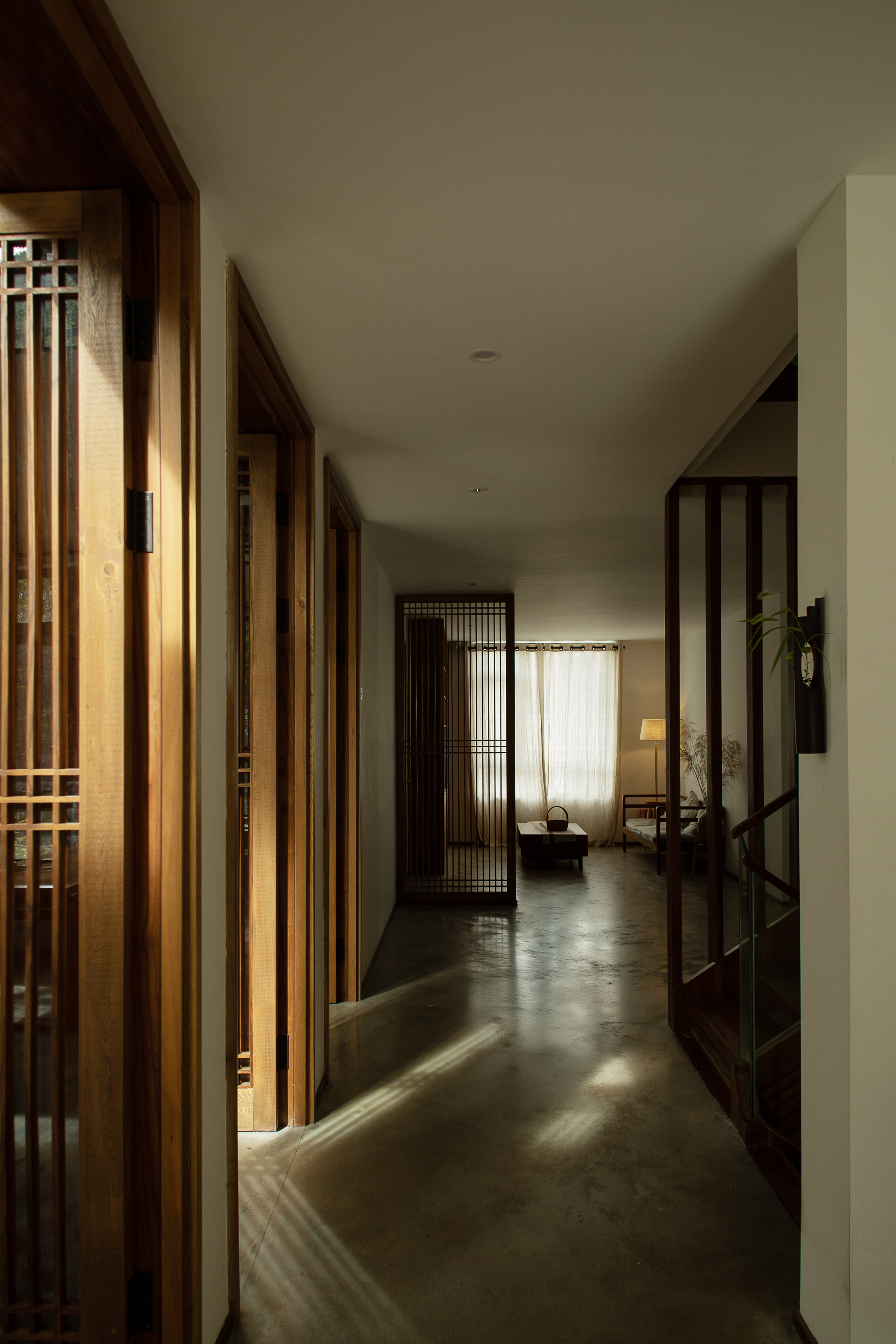 기존 건물은 어두운 아메리칸 타운하우스 구조로, 방들이 단절되고 채광이 부족했다. 건축가는 이를 과감히 뜯어내고 개방성과 흐름, 미니멀한 외관으로 재구성했다. 여기서 중요한 전략은 기능을 고정하지 않는 공간 구성이다. ‘거실’, ‘서재’ 같은 명칭 대신, 상황에 따라 명상이 가능하고, 차를 마시거나 손님을 맞는 공간으로 변화할 수 있는 ‘장면 기반의 공간(scene-based flexibility)’을 제안한다. 계단참과 복도 주변의 여유 공간은 거주자의 해석에 따라 역할이 달라지며, 집 전체는 느슨하게 연결된 하나의 유기체처럼 작동한다.