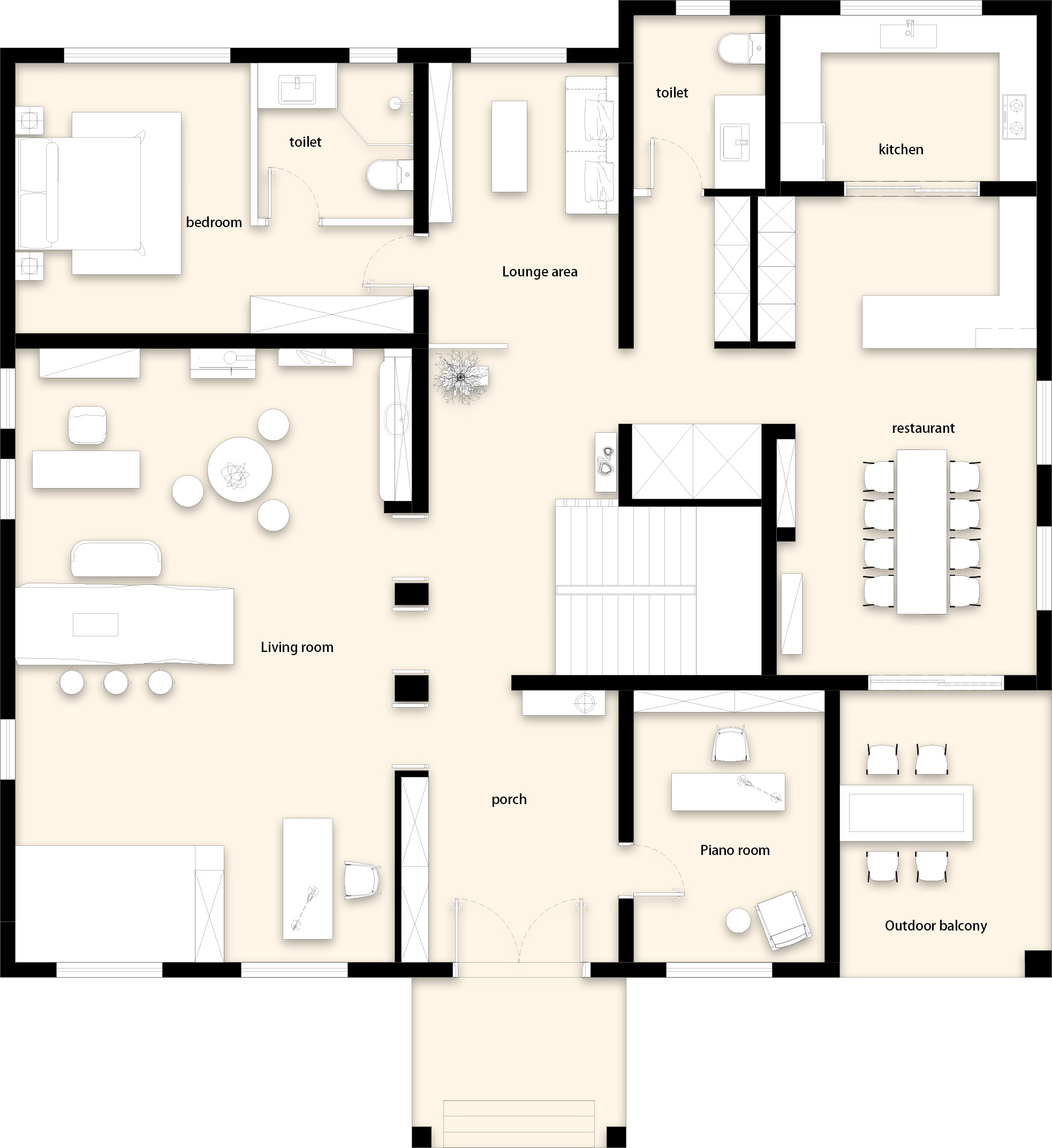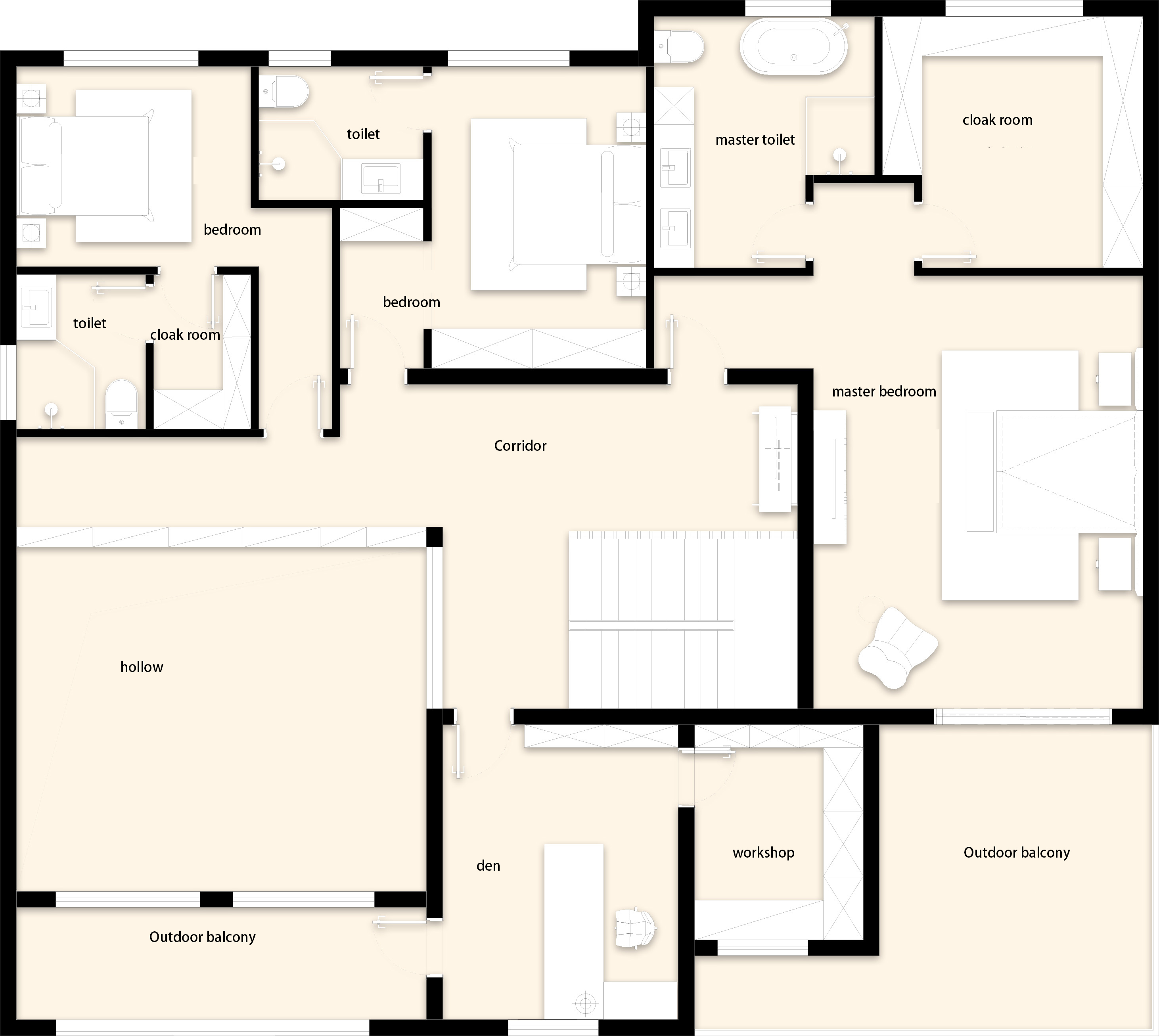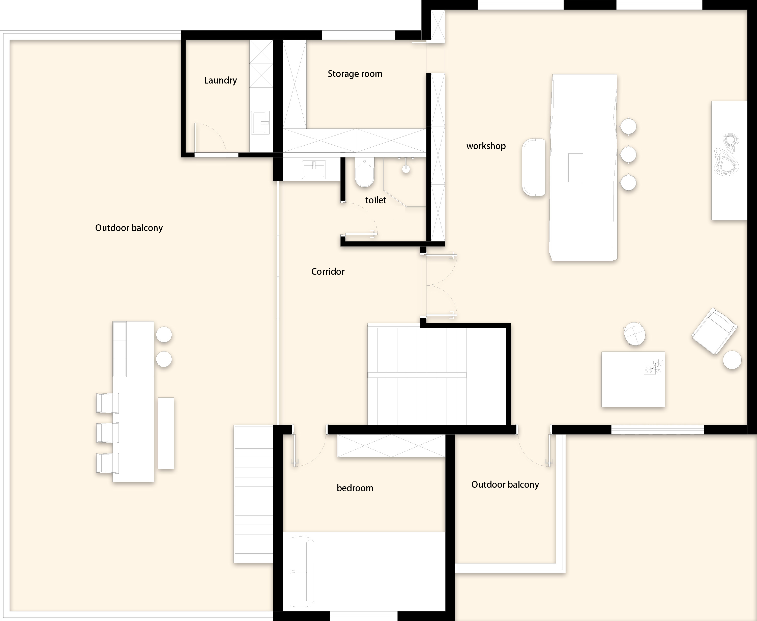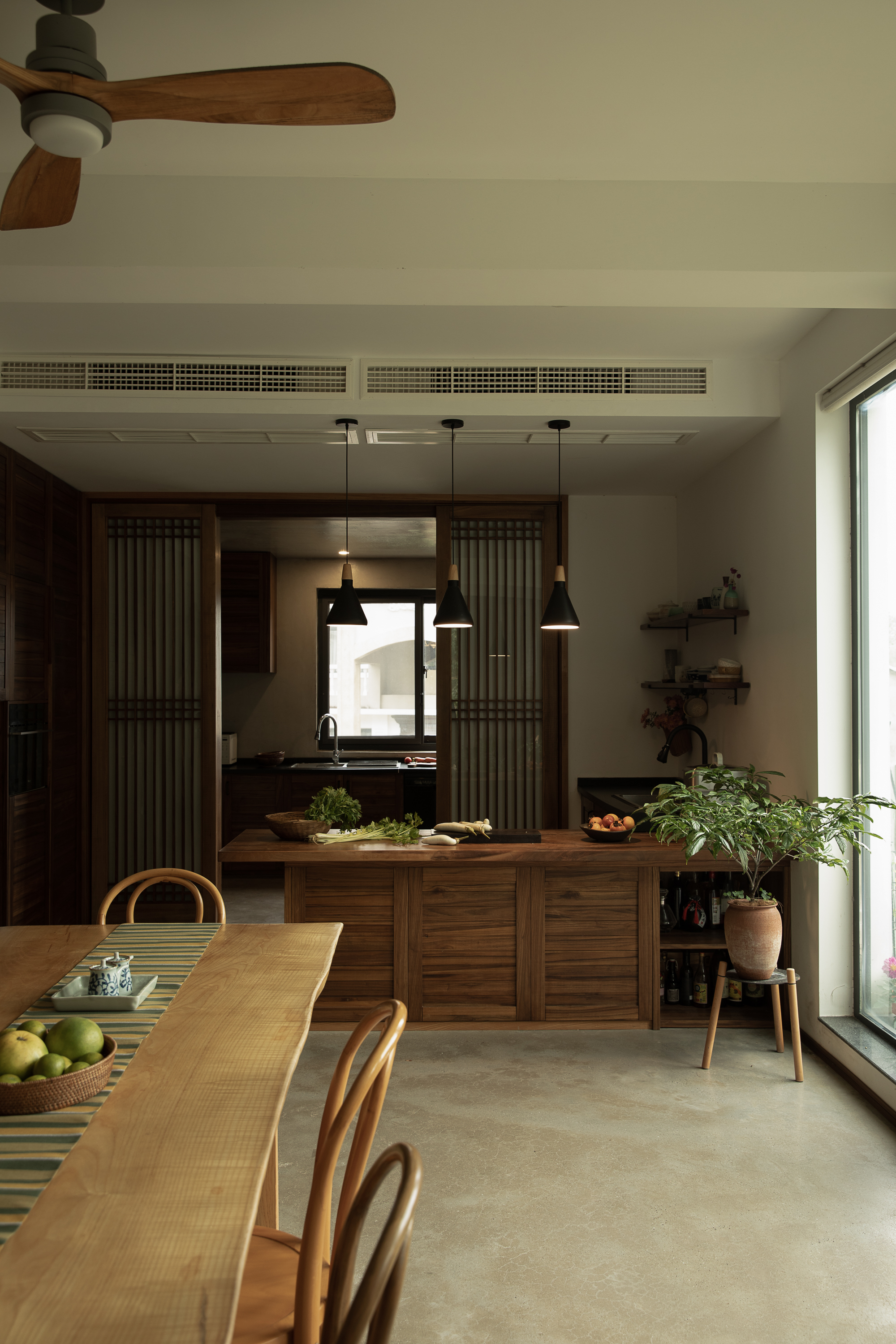 기존 건물은 어두운 아메리칸 타운하우스 구조로, 방들이 단절되고 채광이 부족했다. 건축가는 이를 과감히 뜯어내고 개방성과 흐름, 미니멀한 외관으로 재구성했다. 여기서 중요한 전략은 기능을 고정하지 않는 공간 구성이다. ‘거실’, ‘서재’ 같은 명칭 대신, 상황에 따라 명상이 가능하고, 차를 마시거나 손님을 맞는 공간으로 변화할 수 있는 ‘장면 기반의 공간(scene-based flexibility)’을 제안한다. 계단참과 복도 주변의 여유 공간은 거주자의 해석에 따라 역할이 달라지며, 집 전체는 느슨하게 연결된 하나의 유기체처럼 작동한다.