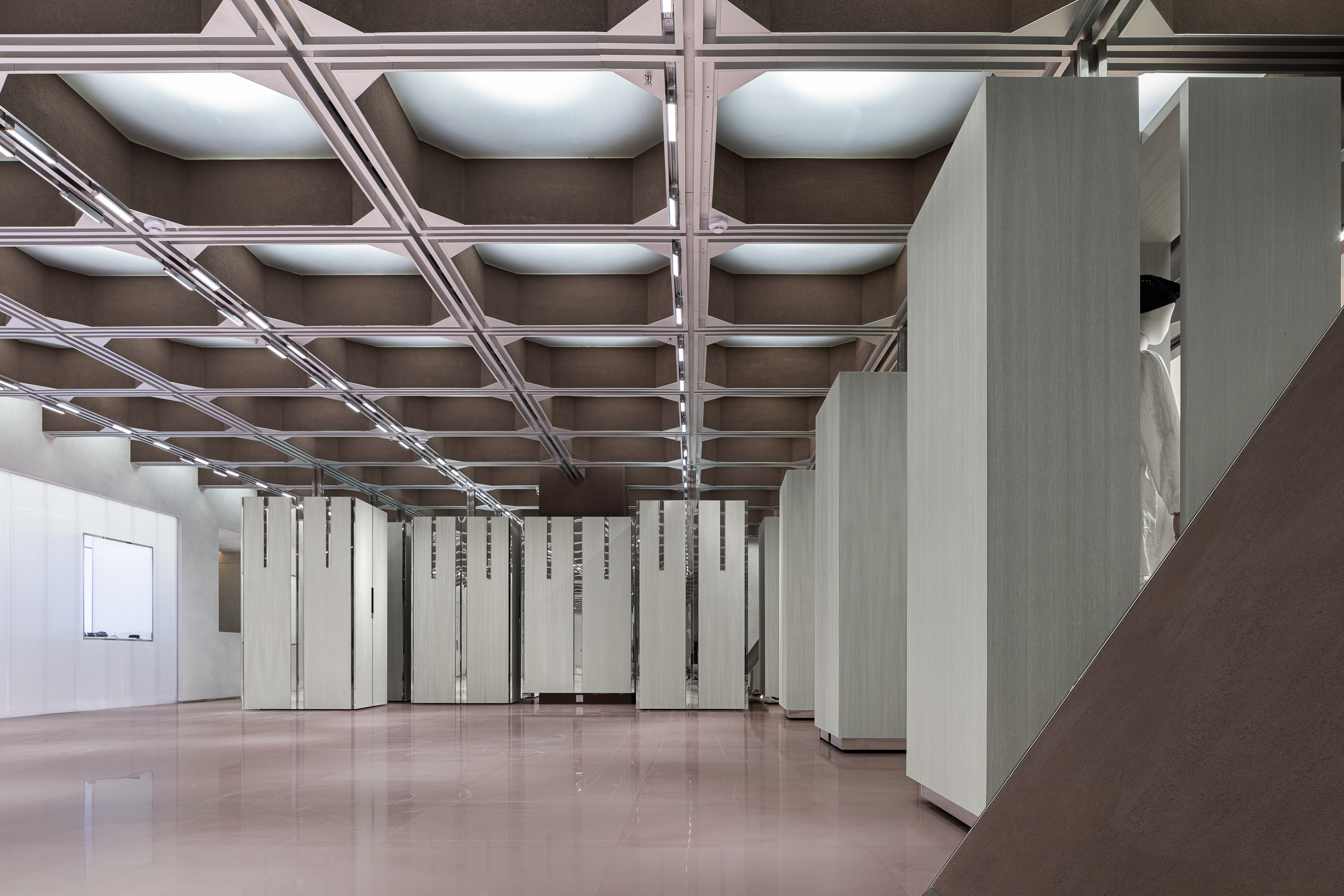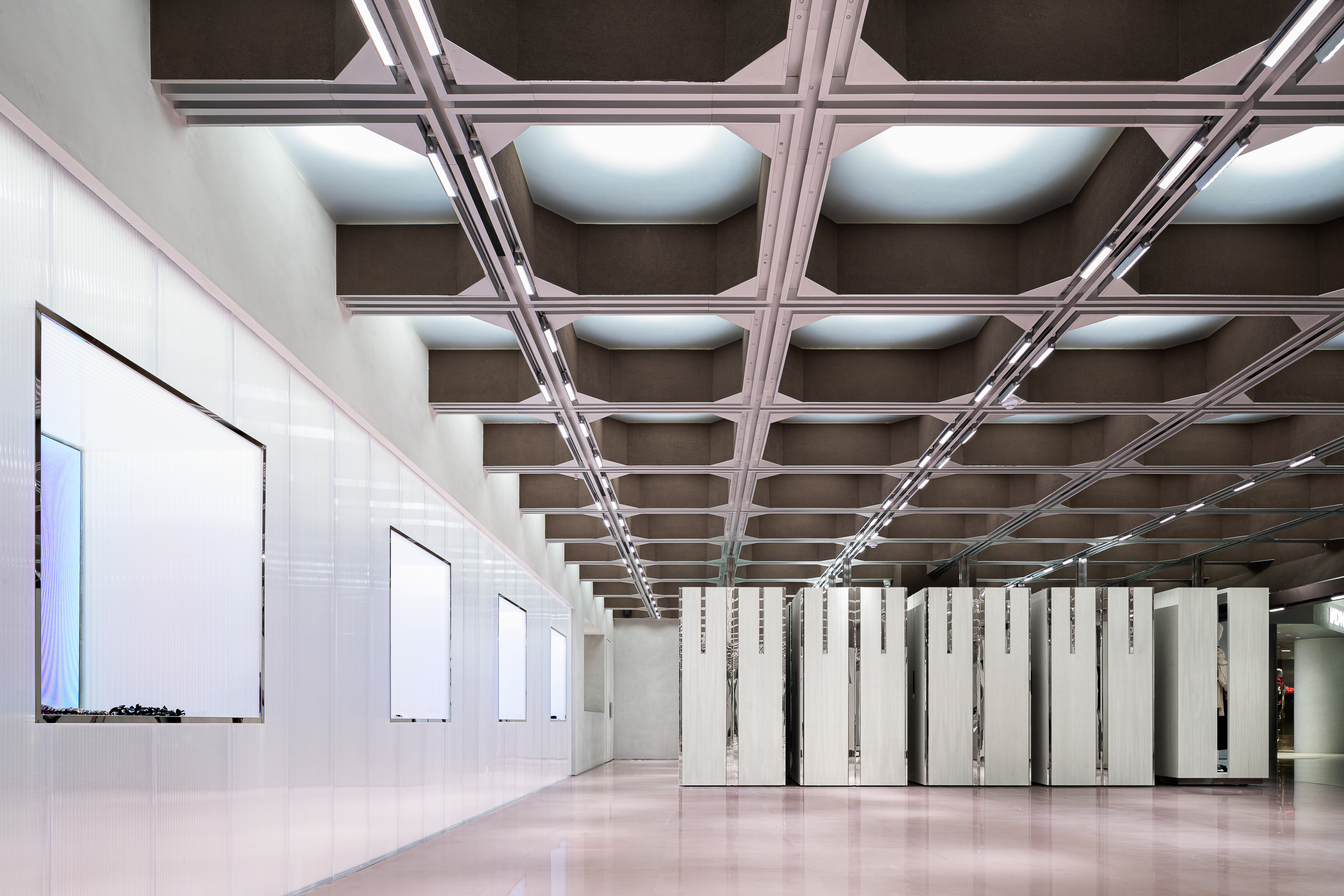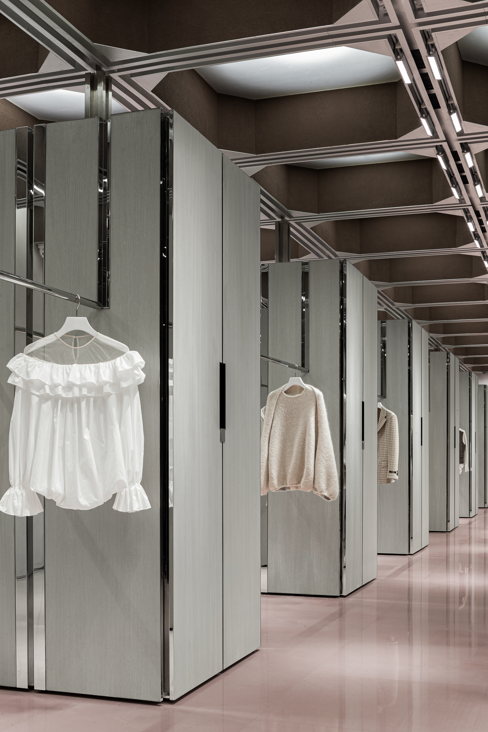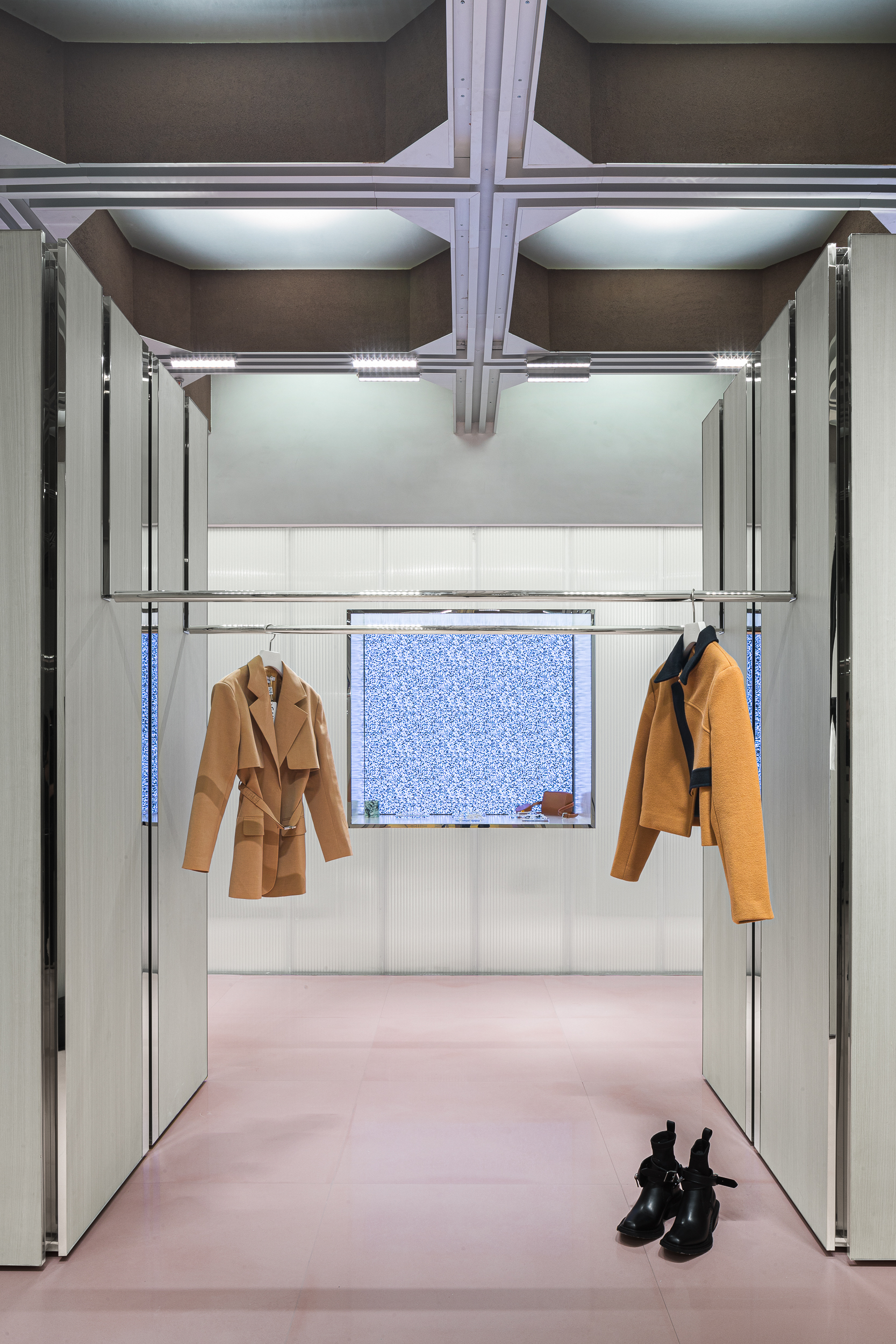 입구에 배치된 네 개의 쇼윈도 박스 또한 여러 방식으로 배열과 결합이 가능해, 이벤트·시즌·브랜드에 따라 완전히 다른 파사드 이미지를 만든다. 공간의 끝에는 ‘거울로 구성된 세계’가 놓여 있다. 거울은 높게 솟은 건축 밀집지 사이를 걷는 듯한 착시를 만들며, 사용자를 끝없이 이어지는 연속적 공간 안으로 끌어들인다.