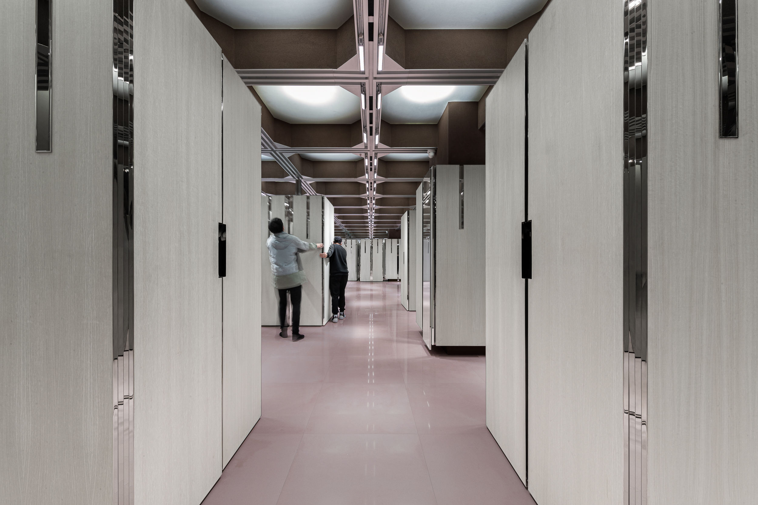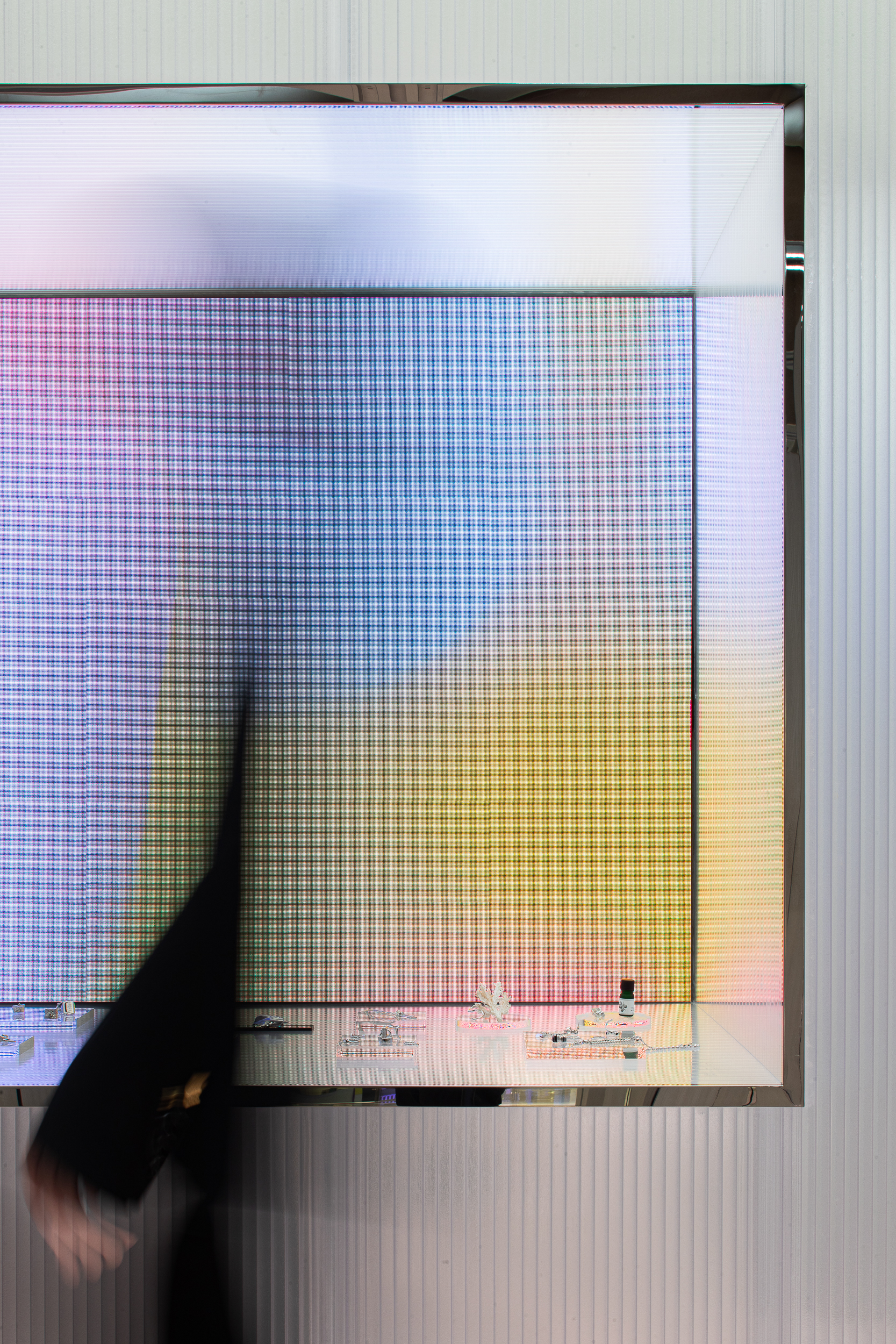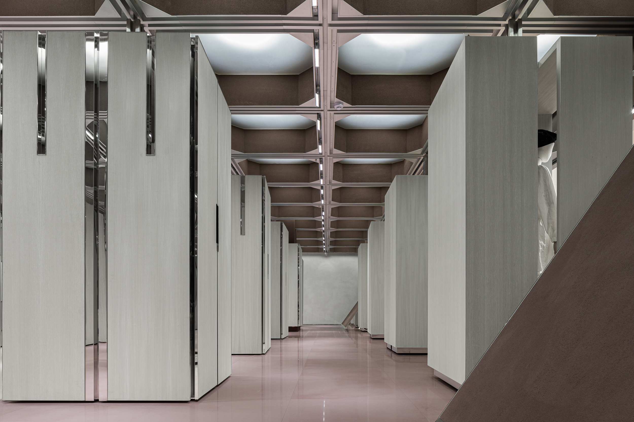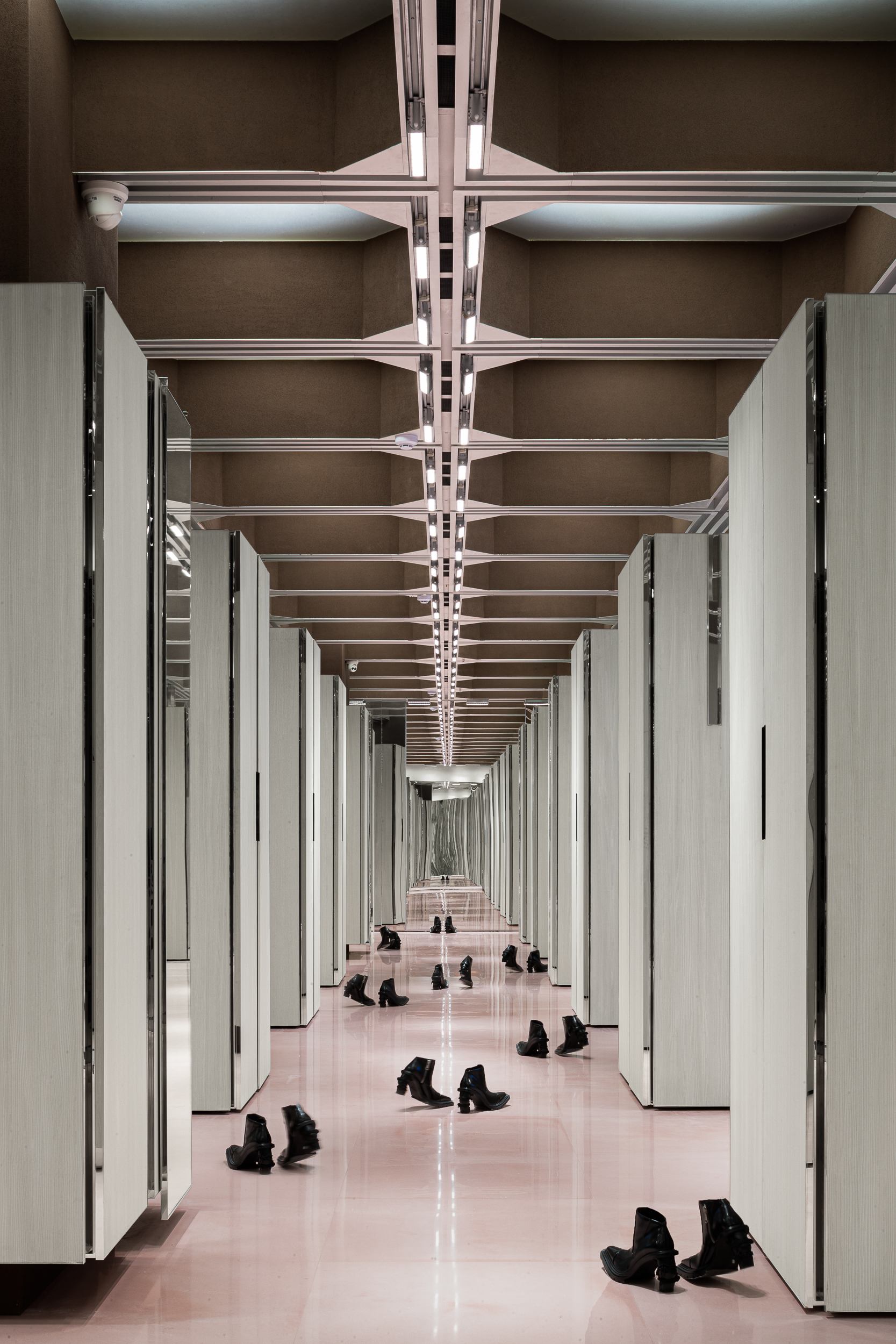 입구에 배치된 네 개의 쇼윈도 박스 또한 여러 방식으로 배열과 결합이 가능해, 이벤트·시즌·브랜드에 따라 완전히 다른 파사드 이미지를 만든다. 공간의 끝에는 ‘거울로 구성된 세계’가 놓여 있다. 거울은 높게 솟은 건축 밀집지 사이를 걷는 듯한 착시를 만들며, 사용자를 끝없이 이어지는 연속적 공간 안으로 끌어들인다.