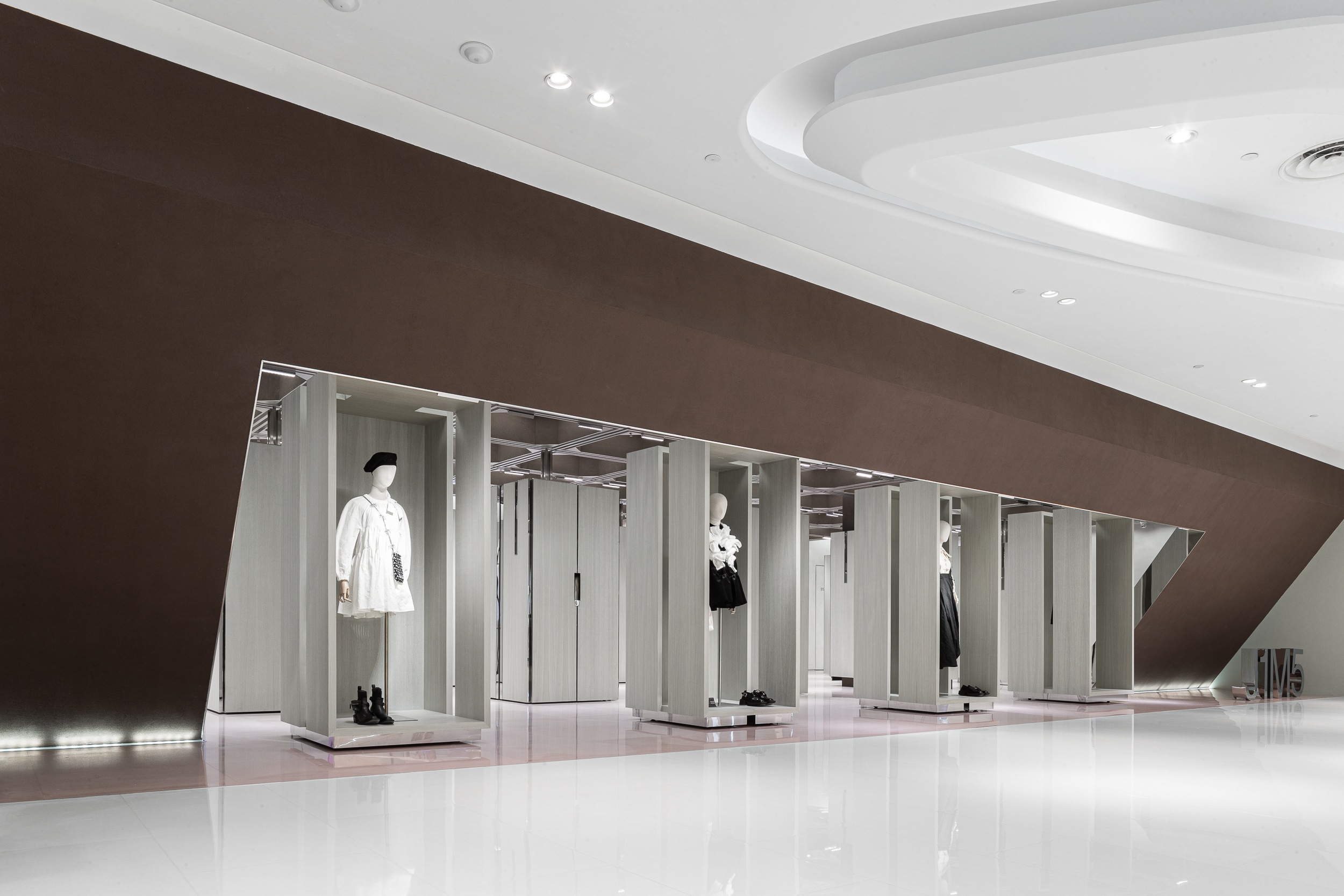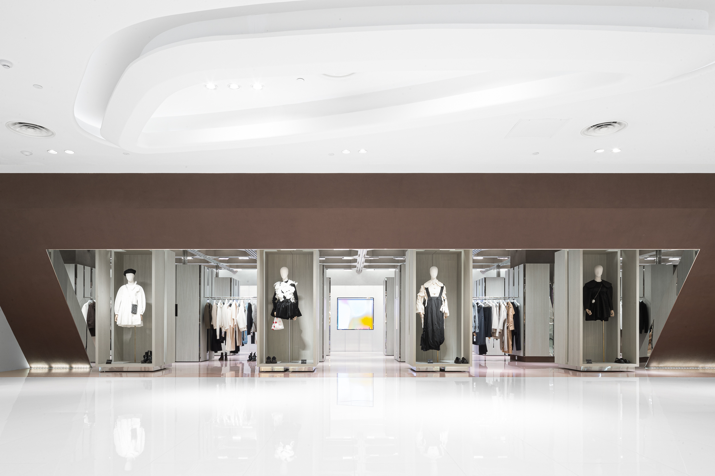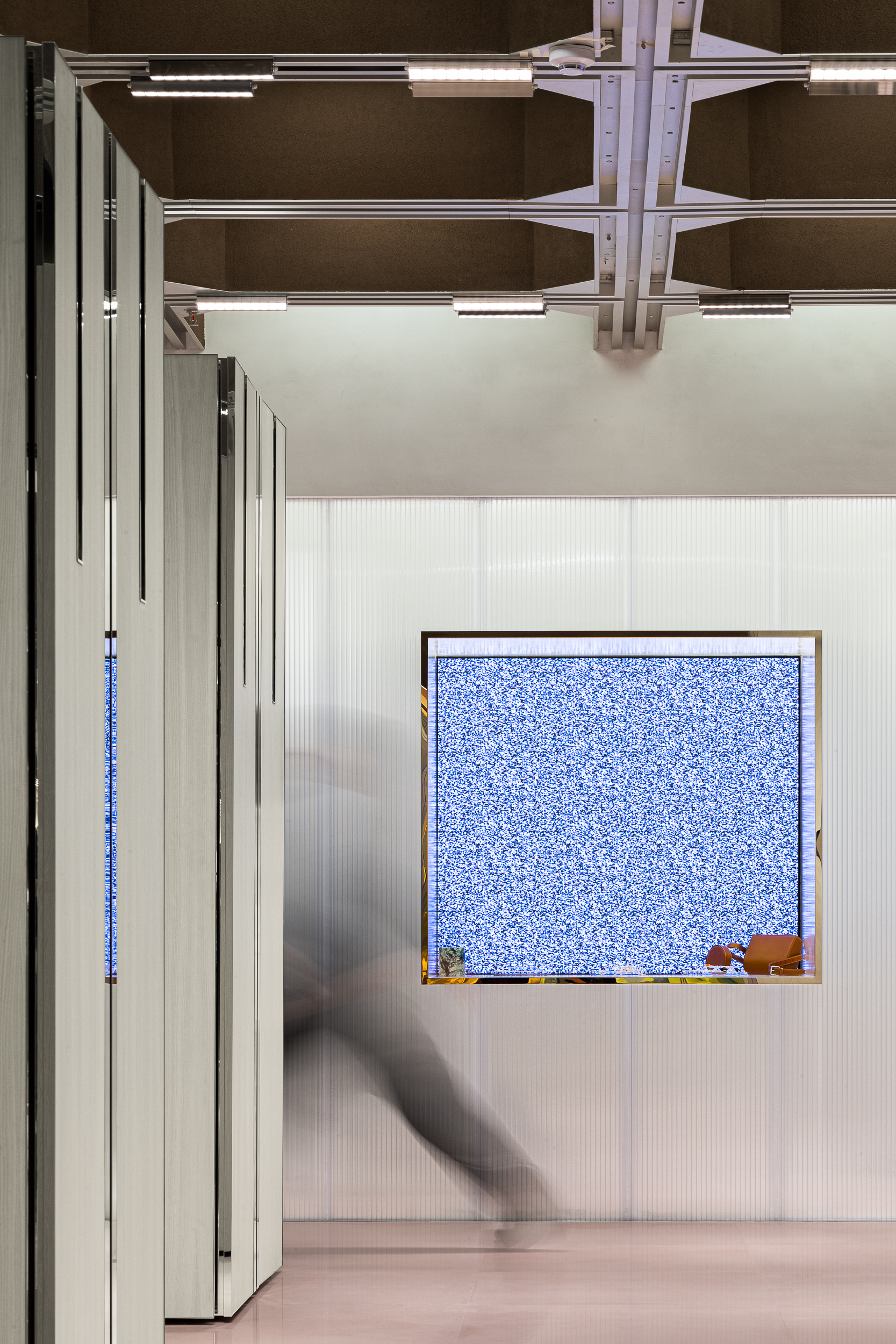 입구 정면에는 액세서리와 가방을 위한 전시 존이 놓여 있으며, LED 스크린이 배경으로 삽입되어 브랜드 이미지와 비주얼을 유연하게 교체할 수 있다.