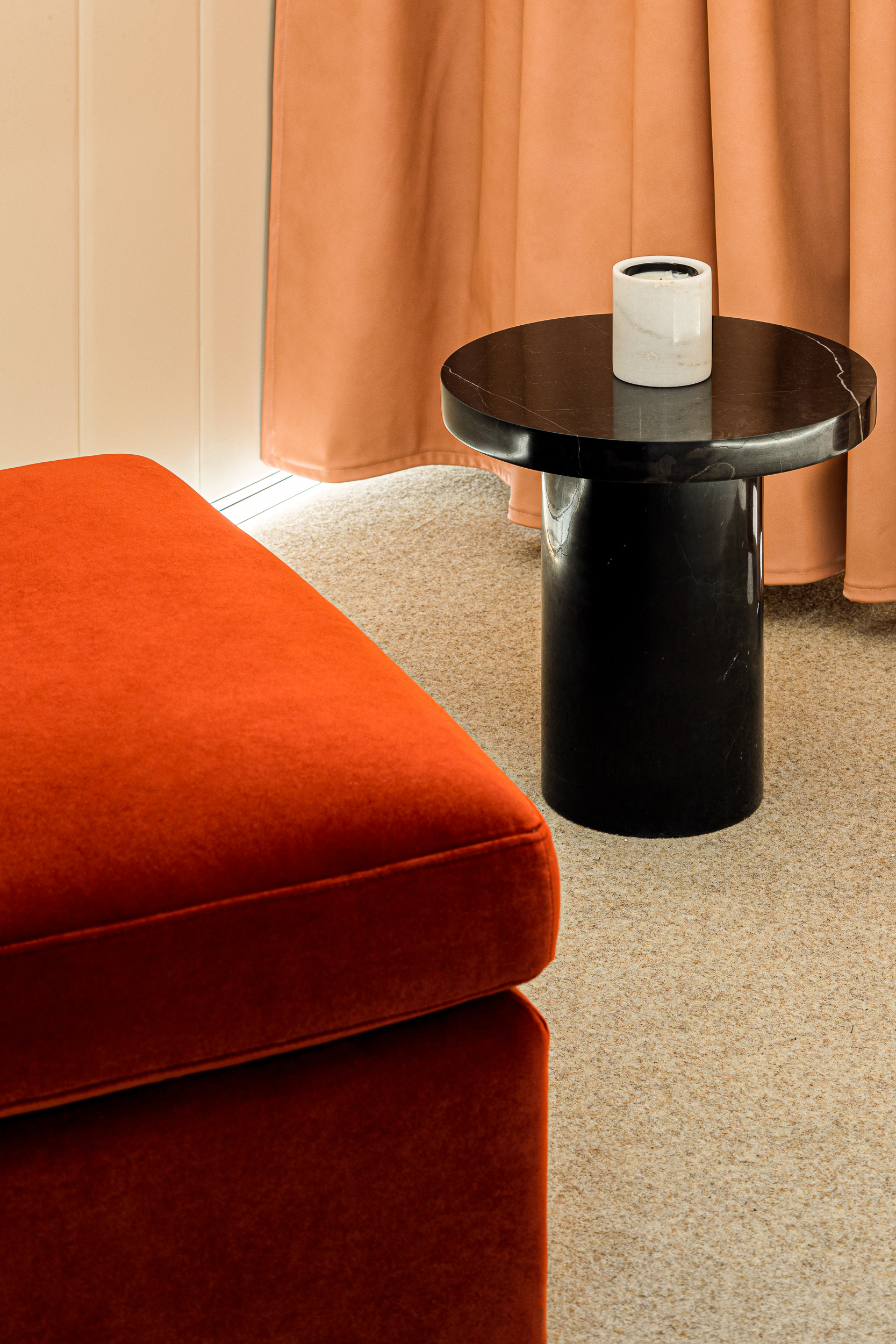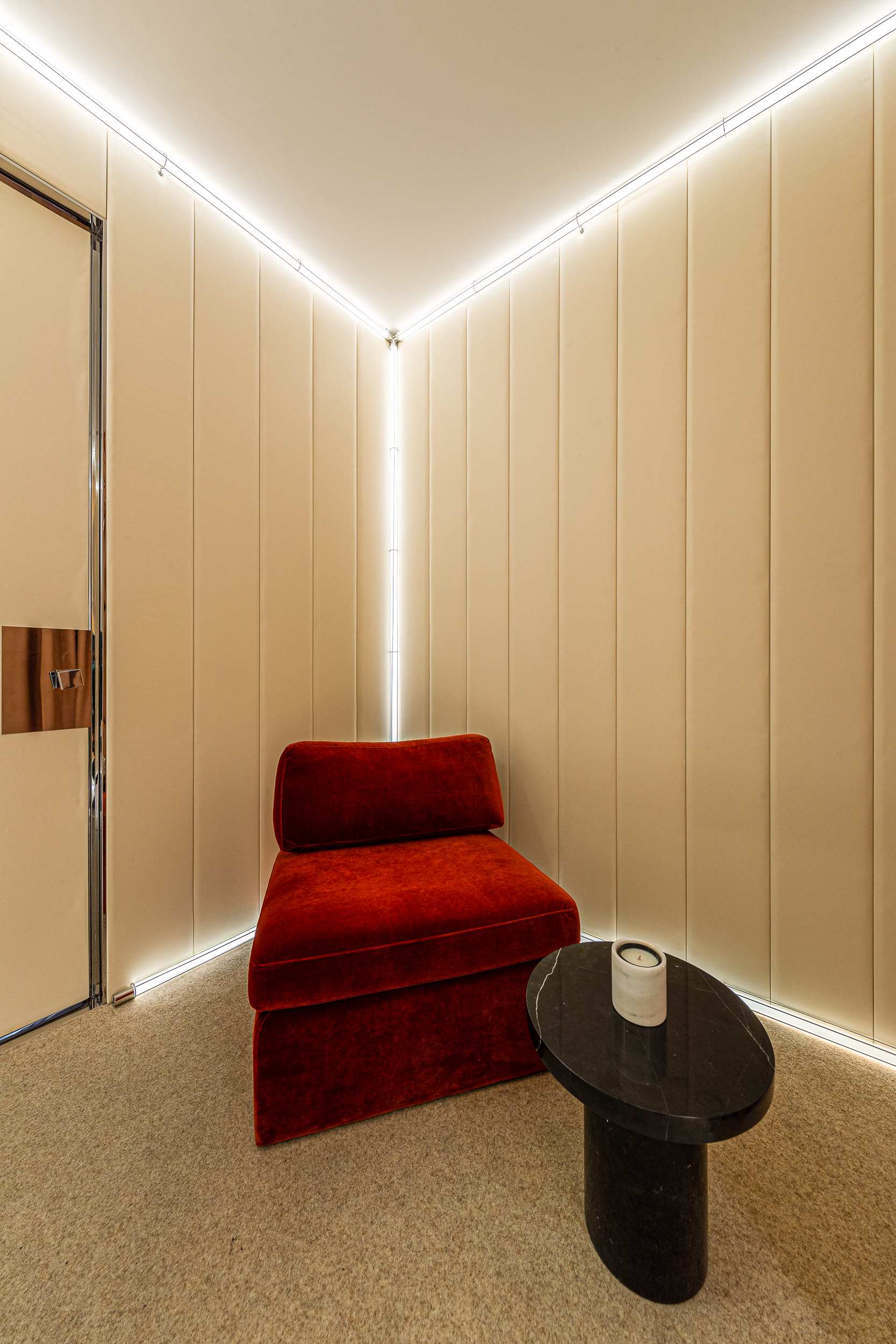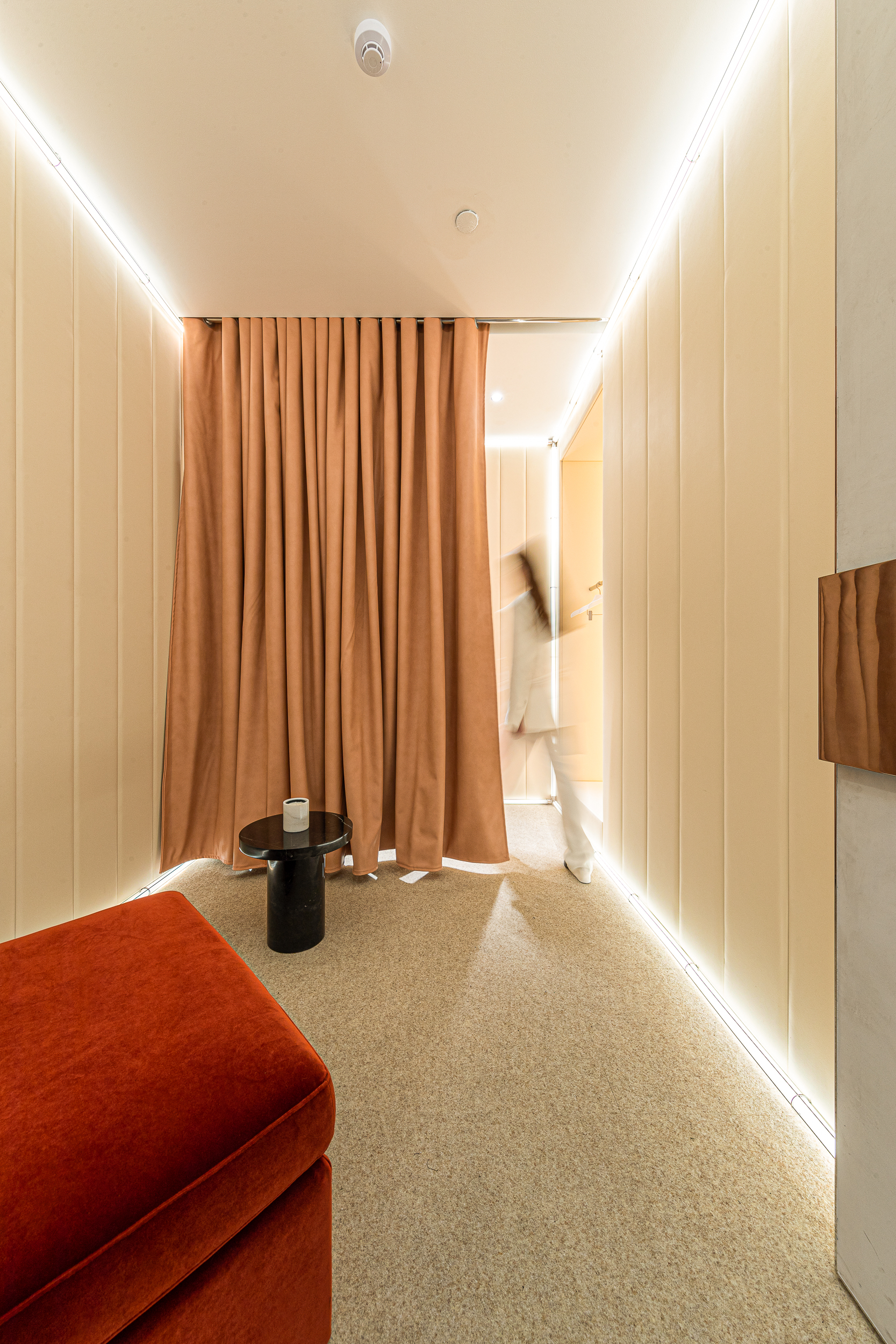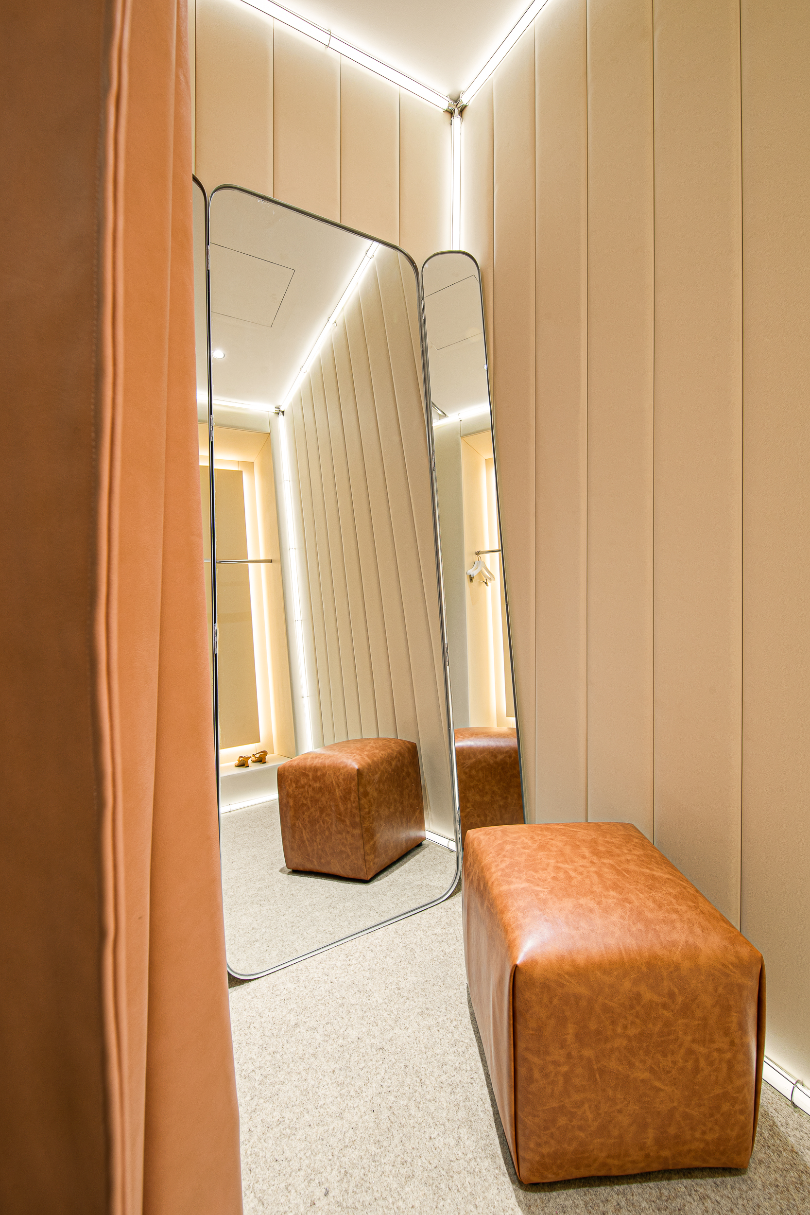 외부와 완전히 다른 분위기를 의도한 VIP 피팅룸은 은은한 웜 옐로 톤과 섬세한 조명으로 윤곽을 드러내며, 부드럽고 안락한 방처럼 연출했다. 편안함과 은밀함, 고급스러운 질감이 동시에 느껴지는 캡슐 같은 공간이다.