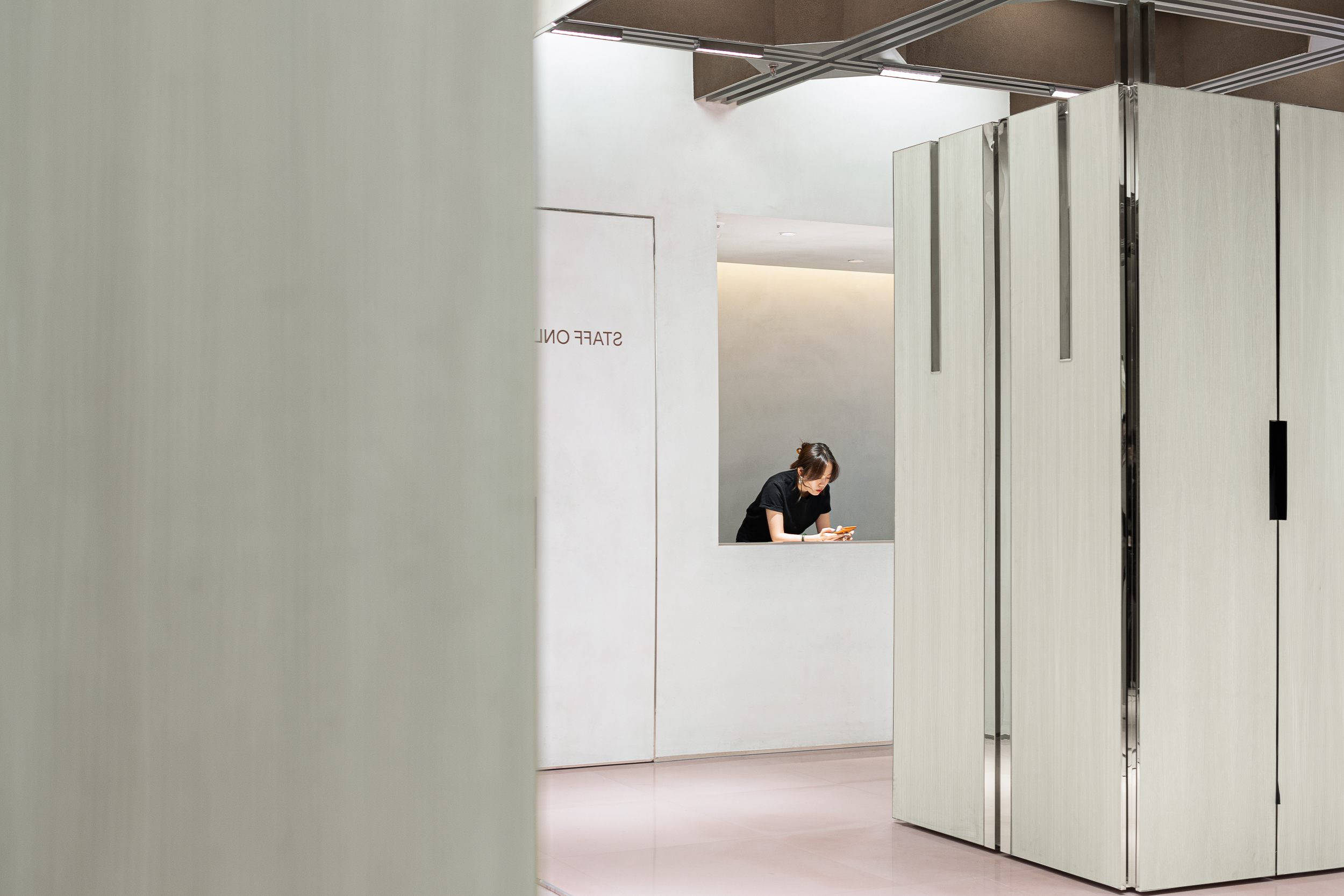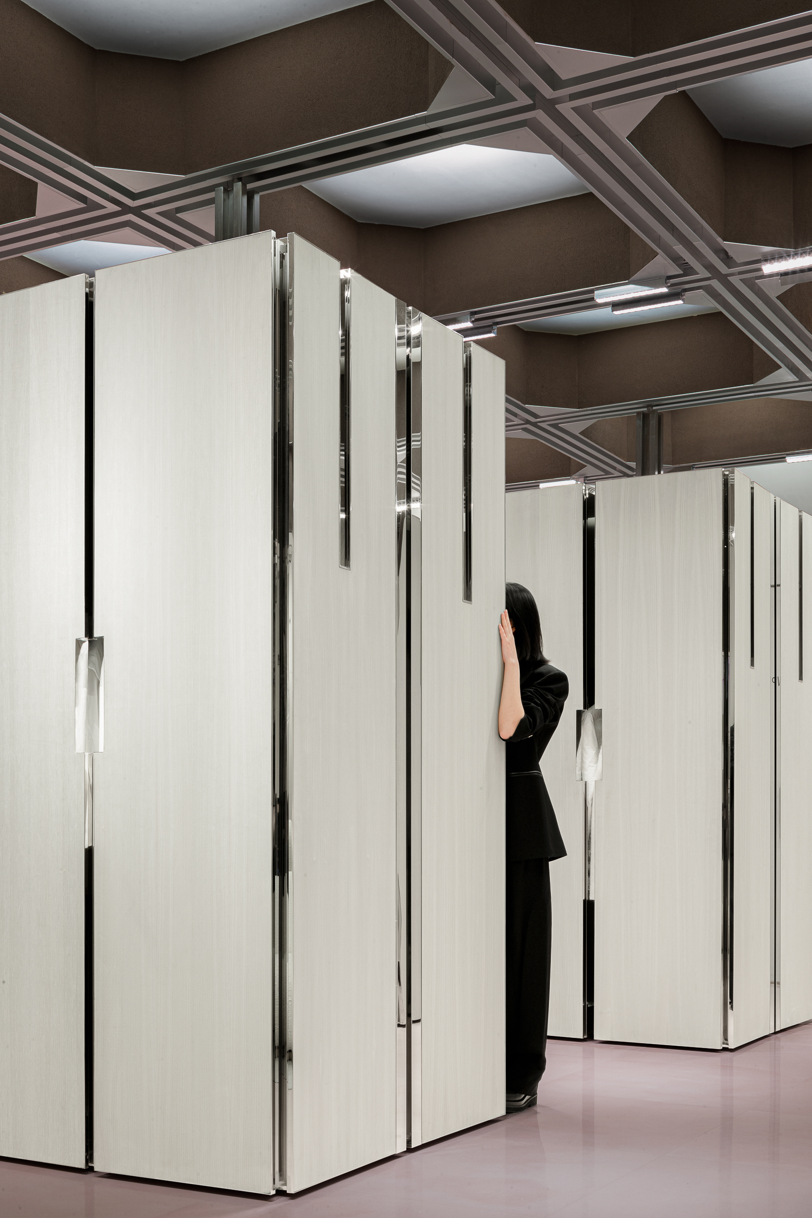 캐비닛이 닫혀 있을 때, 바깥쪽 양 옆면에는 스테인리스 행거를 걸 수 있어 전시 면적을 최대화한다. 내부는 수납 공간으로 사용해, 전시와 저장 기능을 한 몸체 안에서 효율적으로 결합했다. 이 상태에서 공간은 마치 규칙적으로 서 있는 기둥의 숲처럼 보이며, 구조 그 자체가 강한 리듬감을 만든다.
