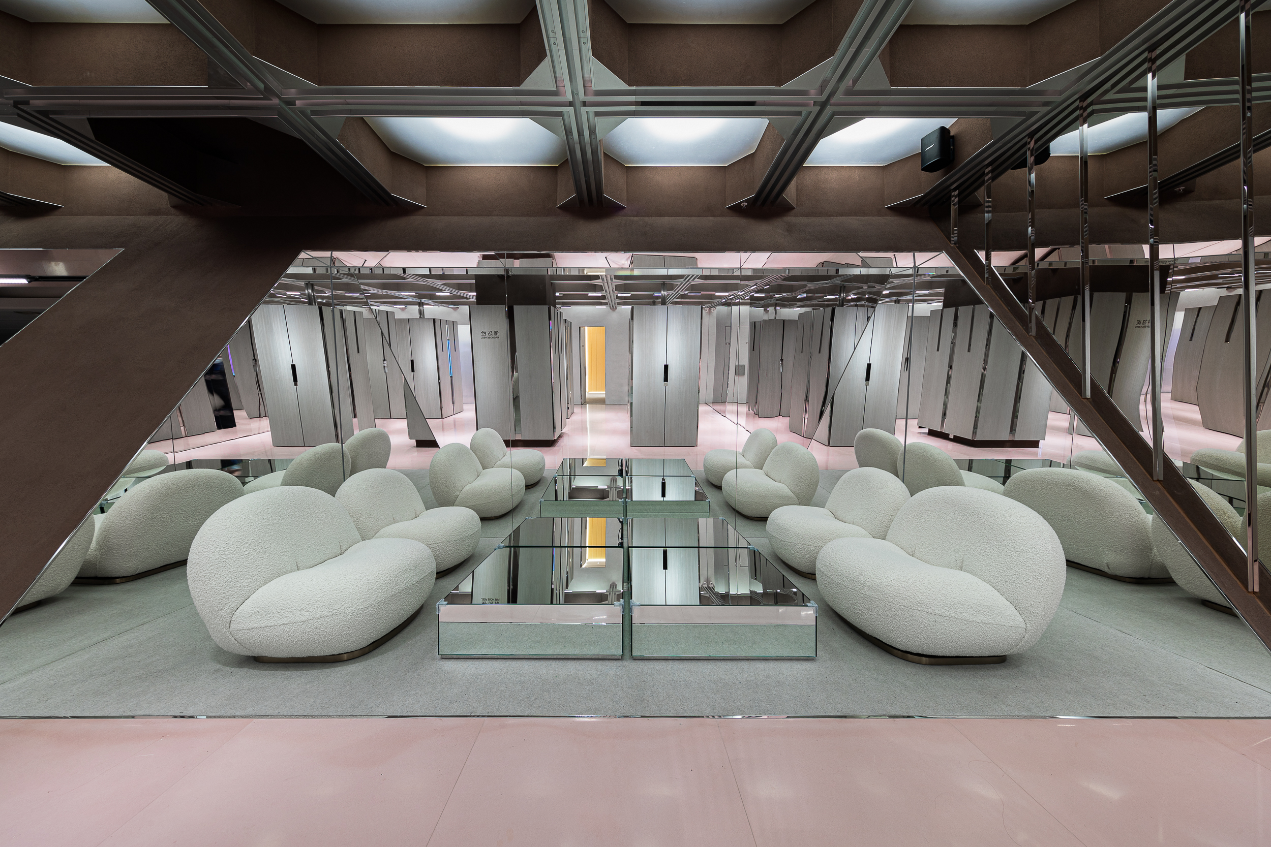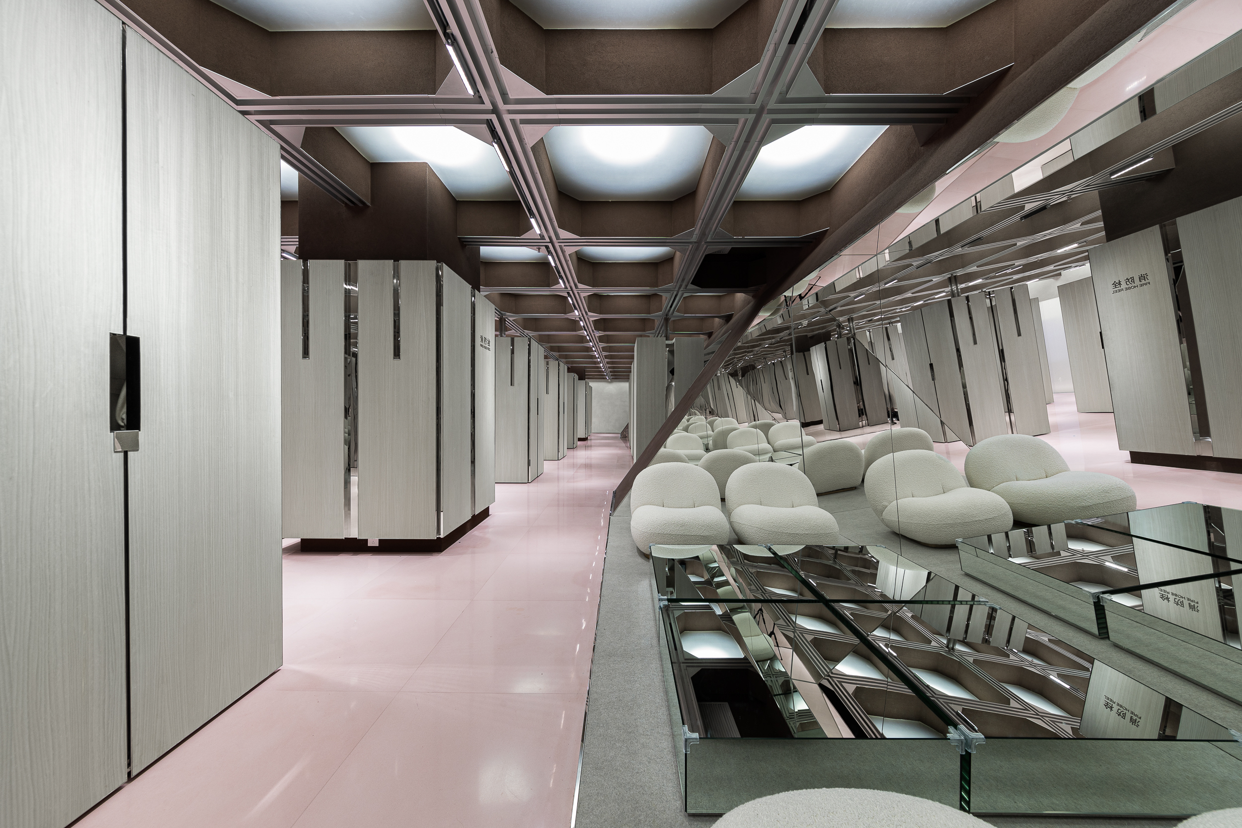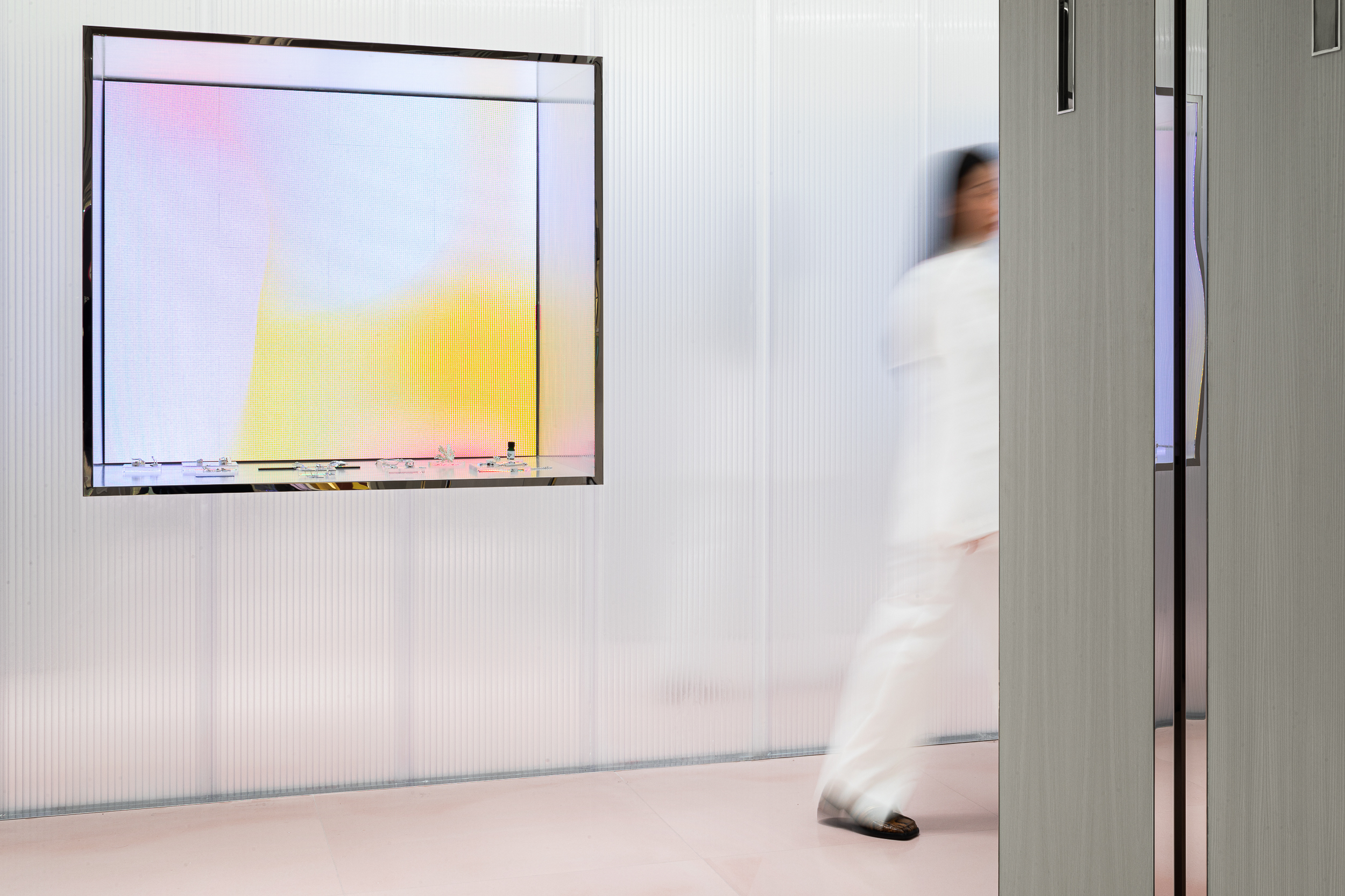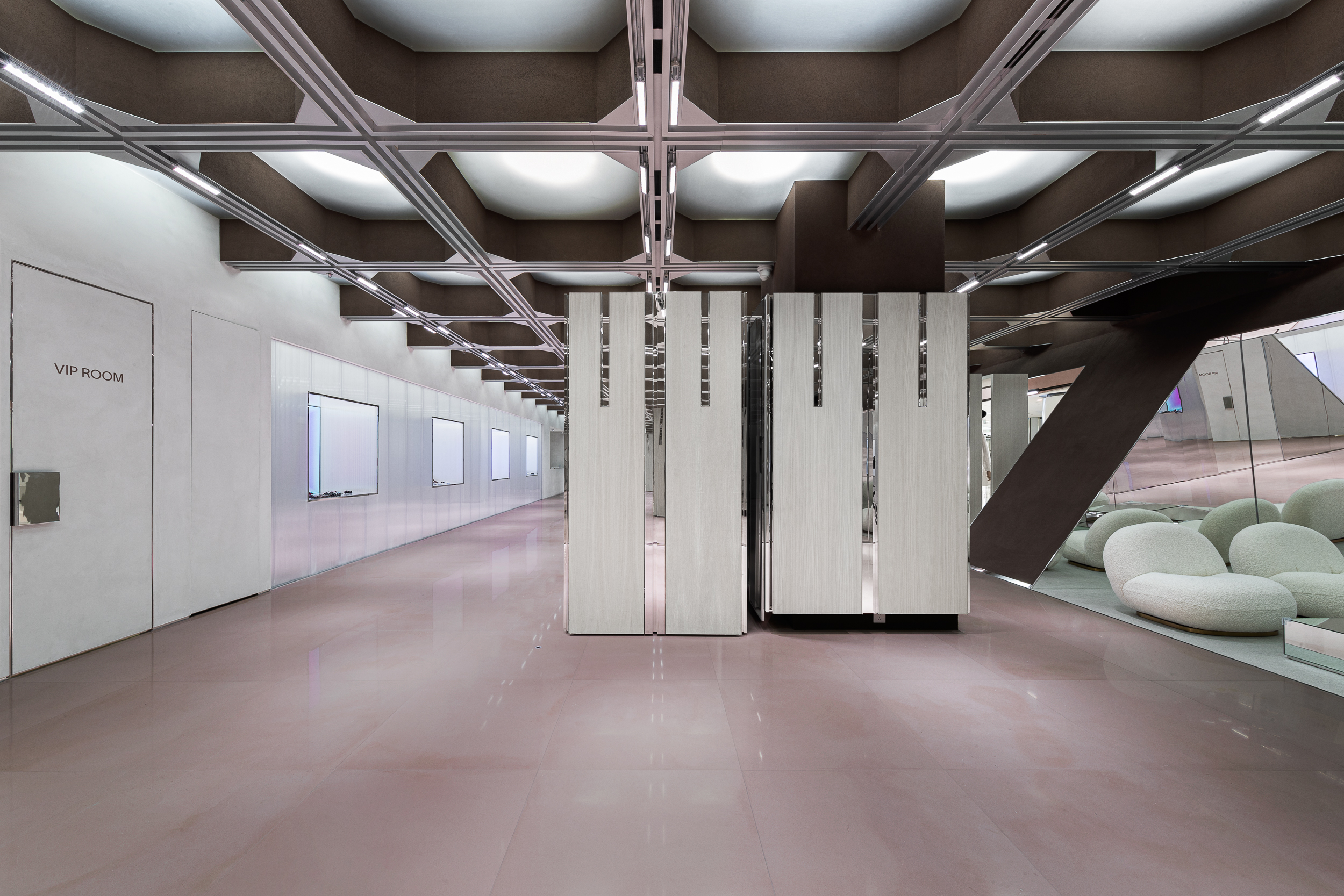 입구의 사선 벽은 내부로 들어오면서 작은 라운지·전시 구역을 형성한다. 이곳에는 향 제품, 아트 오브제 등을 전시할 수 있고, 반사 거울과 은은한 천장 조명을 통해 다차원적인 몽환 공간처럼 연출했다. 현실과 환상이 겹쳐지는 장면을 의도한 구성이다.