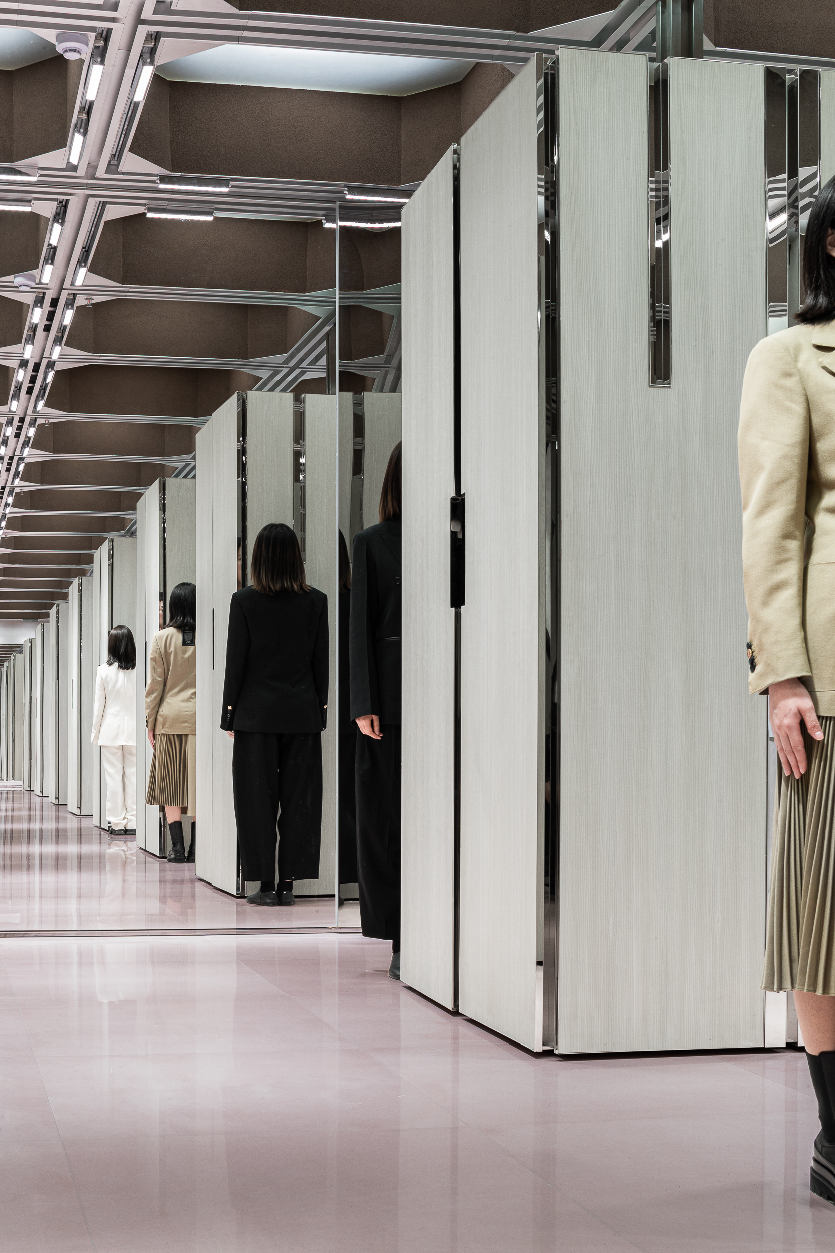 캐비닛을 열면 내부가 온전히 전시 공간이 된다. 가방, 의류, 신발을 세트로 연출해 두어, 고객이 코디 전체를 직관적으로 파악하고 선택할 수 있도록 했다. 이때 공간은 거의 전부 ‘옷장’으로 채워진 듯 보이고, 실용성이 전면에 드러난다.