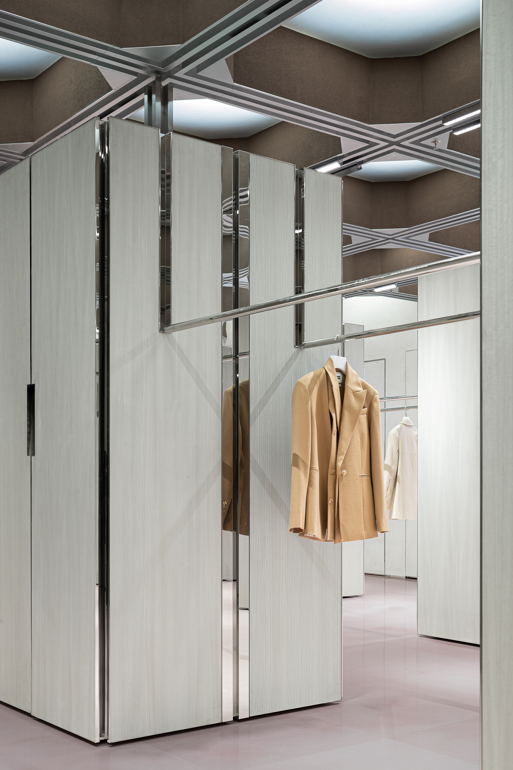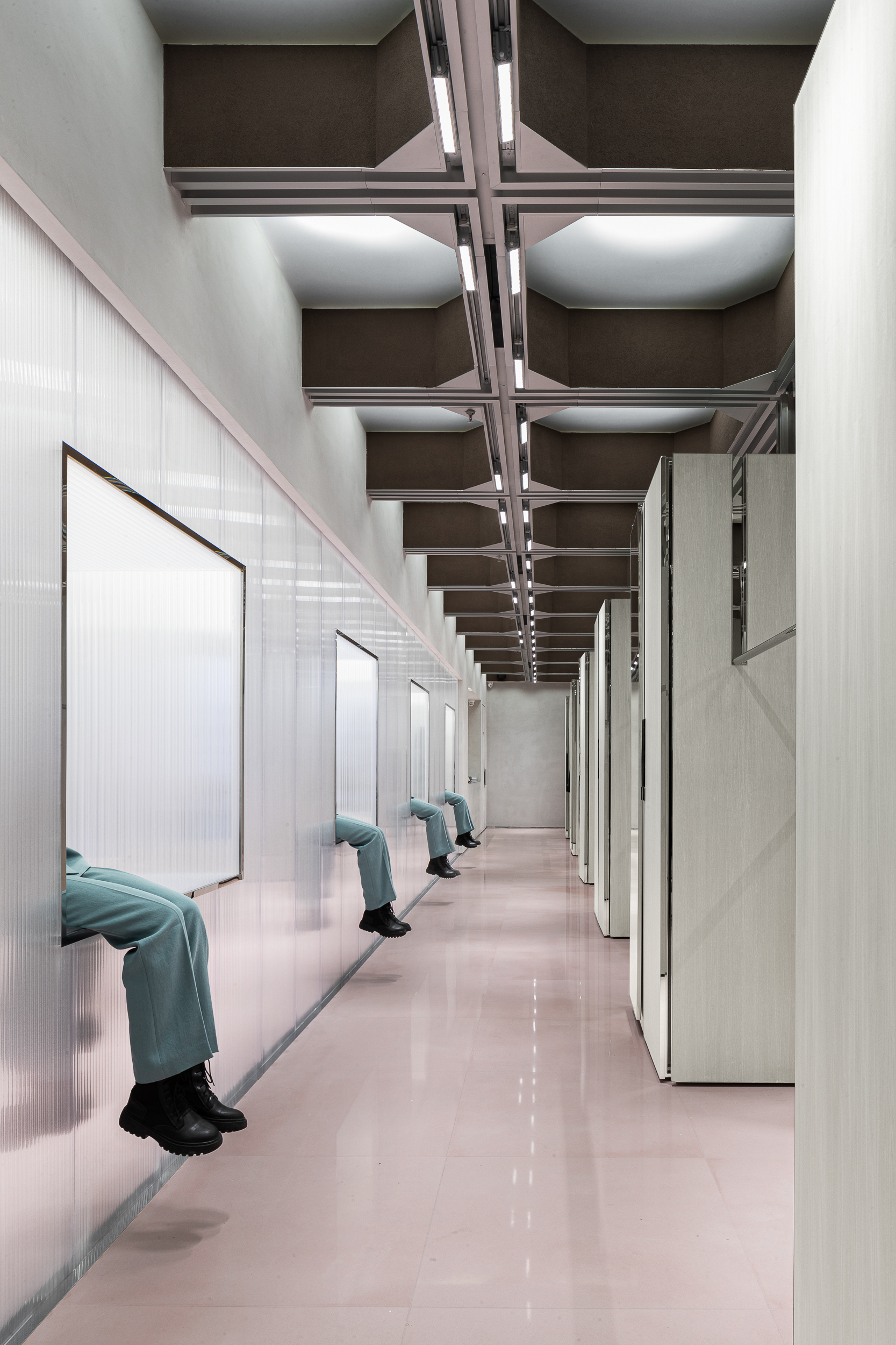 건축가는 이 ‘수트케이스 프로토타입’을 다양하게 확장했다. 기본 박스는 때로는 기둥, 때로는 브래킷, 옷장, 피팅룸, 쇼윈도 등 여러 역할을 겸한다.